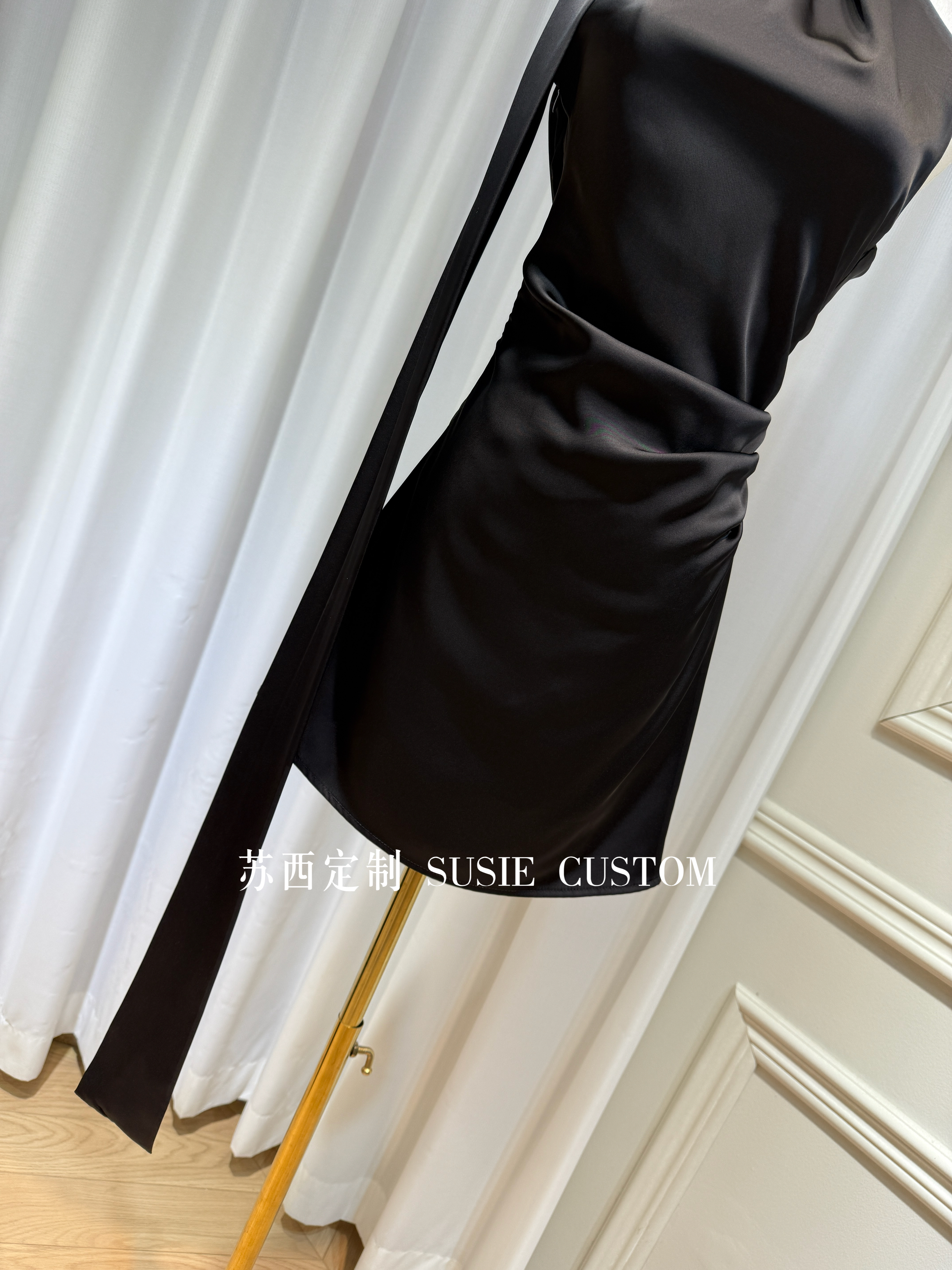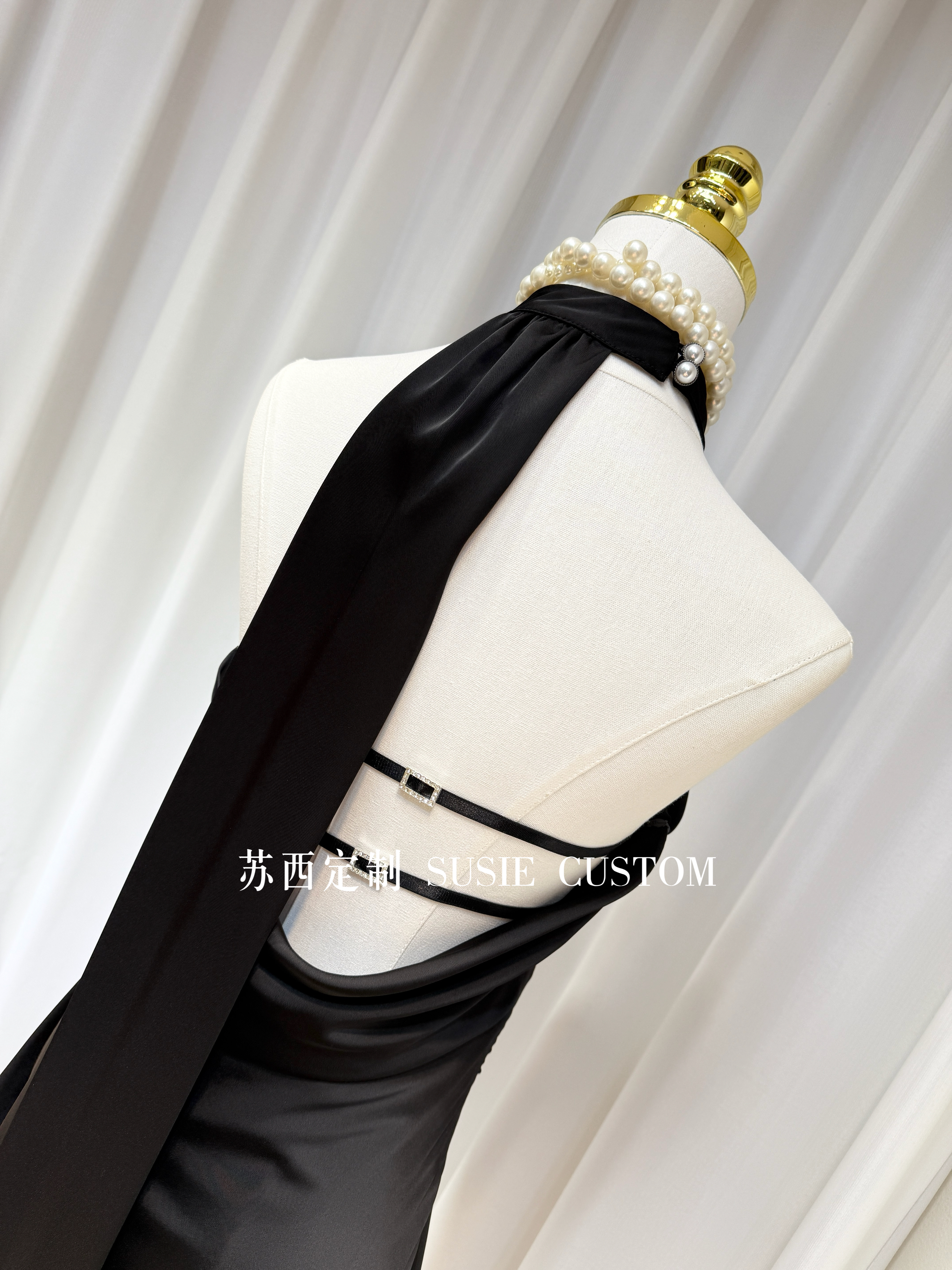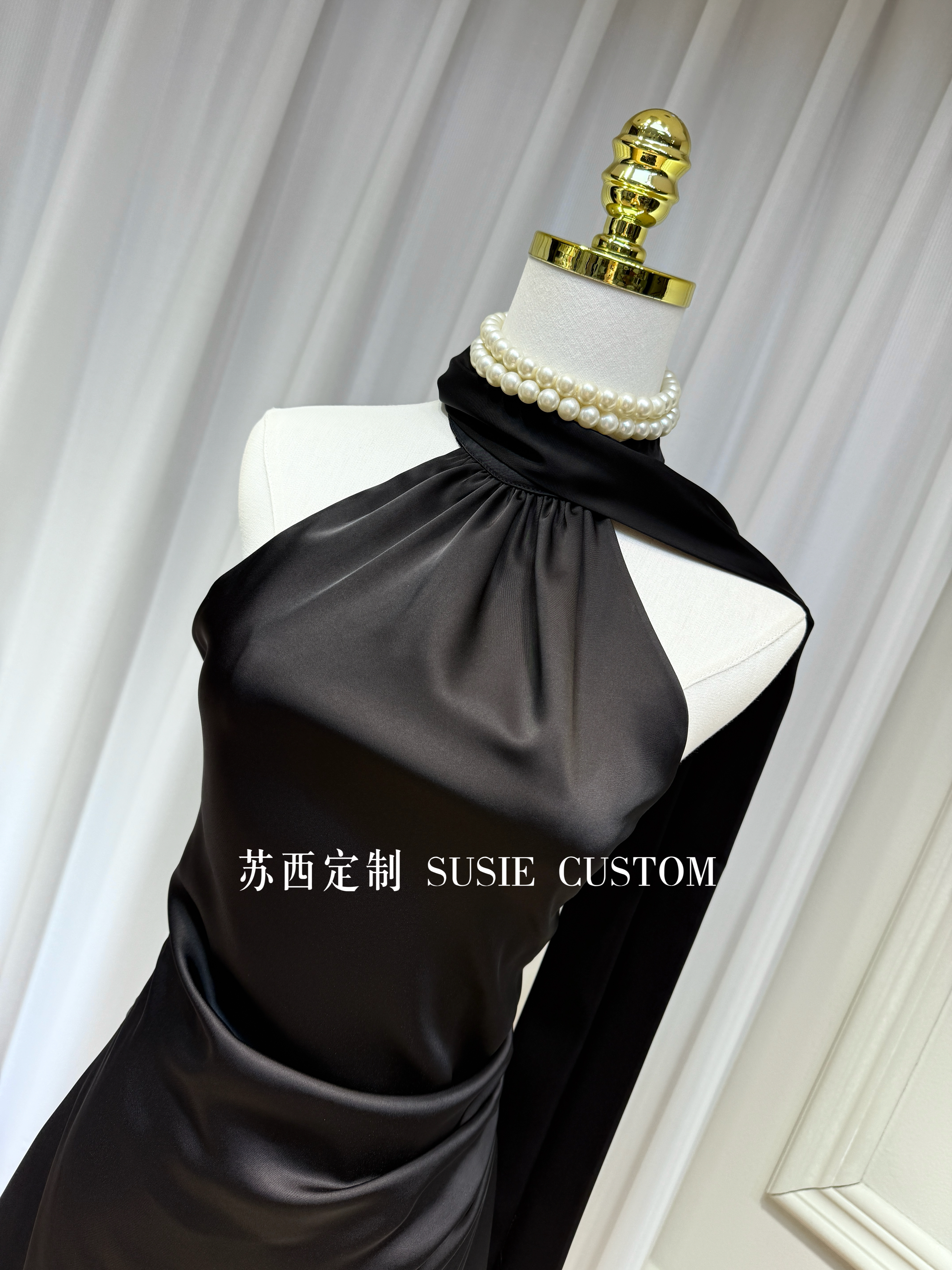 纯欲风小性感挂脖飘带褶皱遮肚子大露背可调节带子修身缎面中长裙