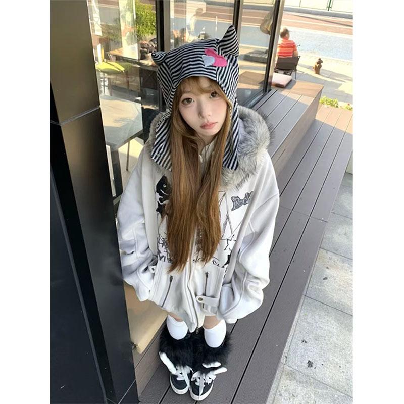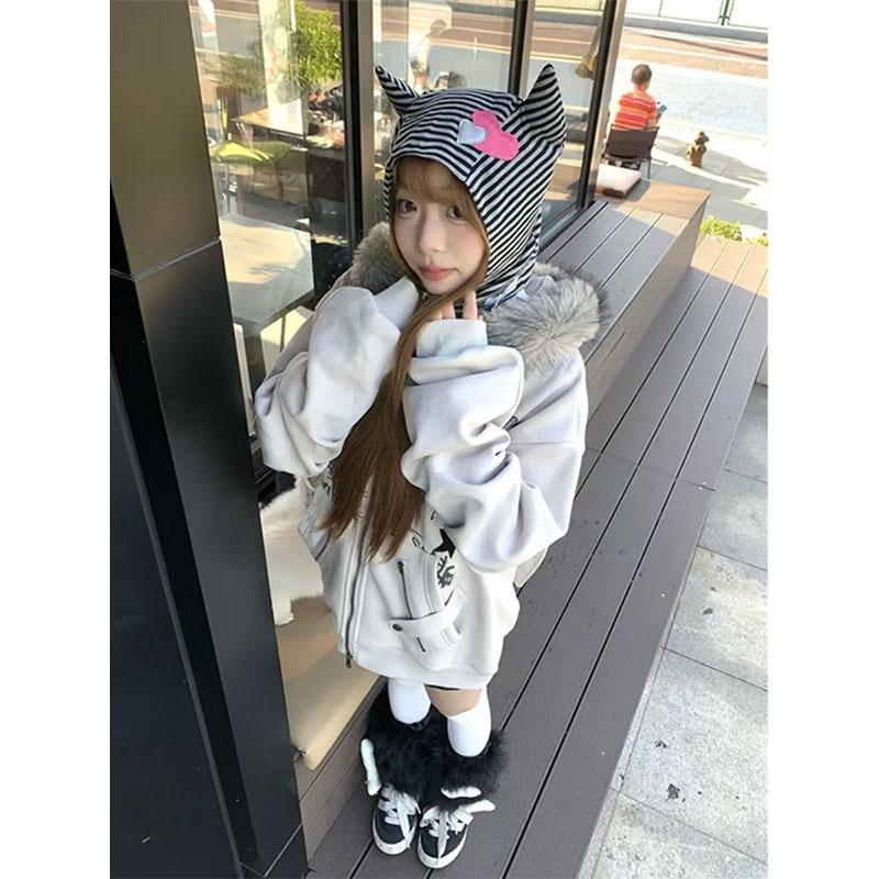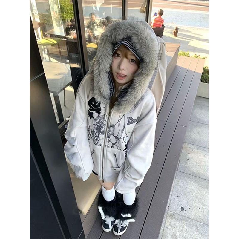 毛领兔耳朵连帽卫衣外套女秋冬季新款加绒加厚宽松设计感小众上衣