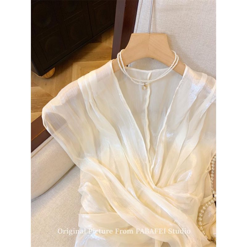 2025新款女夏别致交叉领亚麻衬衫轻熟法式小众下摆不规则薄纱上衣