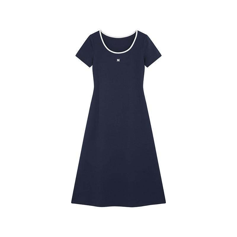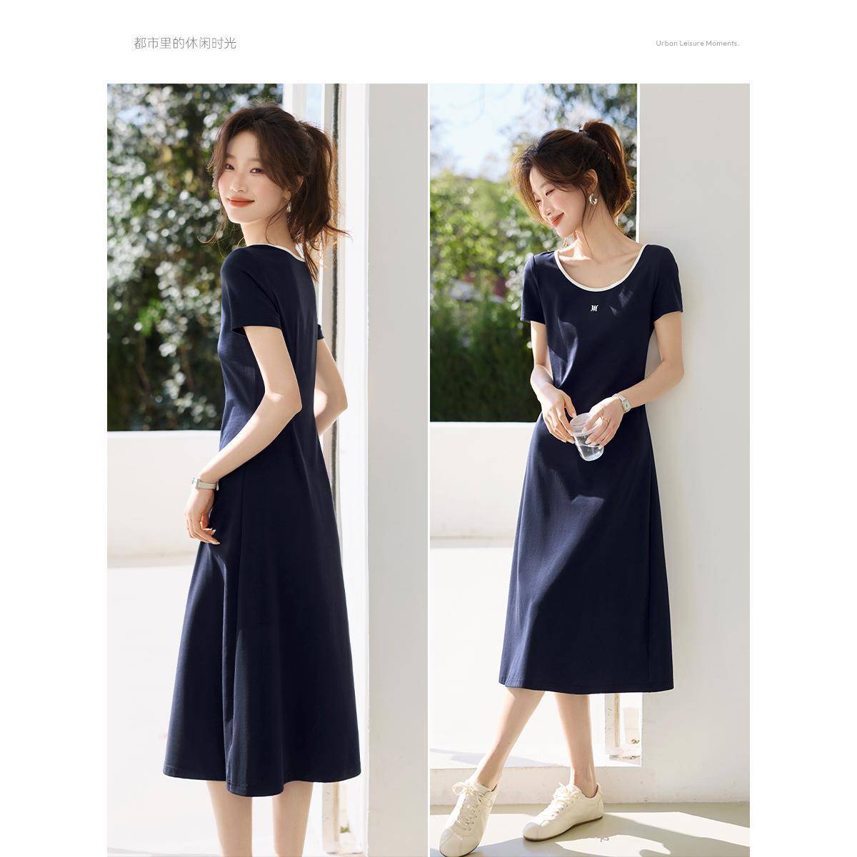 沫晗依美百搭休闲感慵懒大方圆领短袖A字裙2025春季新款连衣裙女