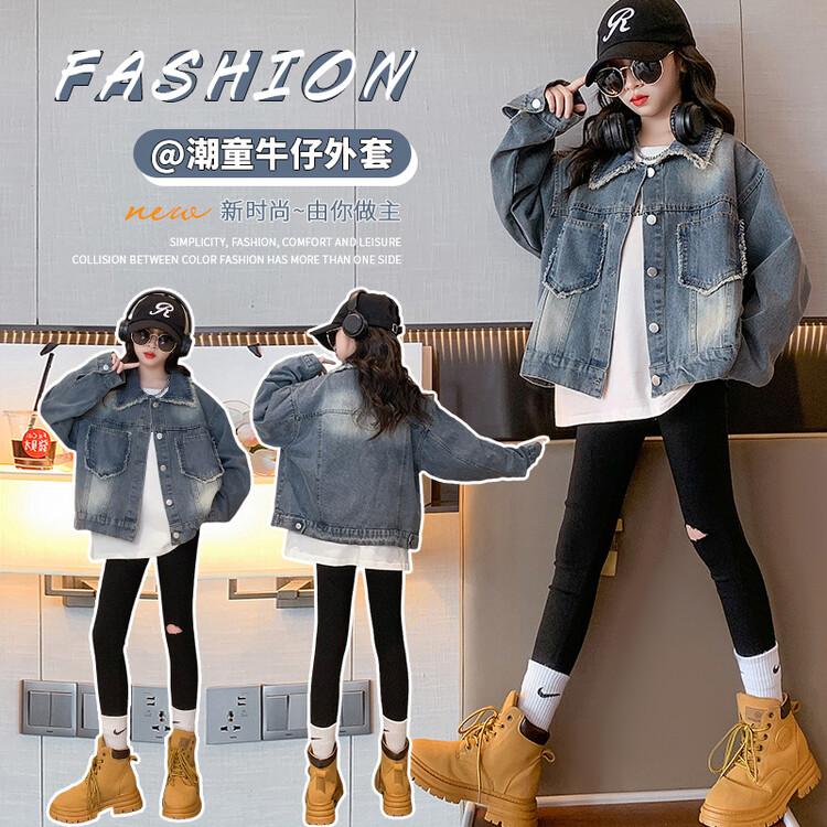 女童春秋外套2024新款复古牛仔衣中大童时髦洋气毛边韩系夹克上衣