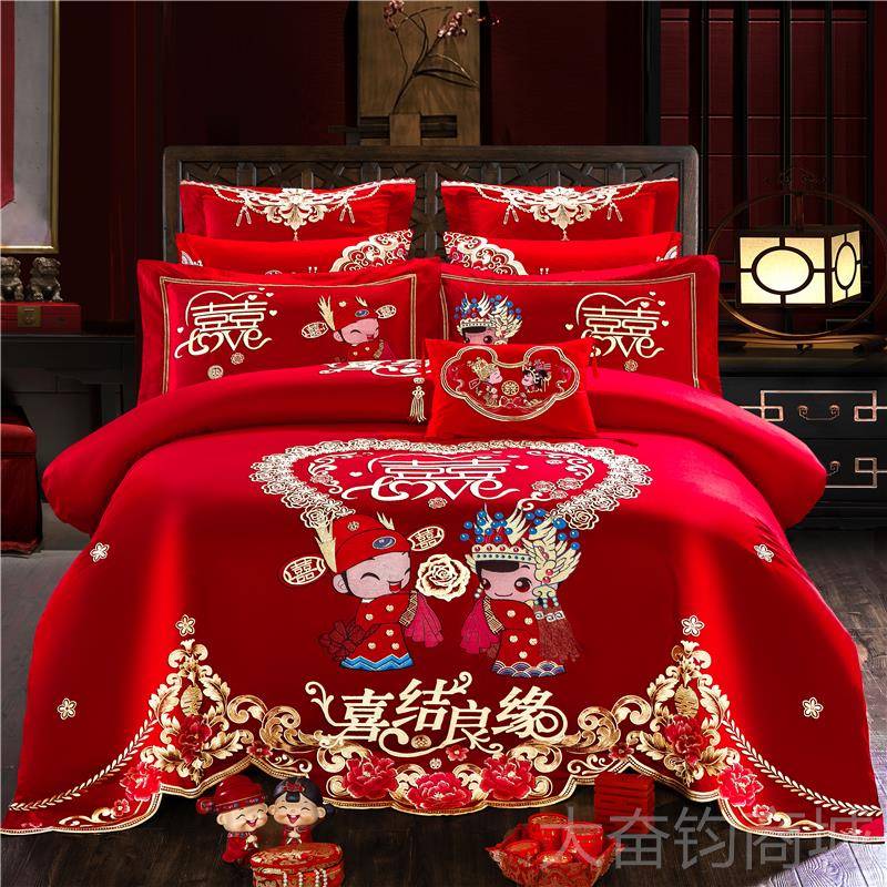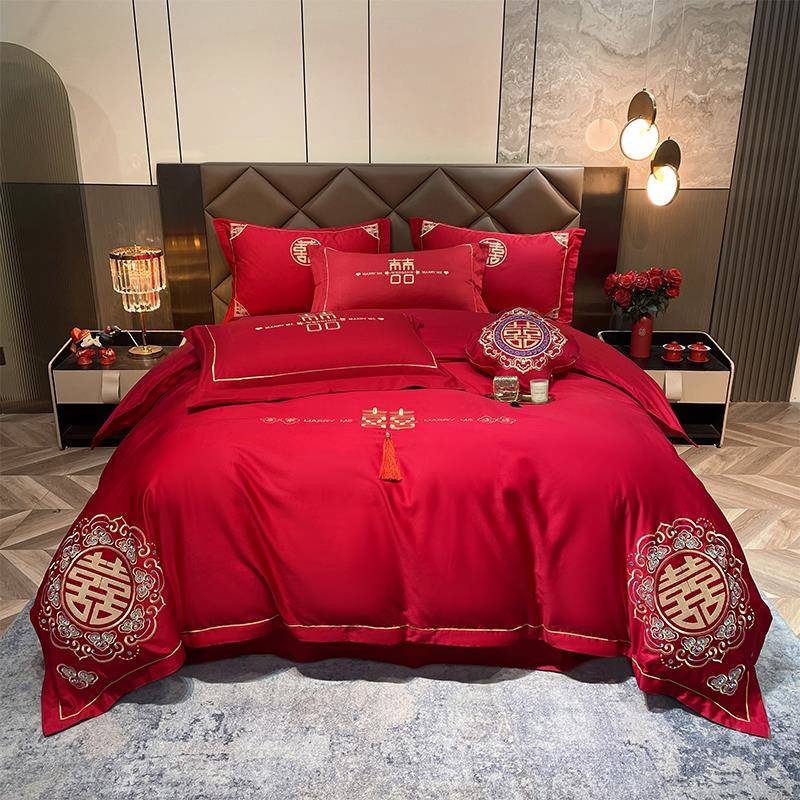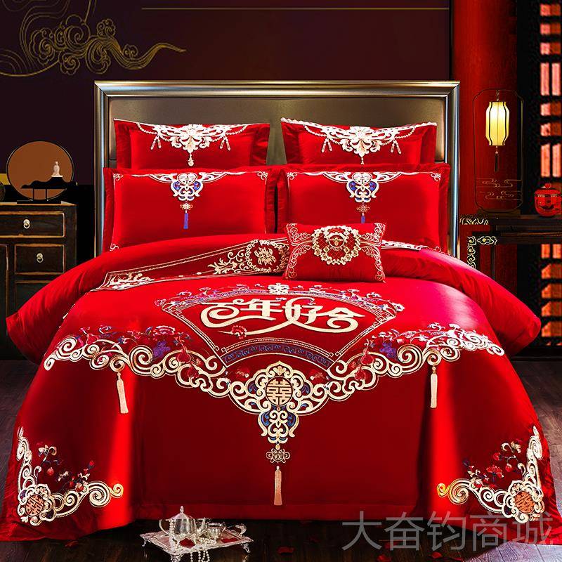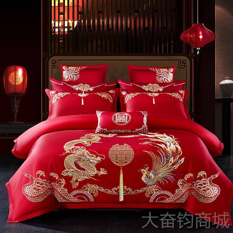 正品婚庆四件大红套色全棉龙凤绣被套中式结婚刺纯棉陪嫁喜上庆床