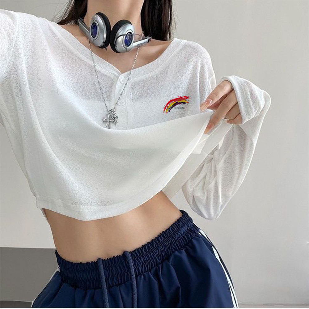 V领罩衫薄纱上衣长袖T恤女春秋休闲韩系爵士舞穿搭防晒短款微透