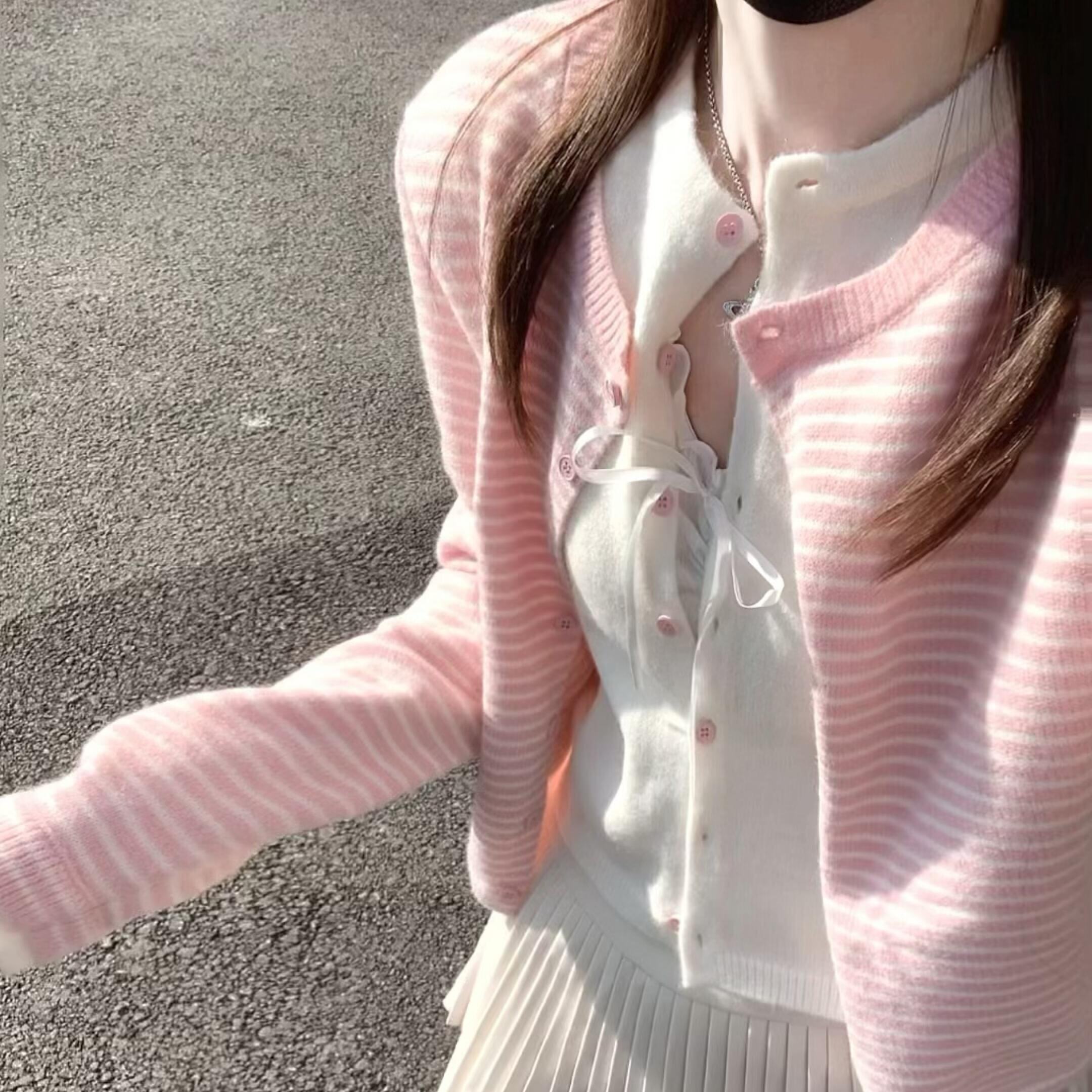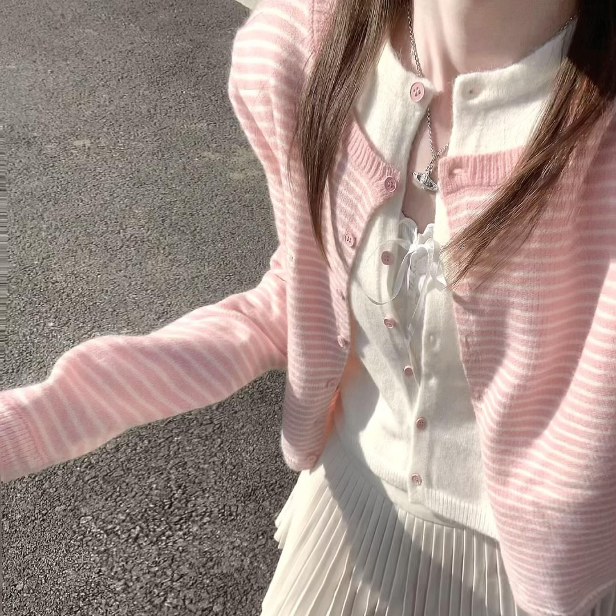 少女感粉色条纹假两件针织开衫上衣女秋季韩系小个子圆领毛衣外套