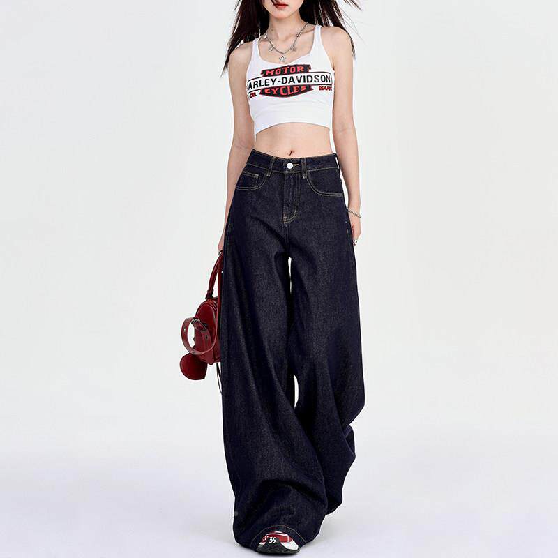 首页> 女装> 深蓝美式宽松阔腿牛仔裤女2025年夏季直丝筒垂感慵懒PHB休闲 冰拖