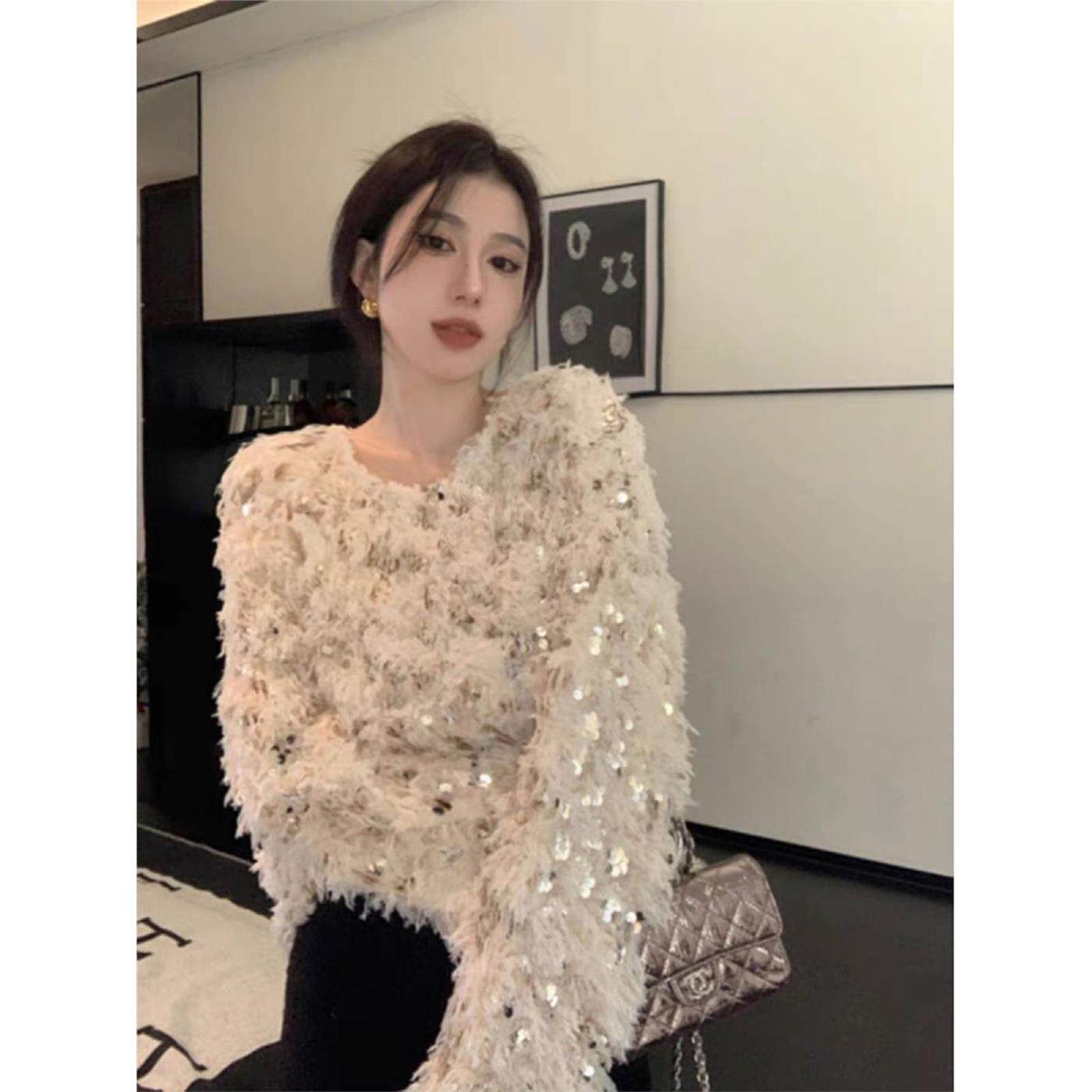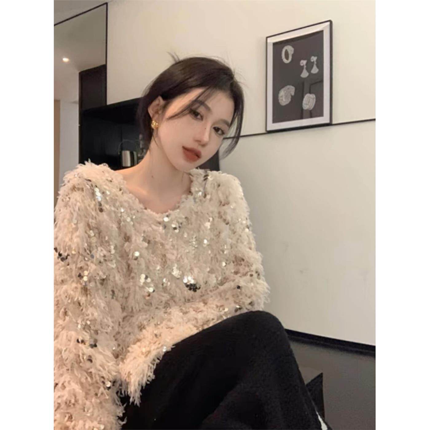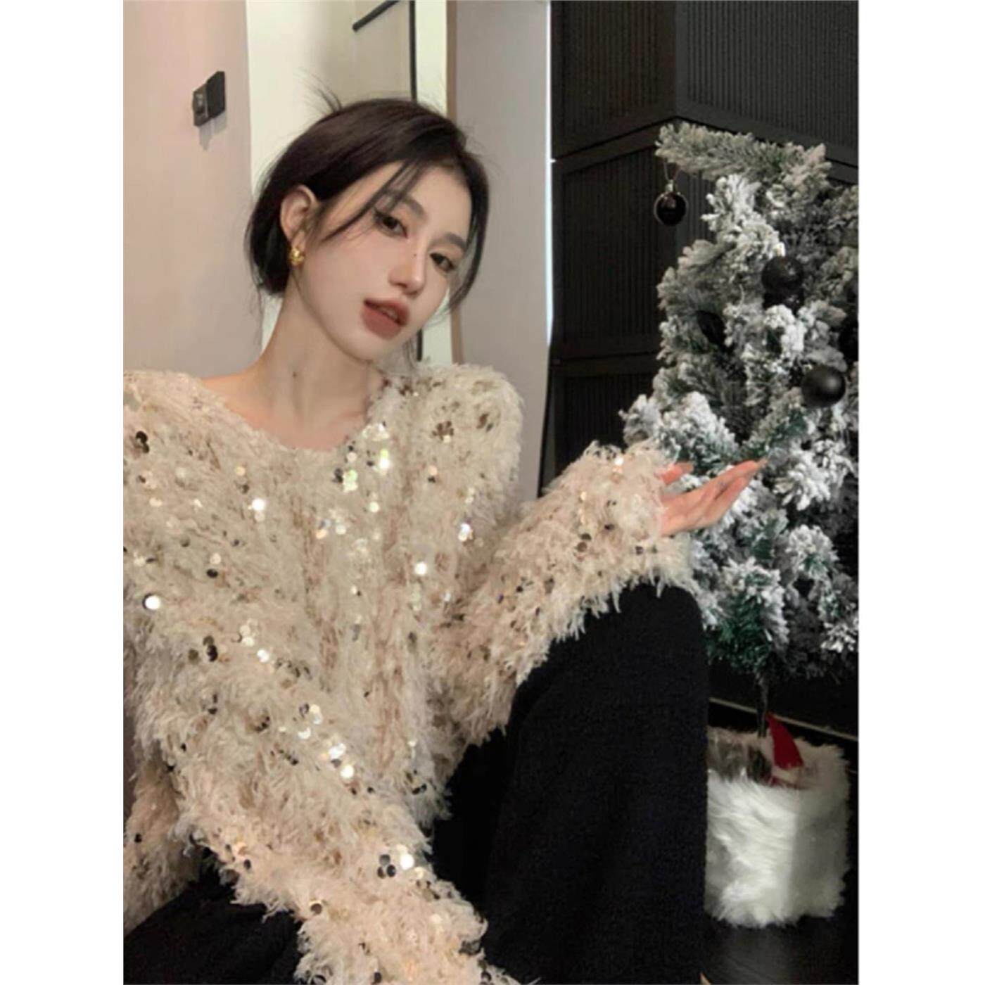 大码女装秋季新款2025胖妹妹圆领毛衣亮片时尚百搭宽松高级感上衣
