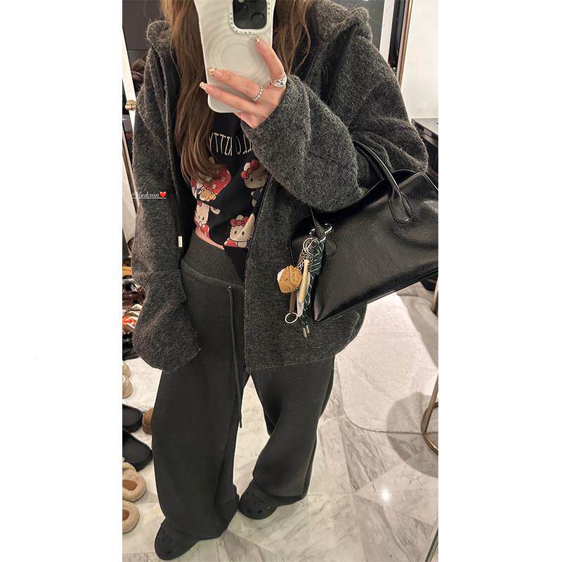 HE机哥YGIRL黑 场女明星 复合加厚保暖卫CFH衣冬抽绳连帽拉女链外