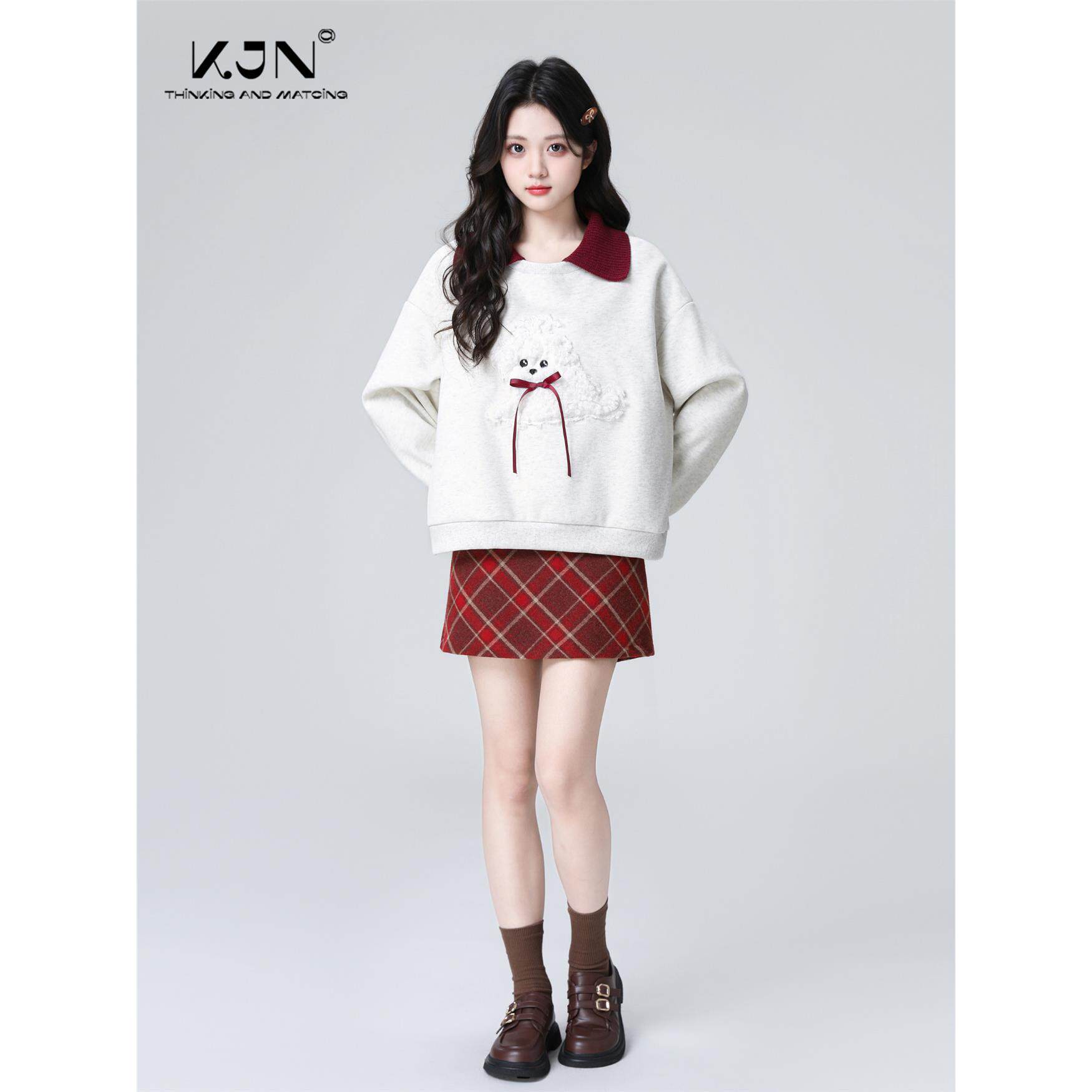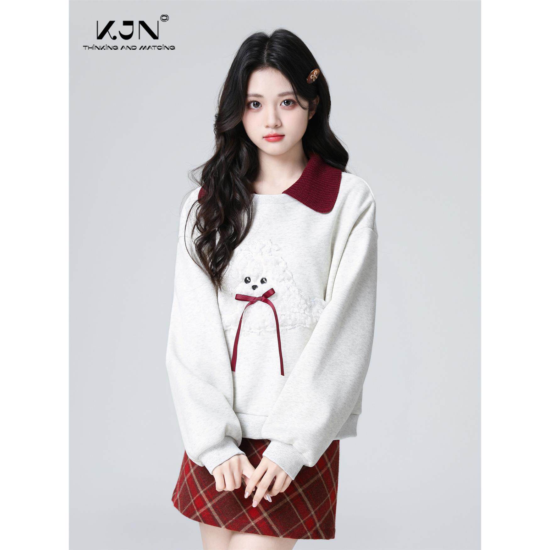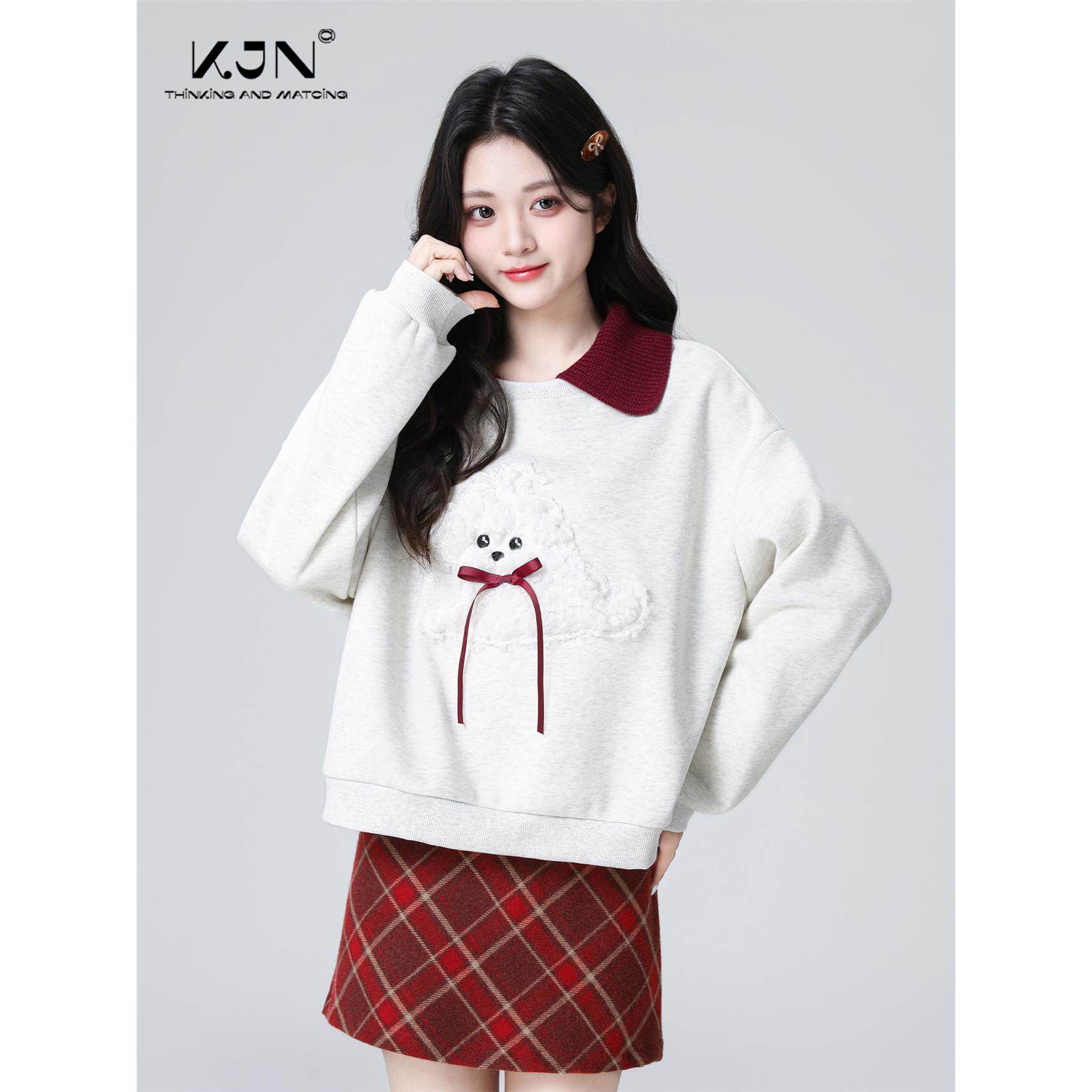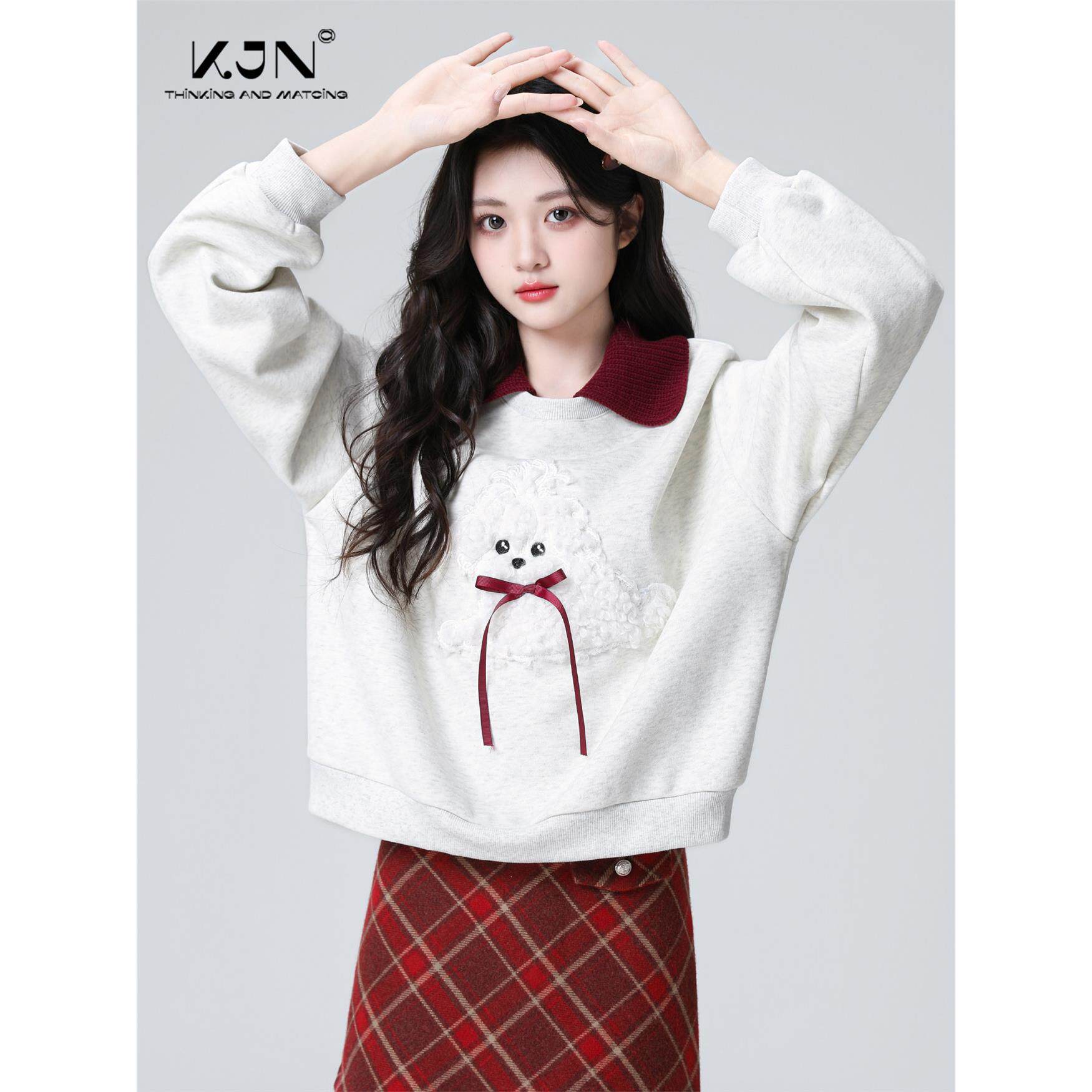 灰色翻领加绒卫衣女秋冬2025秋新款蝴蝶结撞色宽松polo领无帽上衣