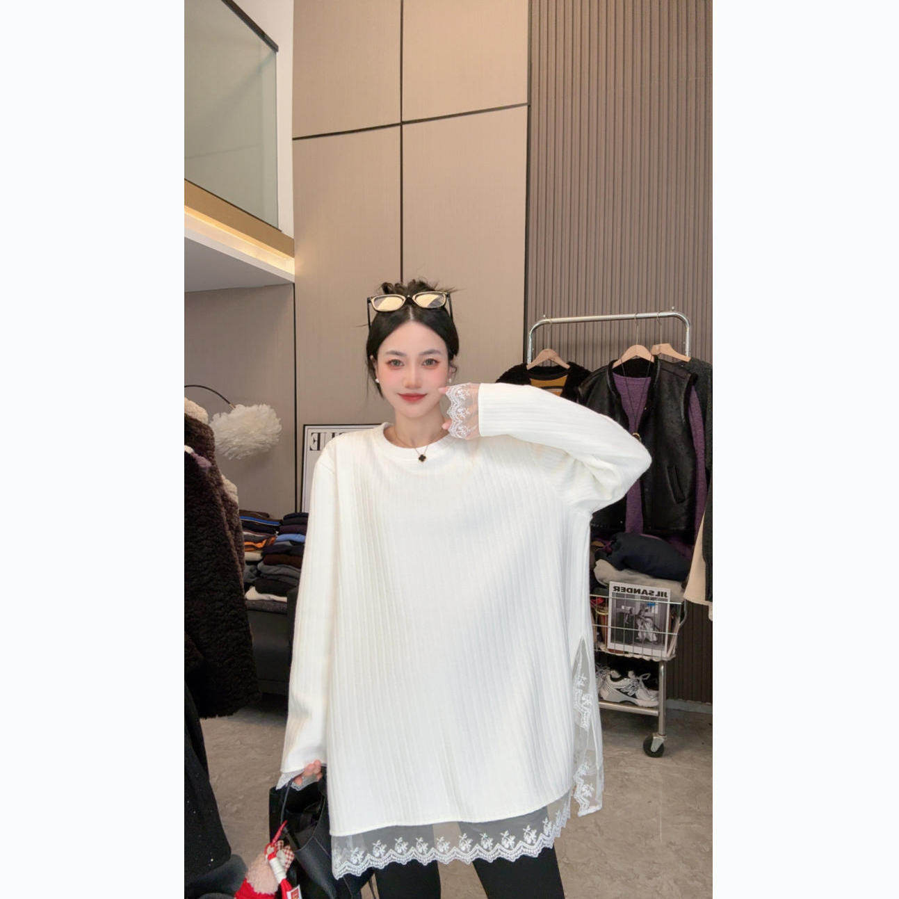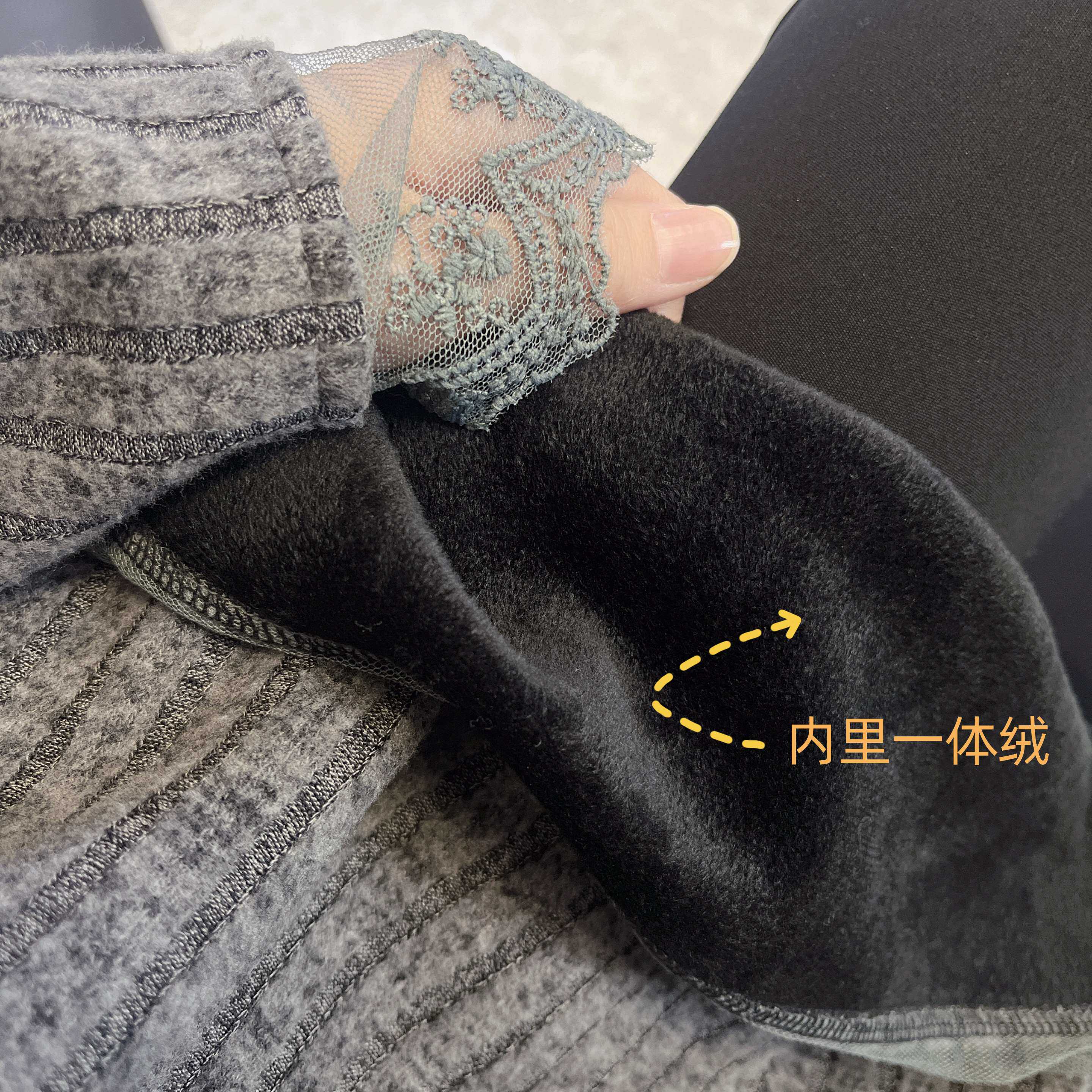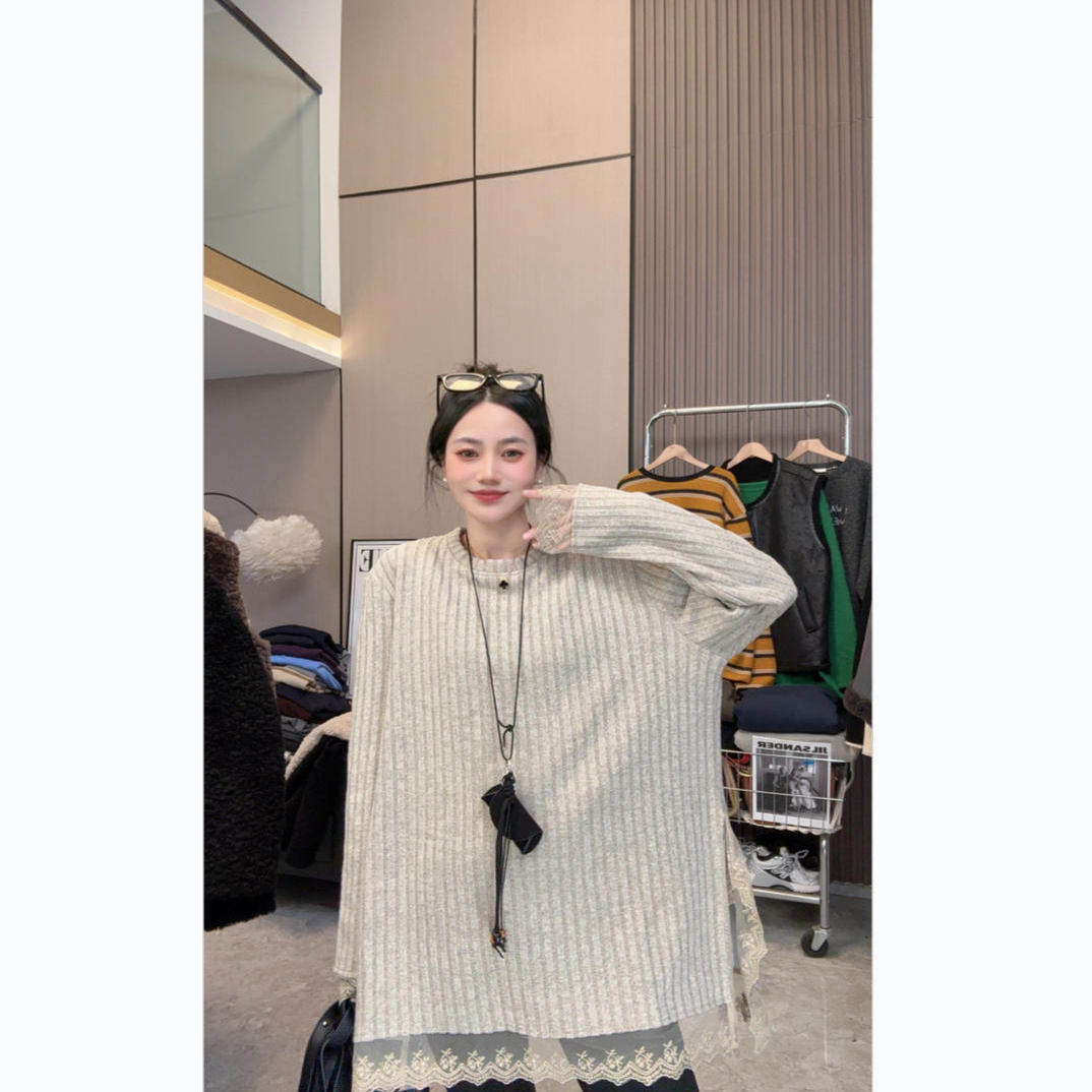 【黑巧蕾丝】软糯糯~加绒秋冬简约坑条宽松中长款圆领长袖上衣