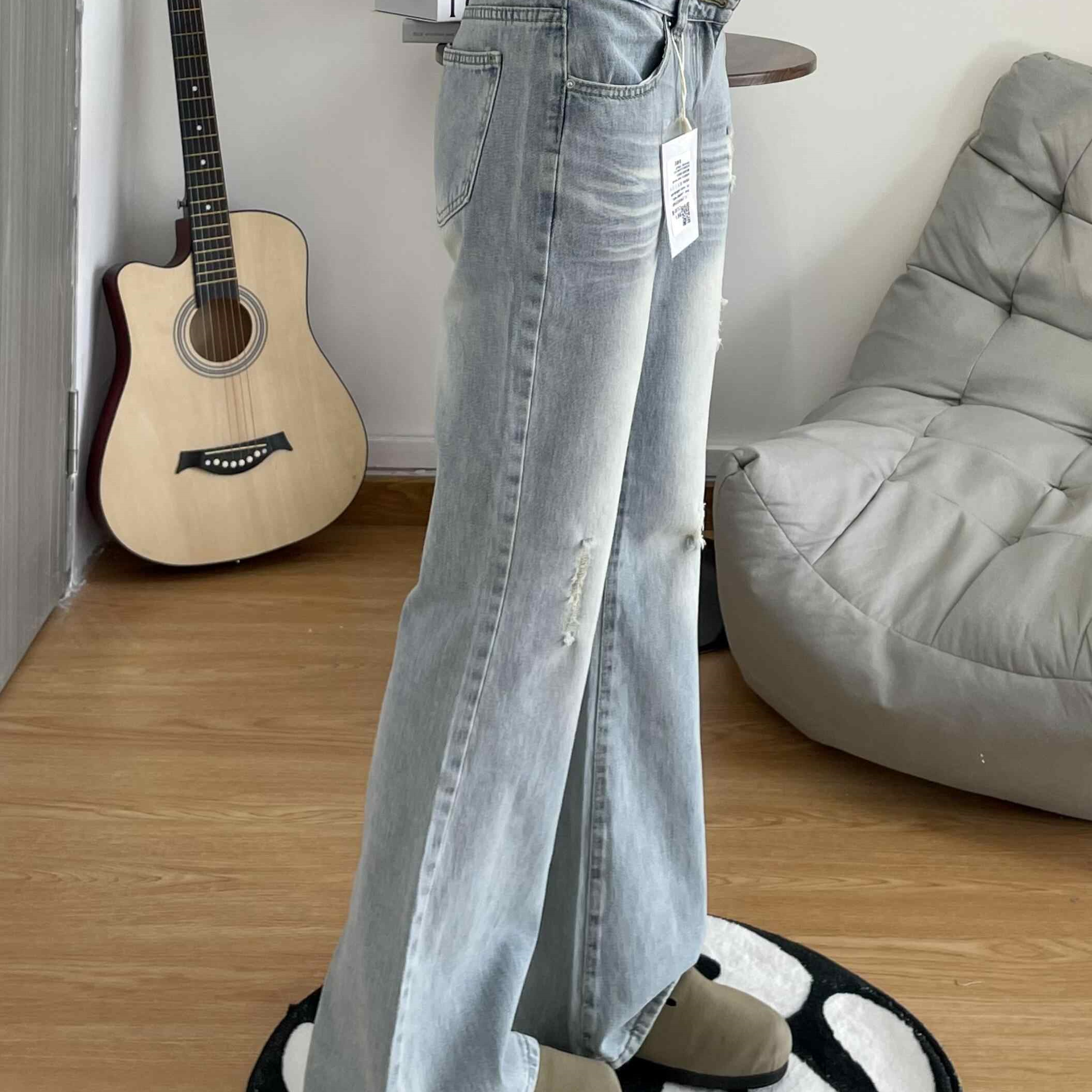 首页> 女装> 复古设计感破洞微喇叭牛仔裤女修身显瘦显腿长浅蓝色蕾丝花边拼接