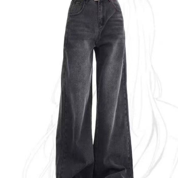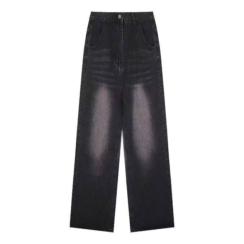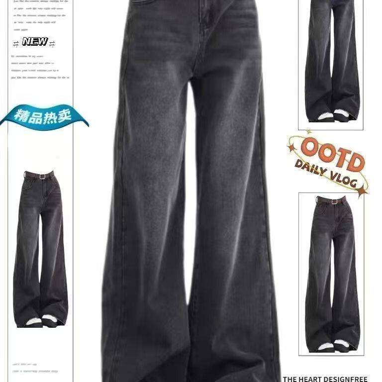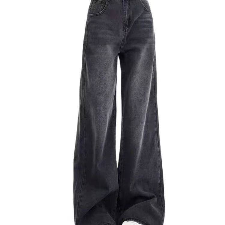 美式黑灰色阔腿牛仔裤女春夏新款复古水洗高腰宽松垂感拖地直筒裤