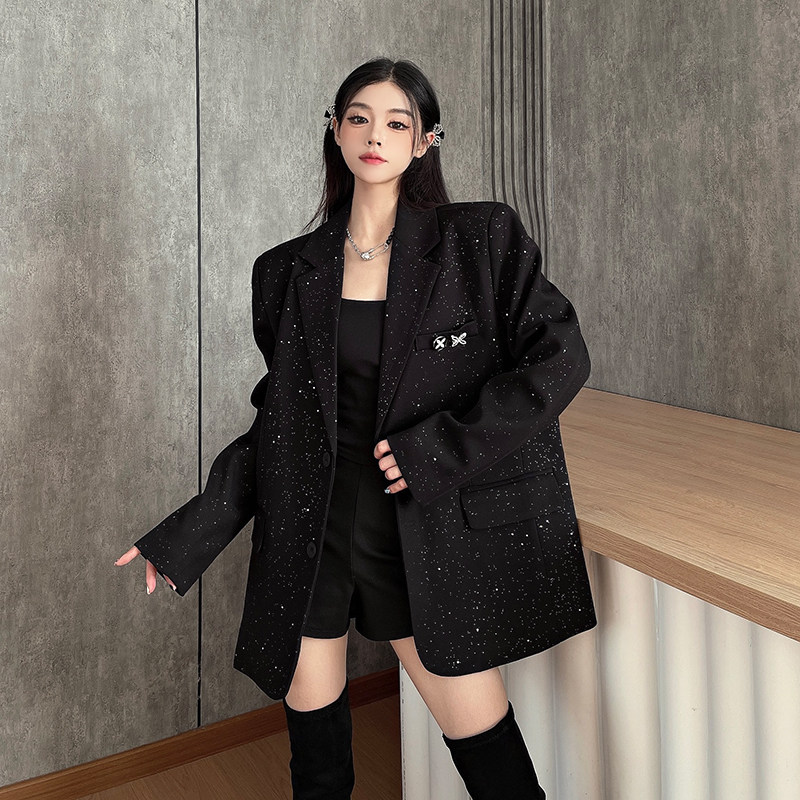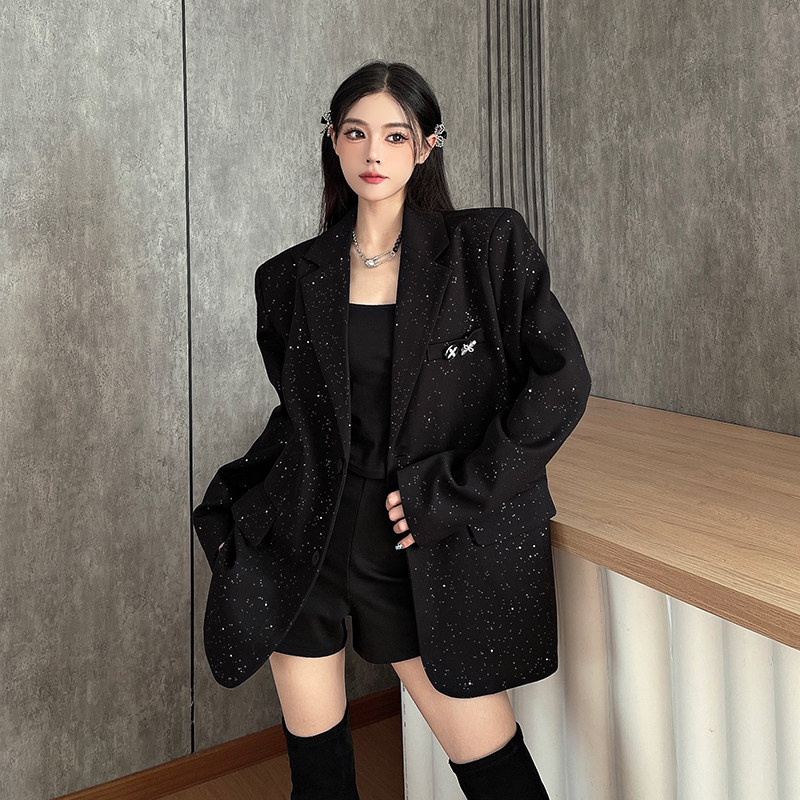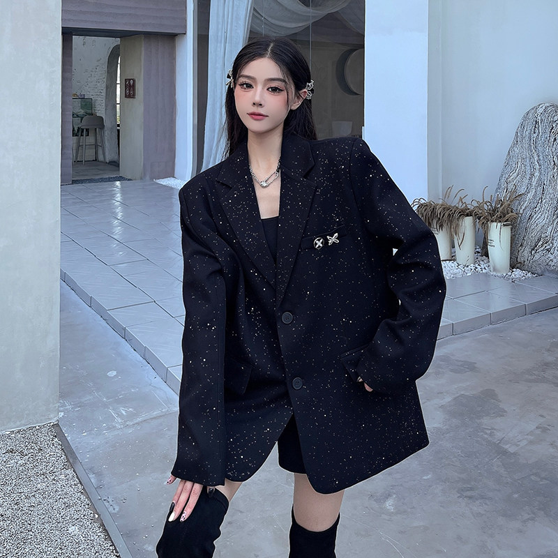 实拍实价 满天星撒粉设计感黑色西装外套女烫金闪闪高级感西服潮