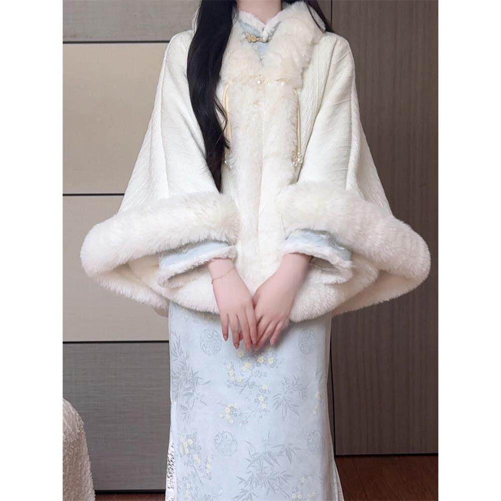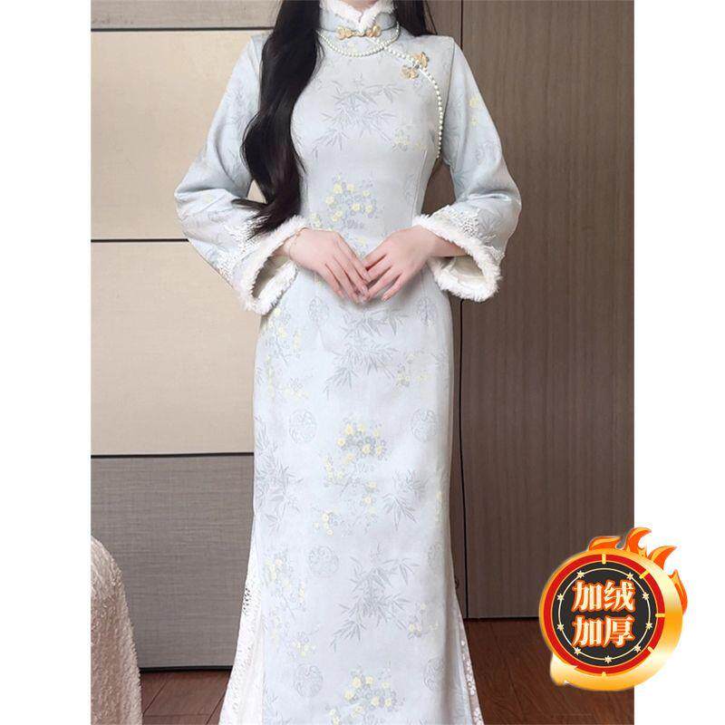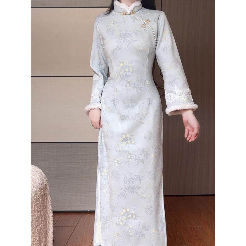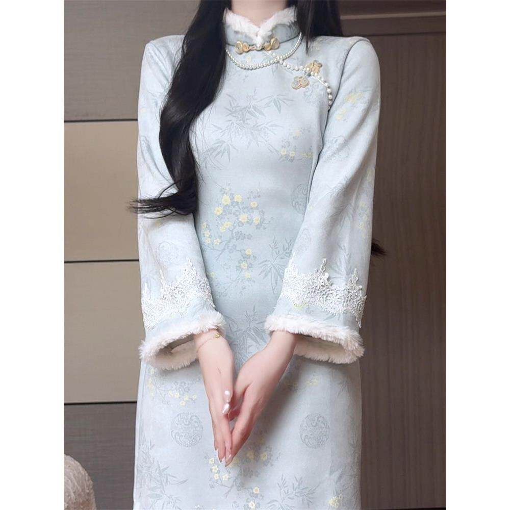 气质蓝色旗袍冬季加绒2025素雅新款中式保暖淑女国风气质连衣裙