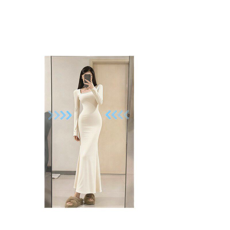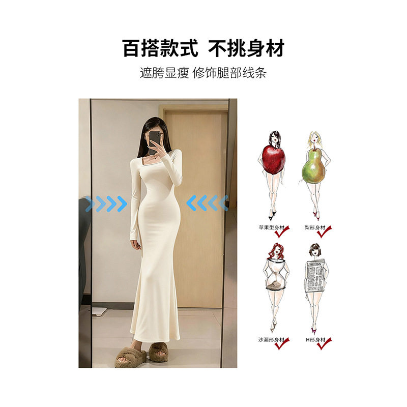 白色步步生莲鱼尾连衣裙女秋冬季加绒厚内搭打底包臀伯克利长裙子