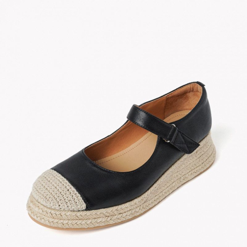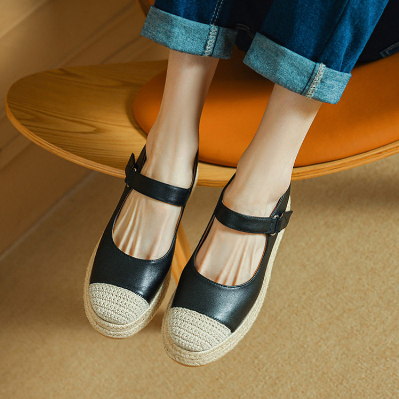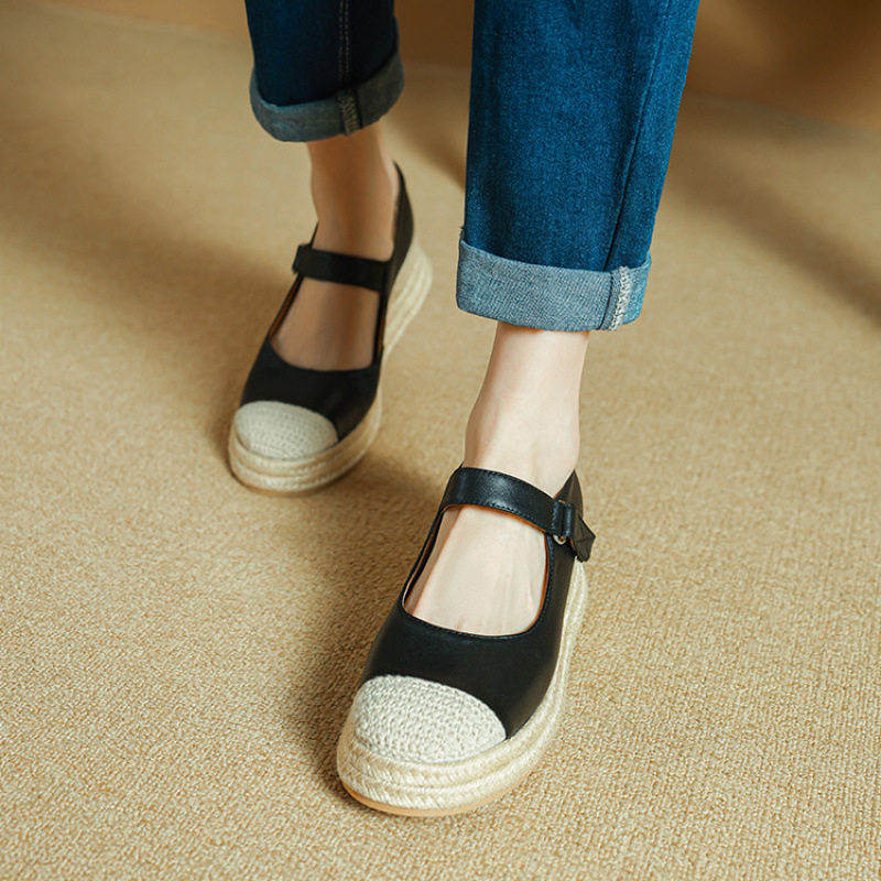 法式百搭圆头一字带高坡跟草编厚底浅口单鞋女2025新款夏季银黑色
