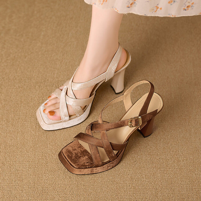 小个子编织高跟鞋女2025夏季新款真皮镂空防水台方头粗跟罗马凉鞋
