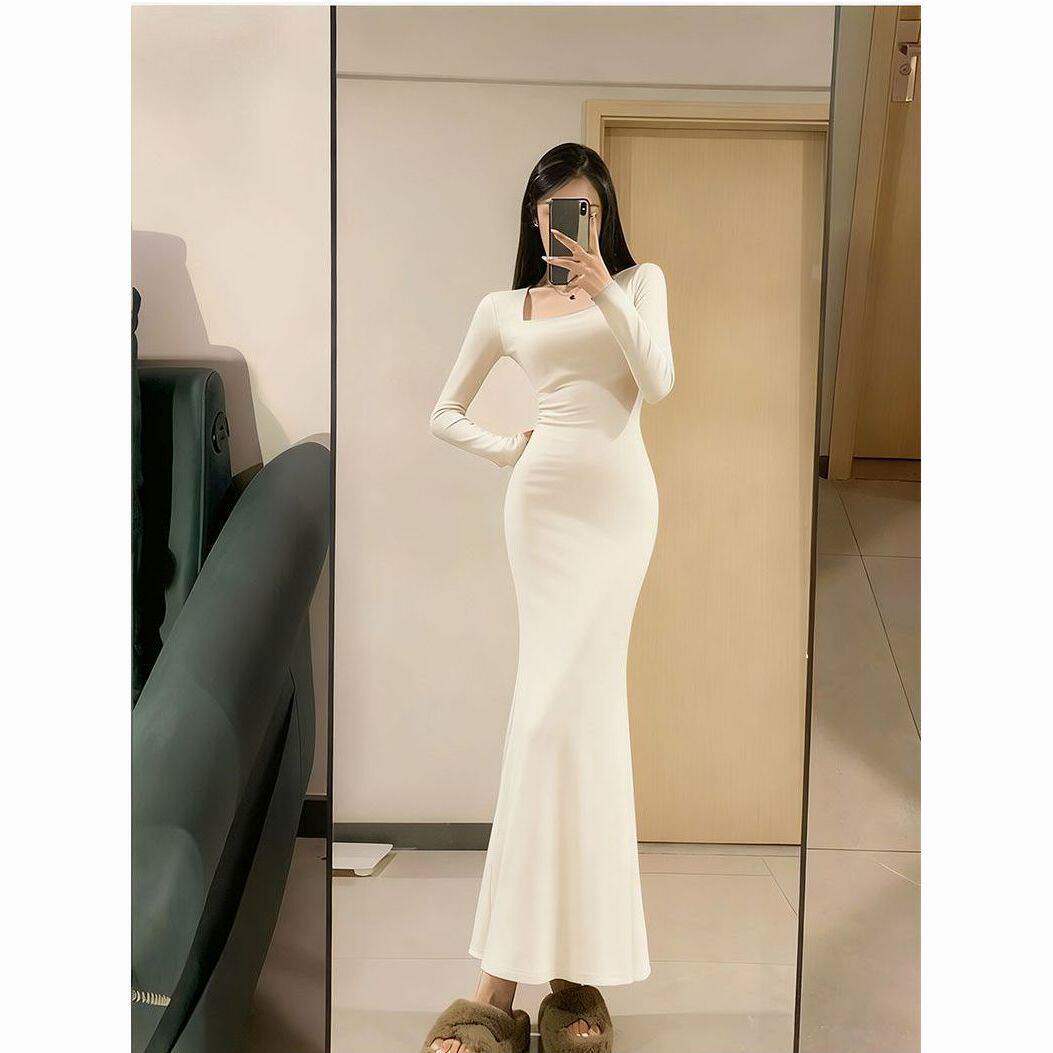 奶杏色步步生莲鱼尾连衣裙女包臀裙梨形伯克利秋冬大衣内搭长裙子