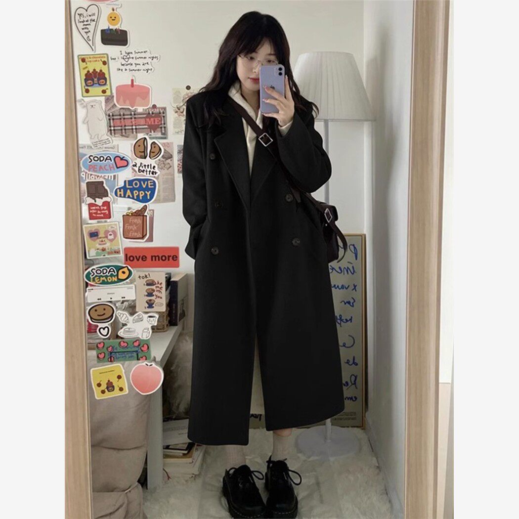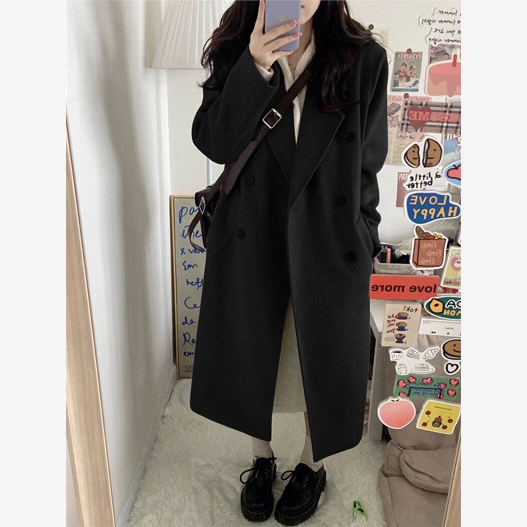 2024新款韩式中长款女装加厚黑色冬季高级羊毛外套