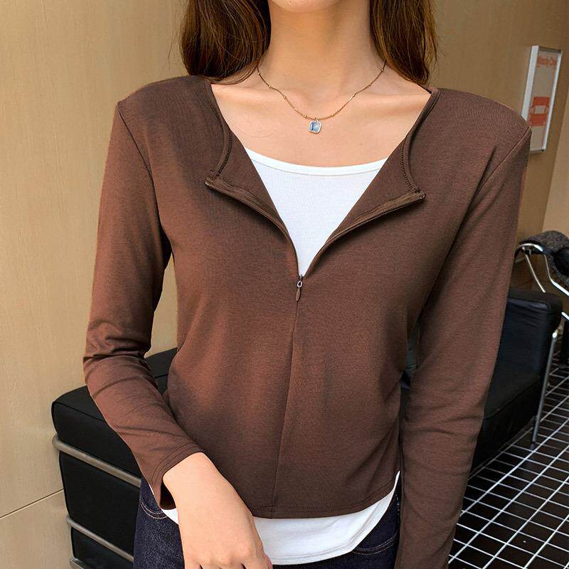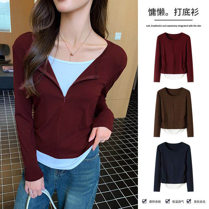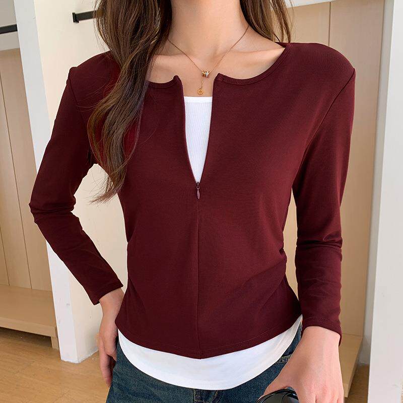 H401现货秋季新款隐形拉链假两件长袖T恤女装休闲褶皱打底衫上衣