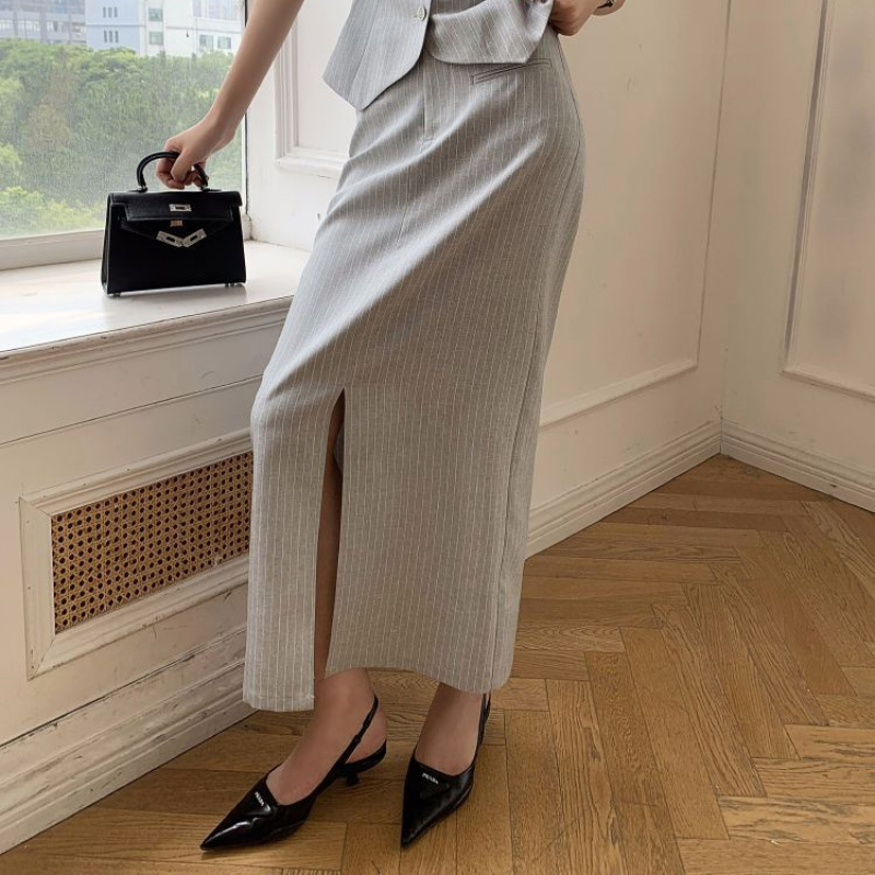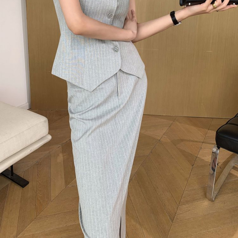 灰色条纹两件套装女2025年夏季无袖西装马甲高腰阔腿裤开叉半身裙