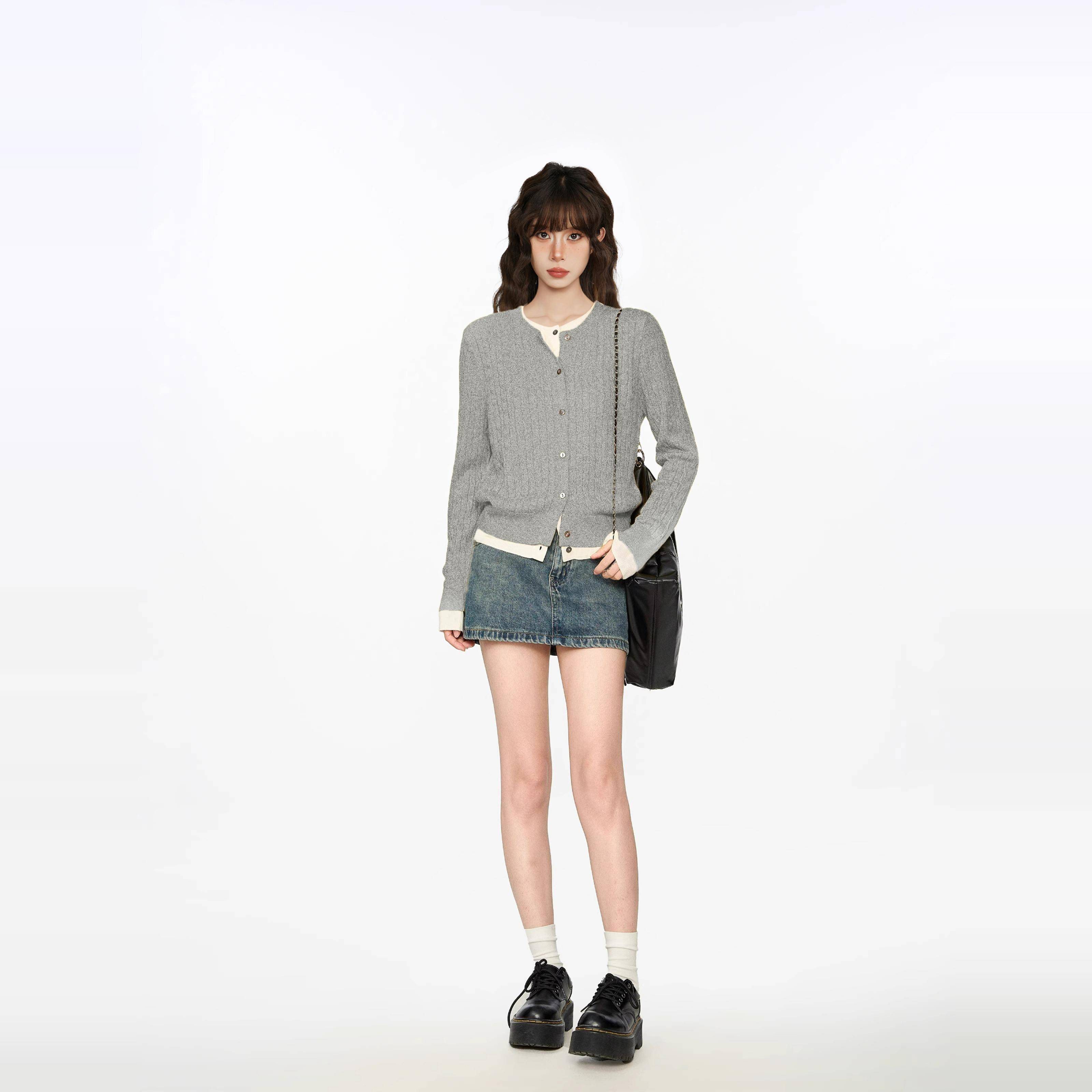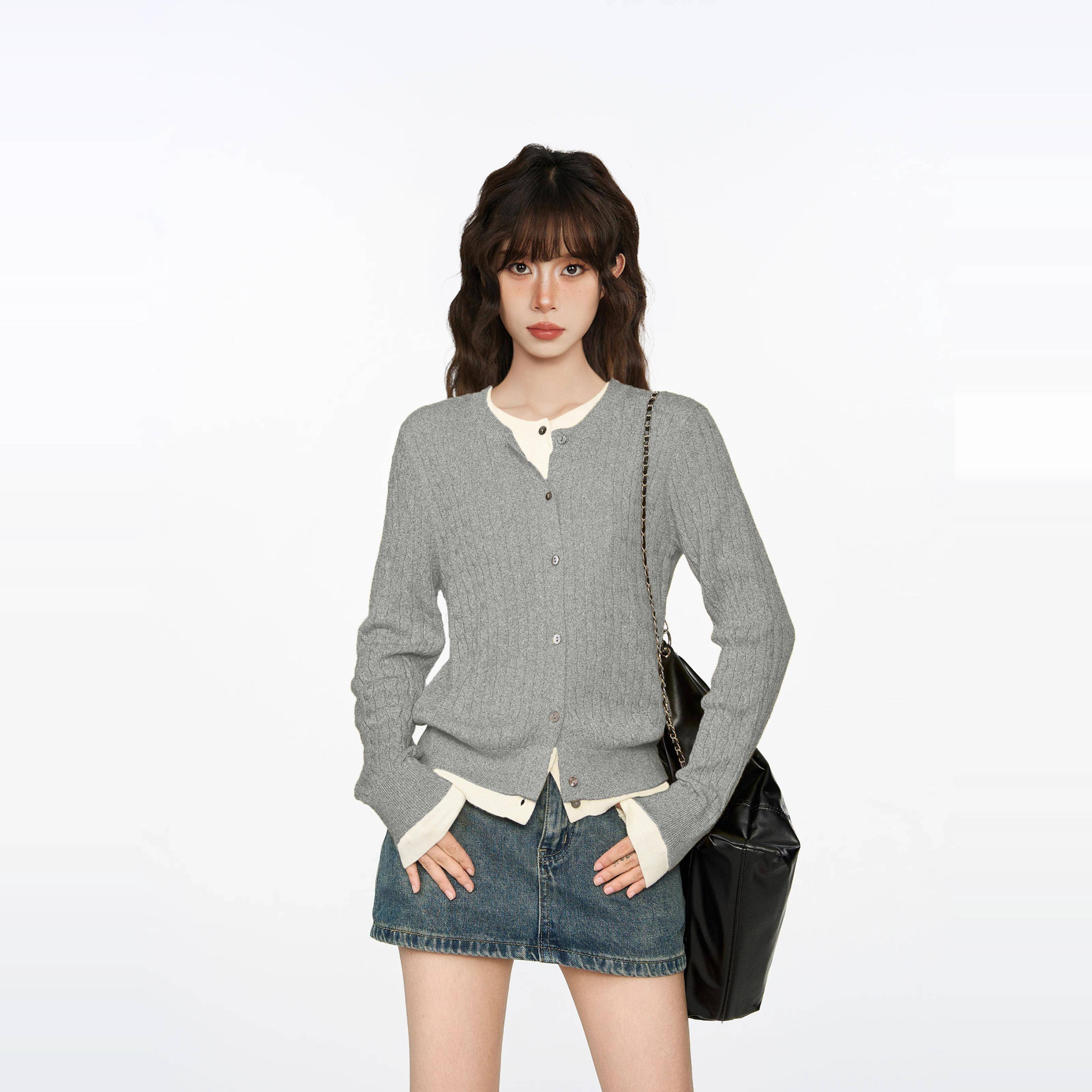 灰色假两件短款针织开衫女春装高级感修身内搭毛衣外套上衣春秋季