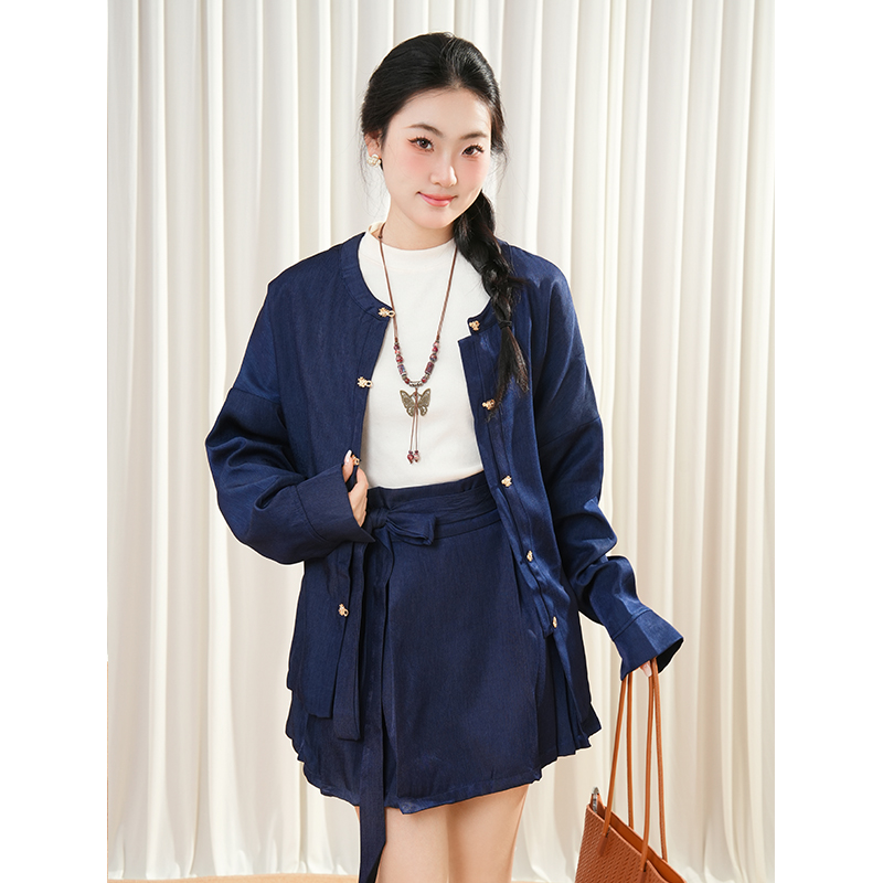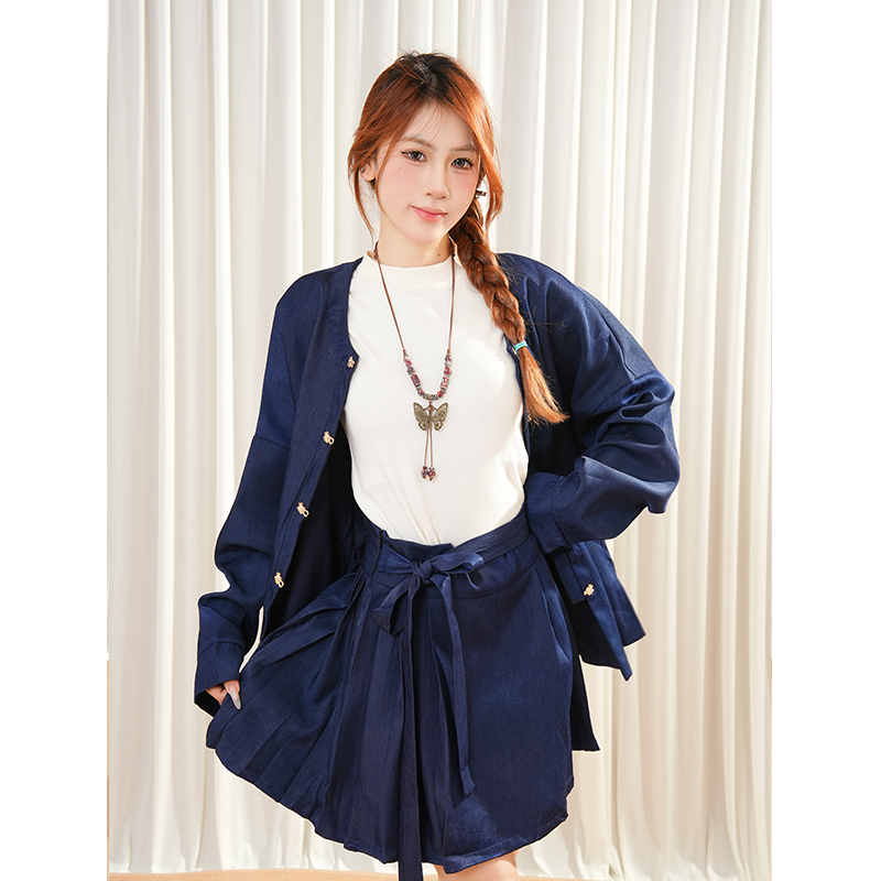 新中式国风圆领弓袋袖衬衫改良马面裙短裙春季新款汉服复古套装女