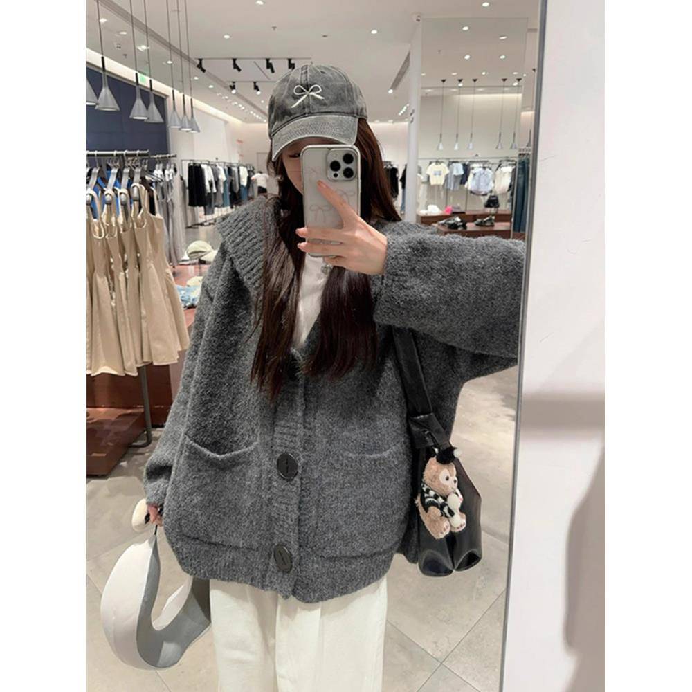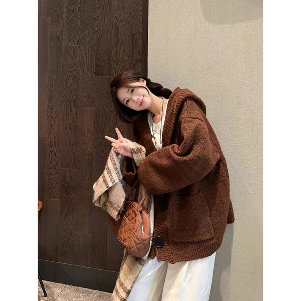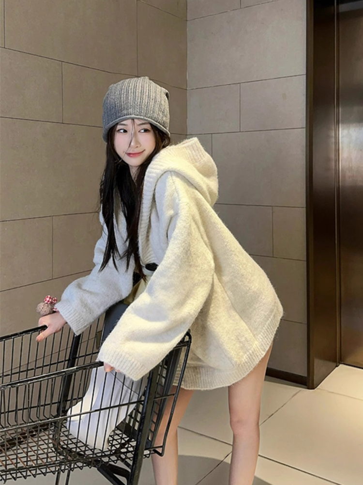 慵懒风宽松连帽针织开衫女秋冬加厚高级感软糯遮屁股毛衣外套上衣