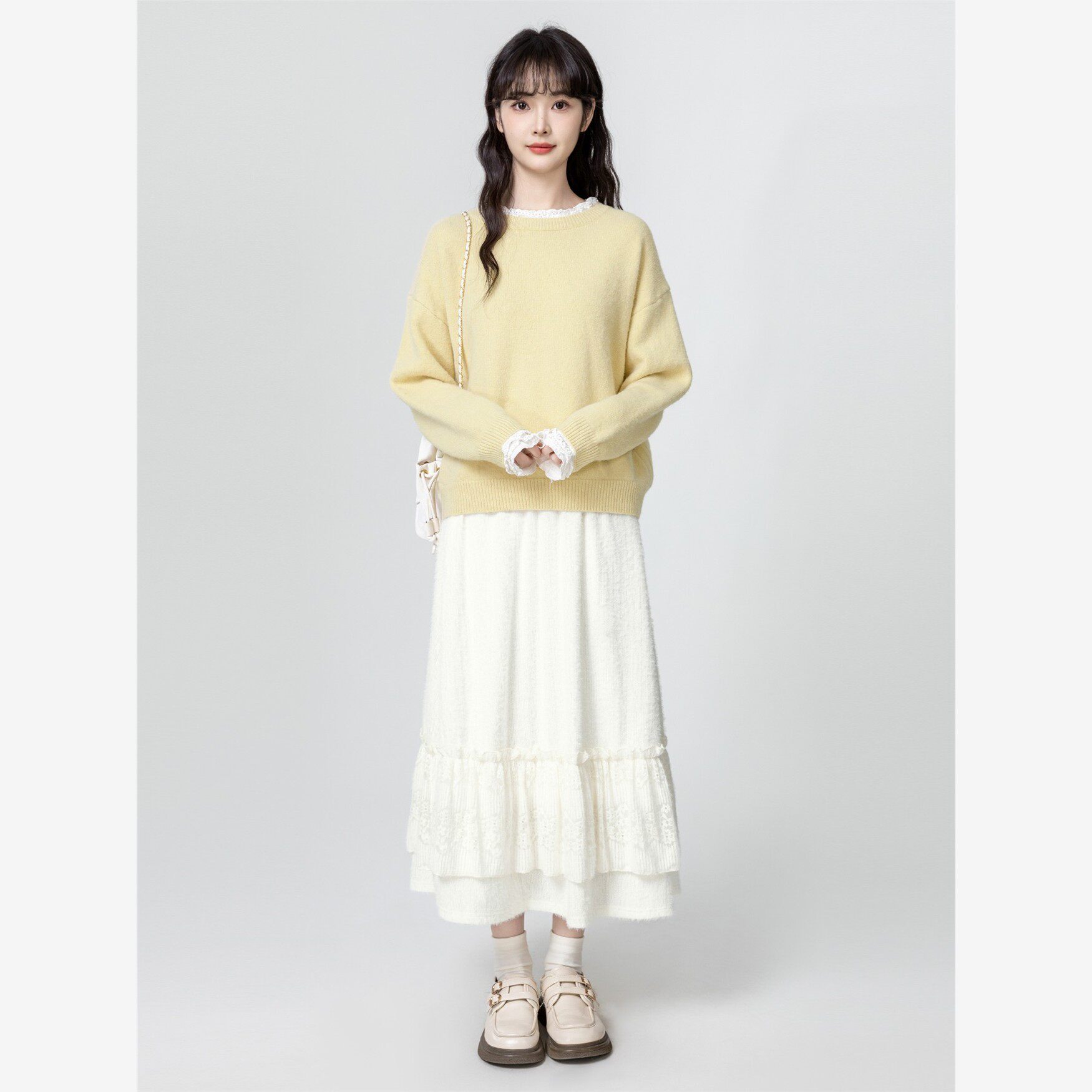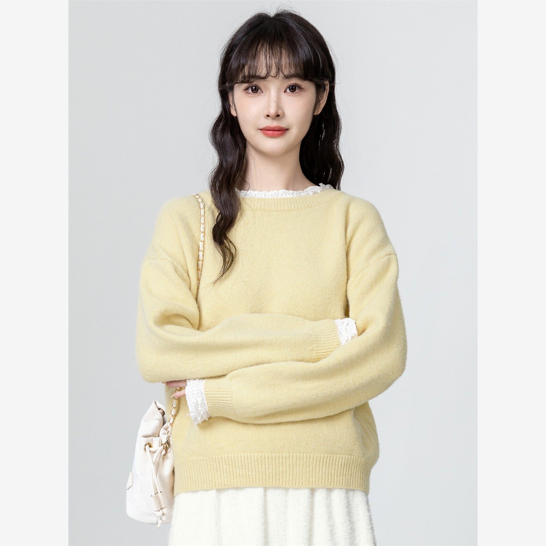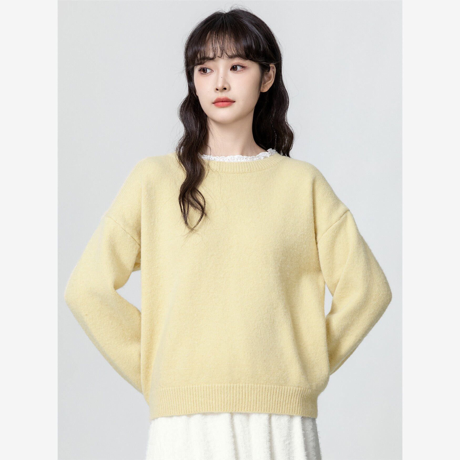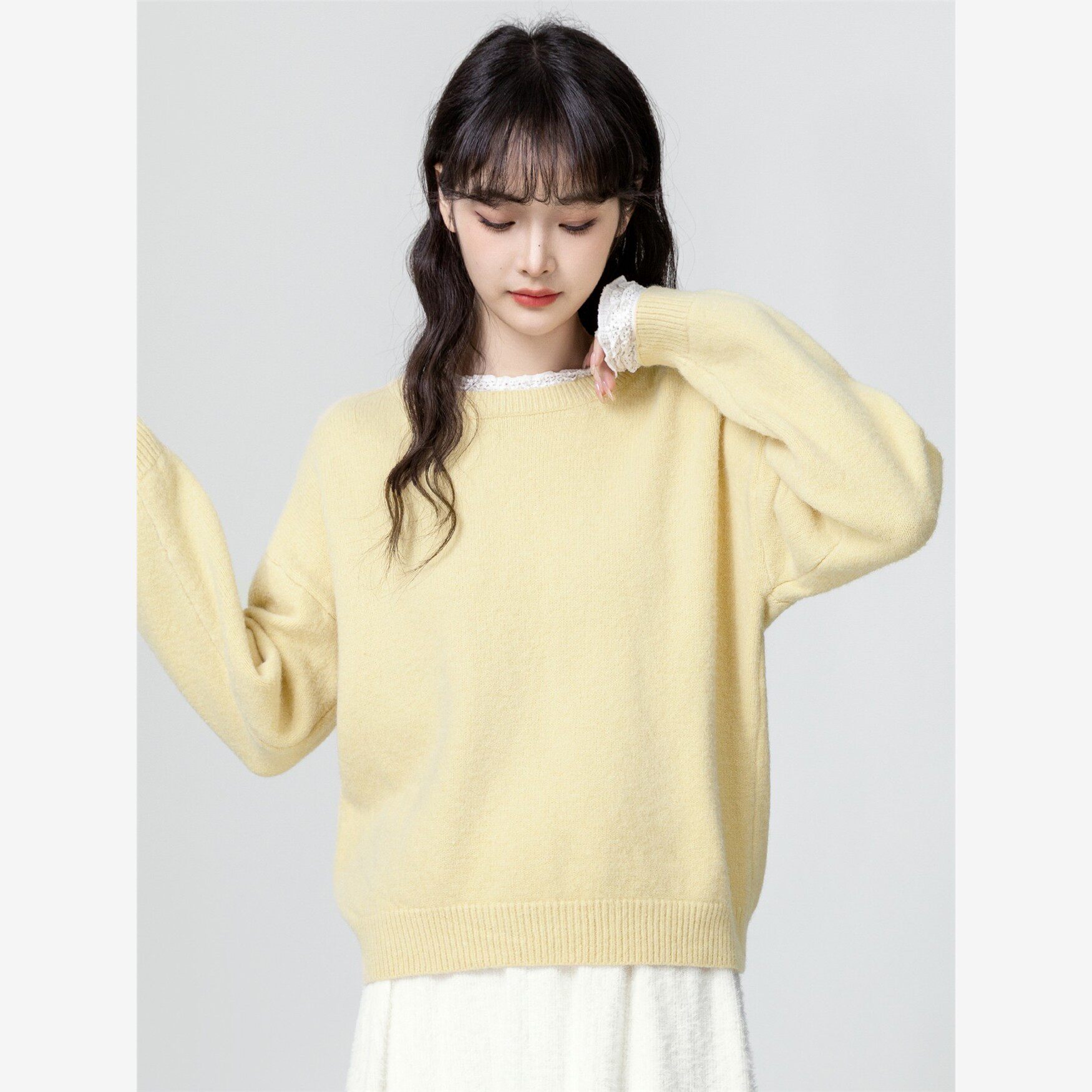 黄色圆领套头毛衣女秋冬2025秋季新款宽松加厚蕾丝拼接针织衫上衣