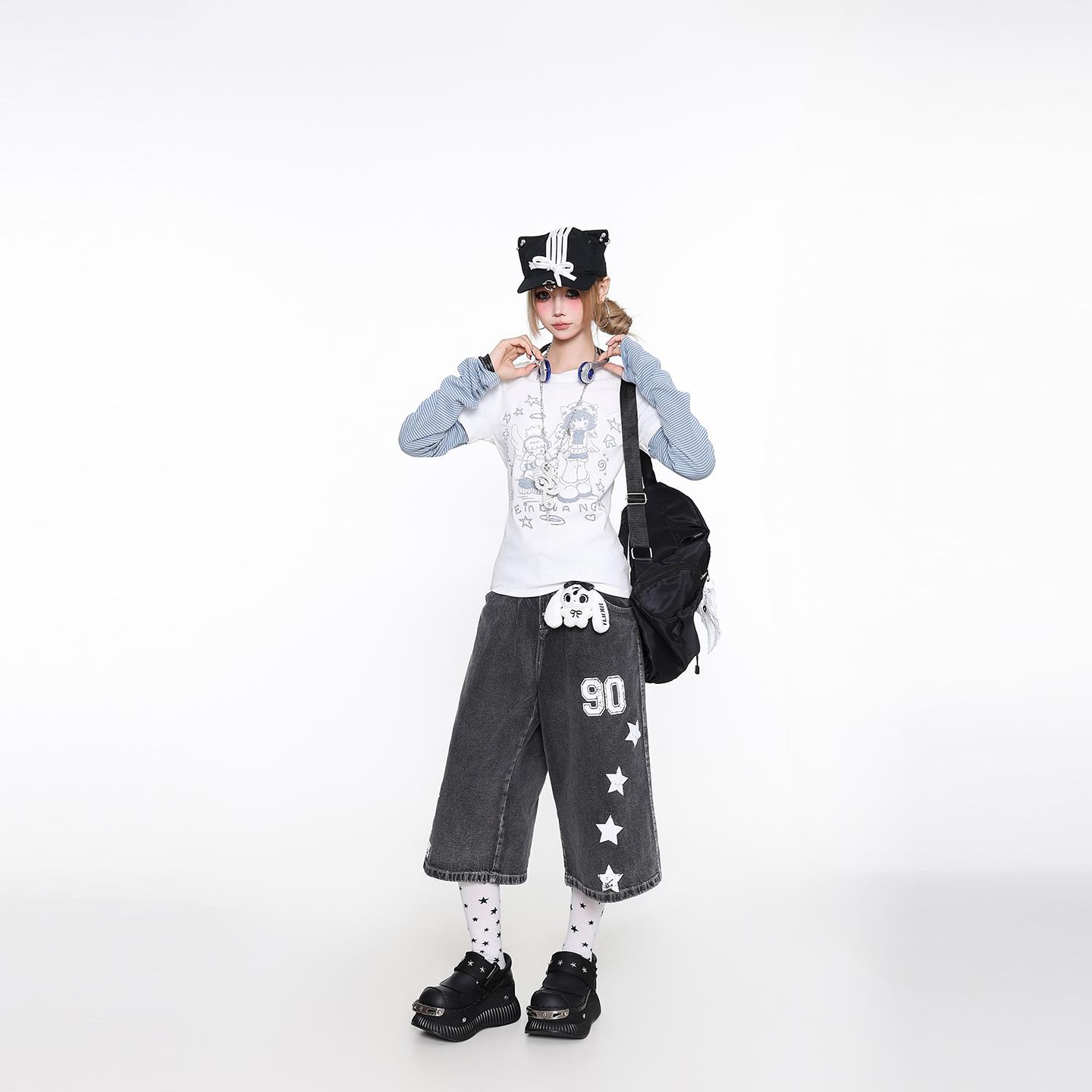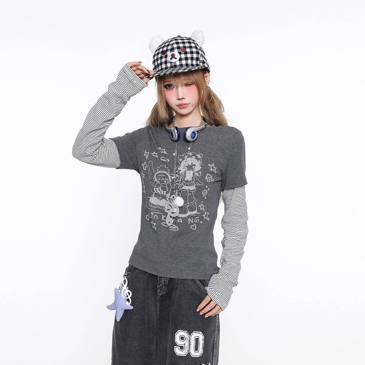 橘子酱YO亚萌感卡通人物图案假两件长袖T恤女早秋显瘦休闲上衣