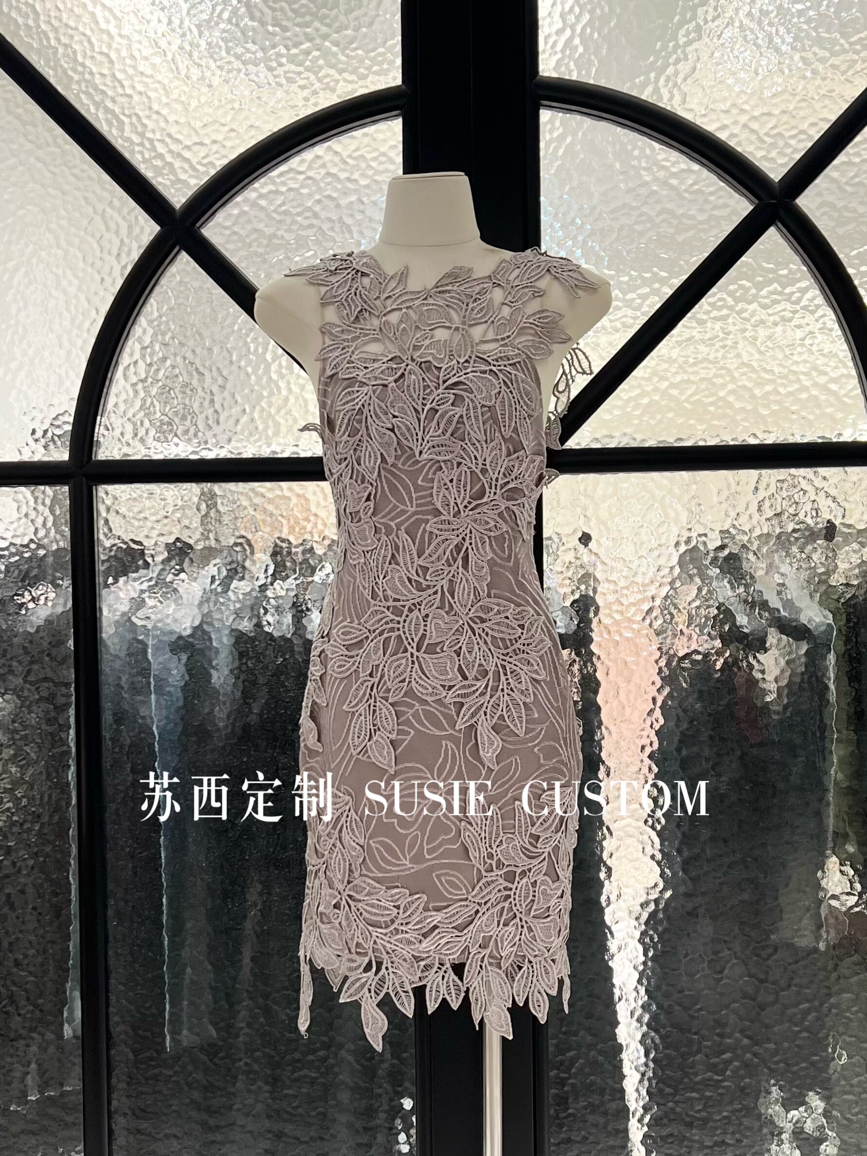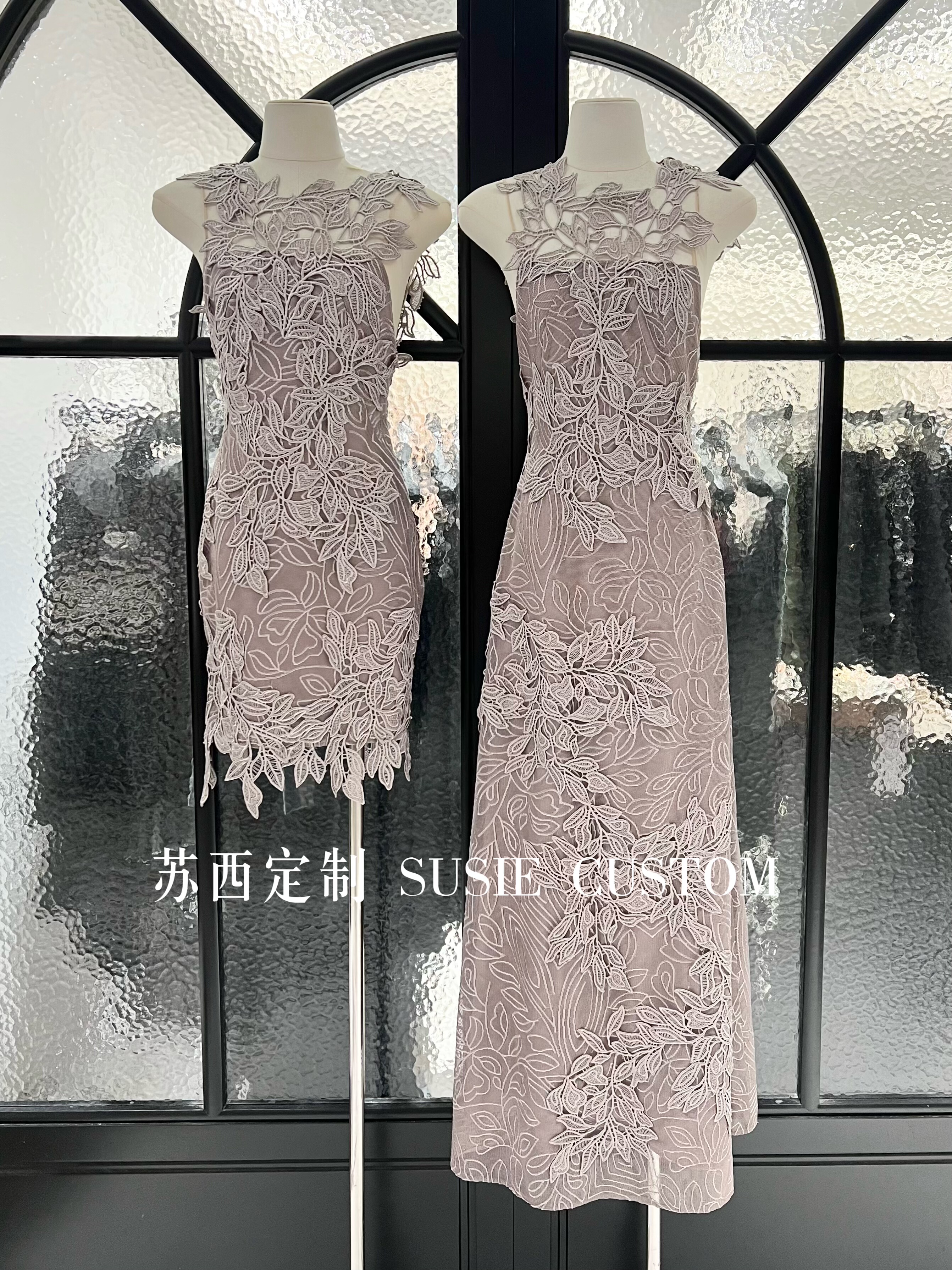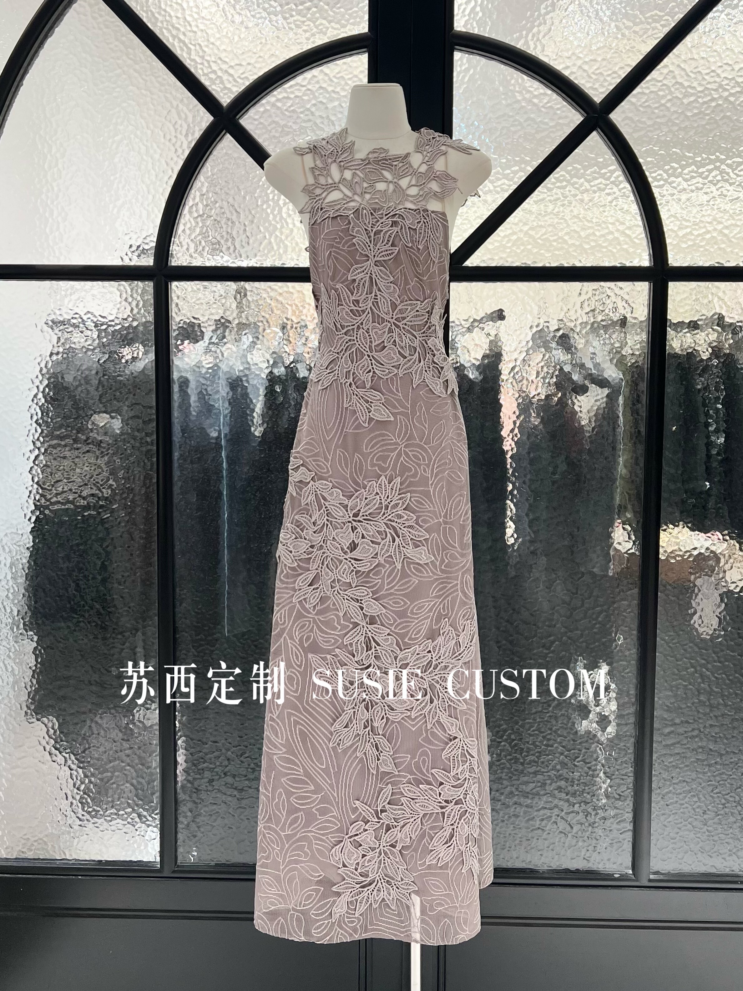 高定设计款法式复古镂空水溶刺绣蕾丝拼无袖背心收腰礼服裙连衣裙