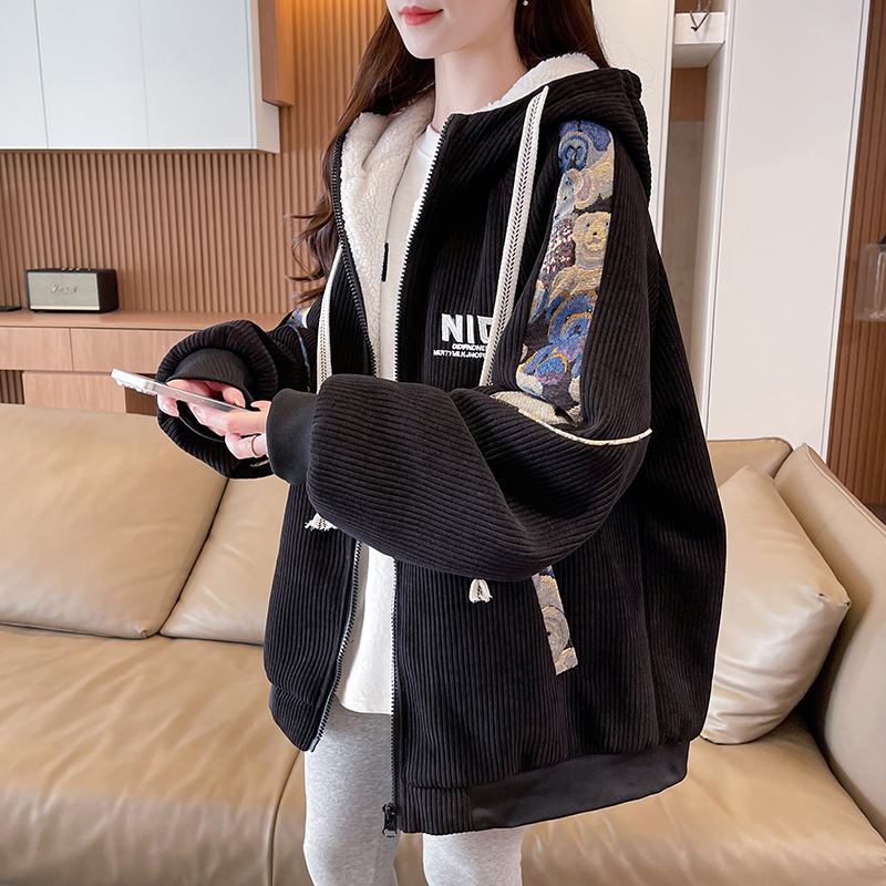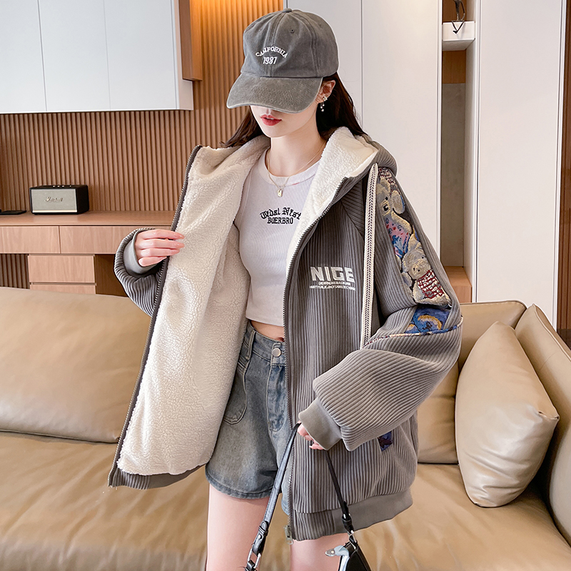 女大童灯芯绒羊羔毛加厚外套外套秋冬初中学生国潮刺绣棒球服棉衣