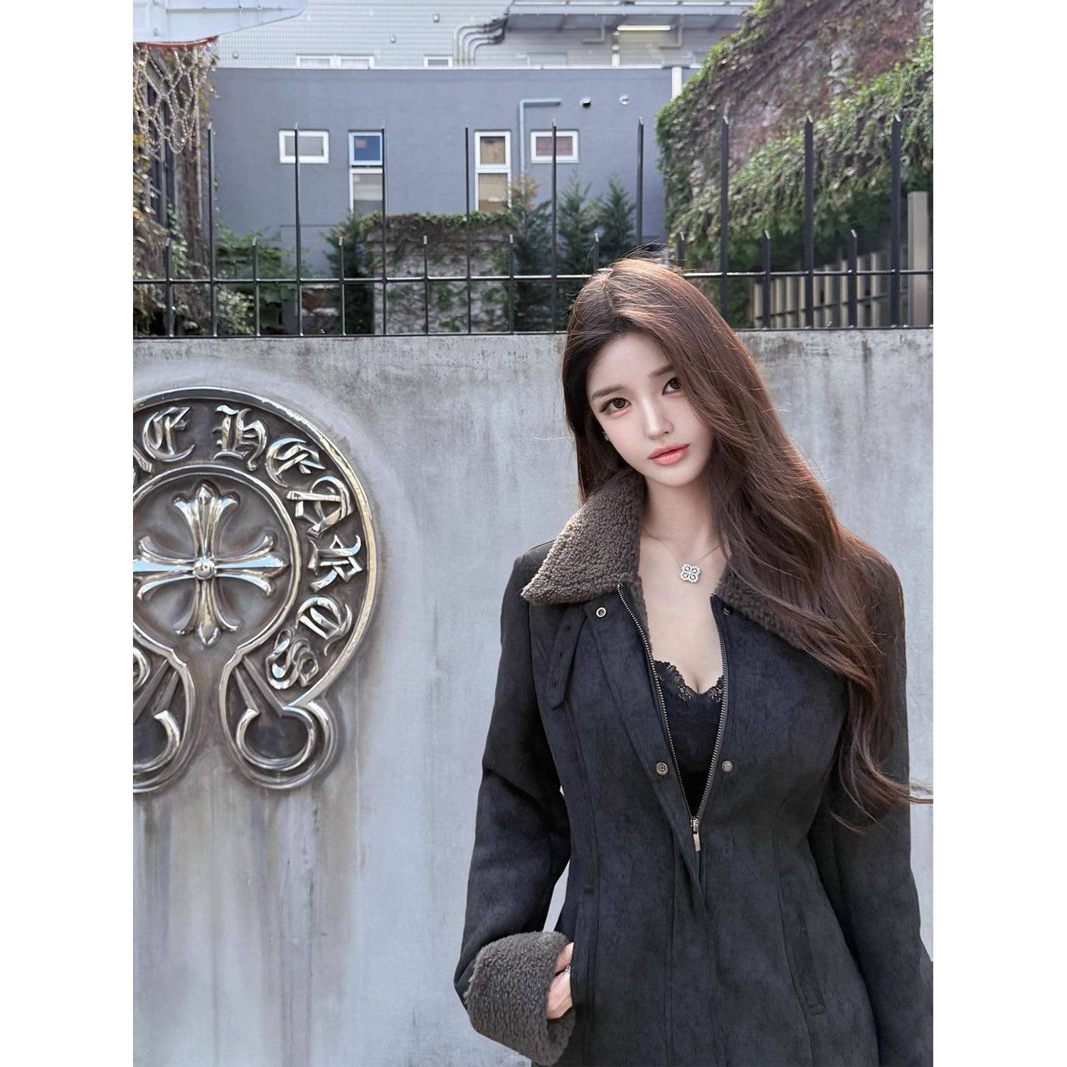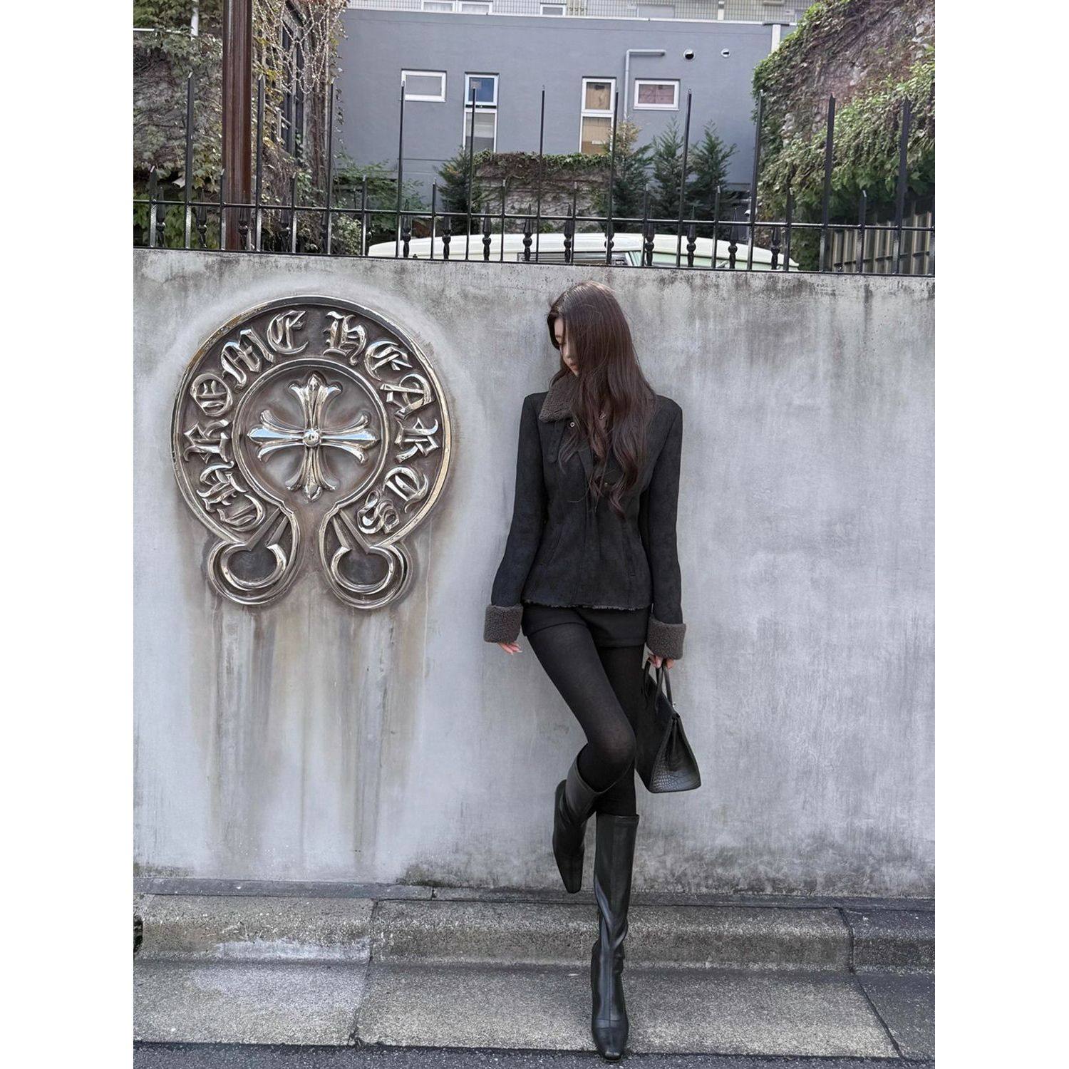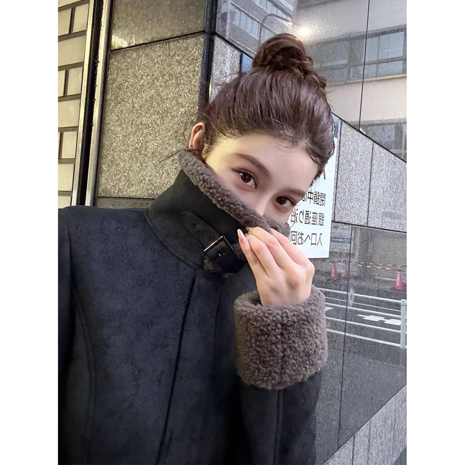 伦敦日常 冬季新款复古皮毛一体炭黑色短款外套气质收腰显瘦上衣
