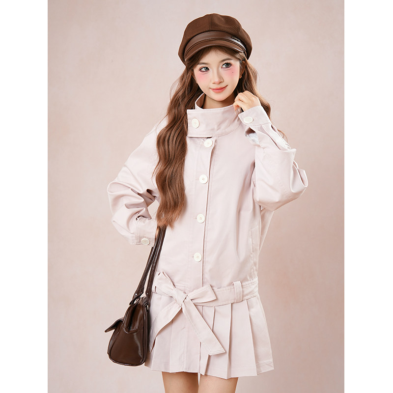 柏林往事 韩系粉色甜美风立领宽松休闲百褶下摆绑带收腰风衣外套