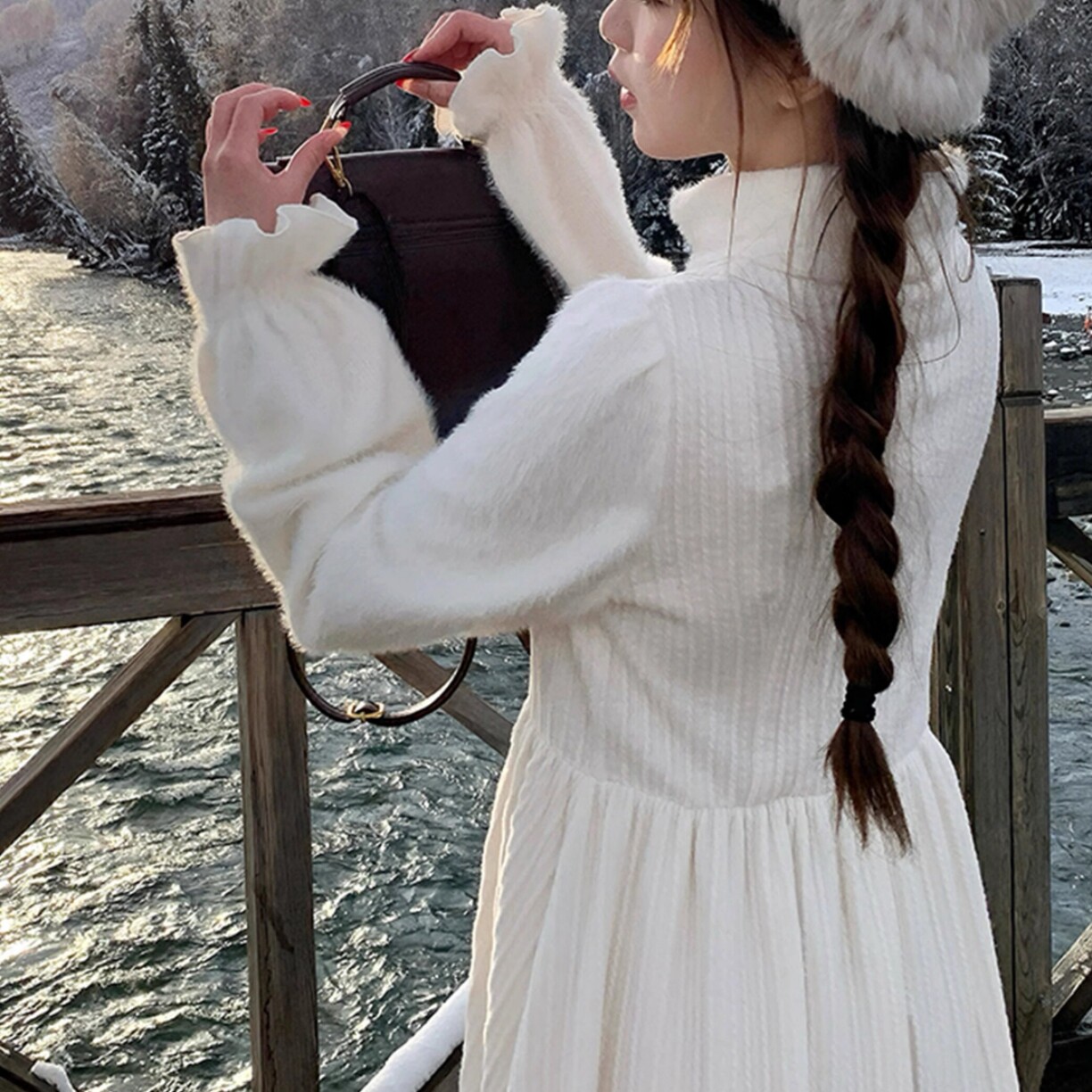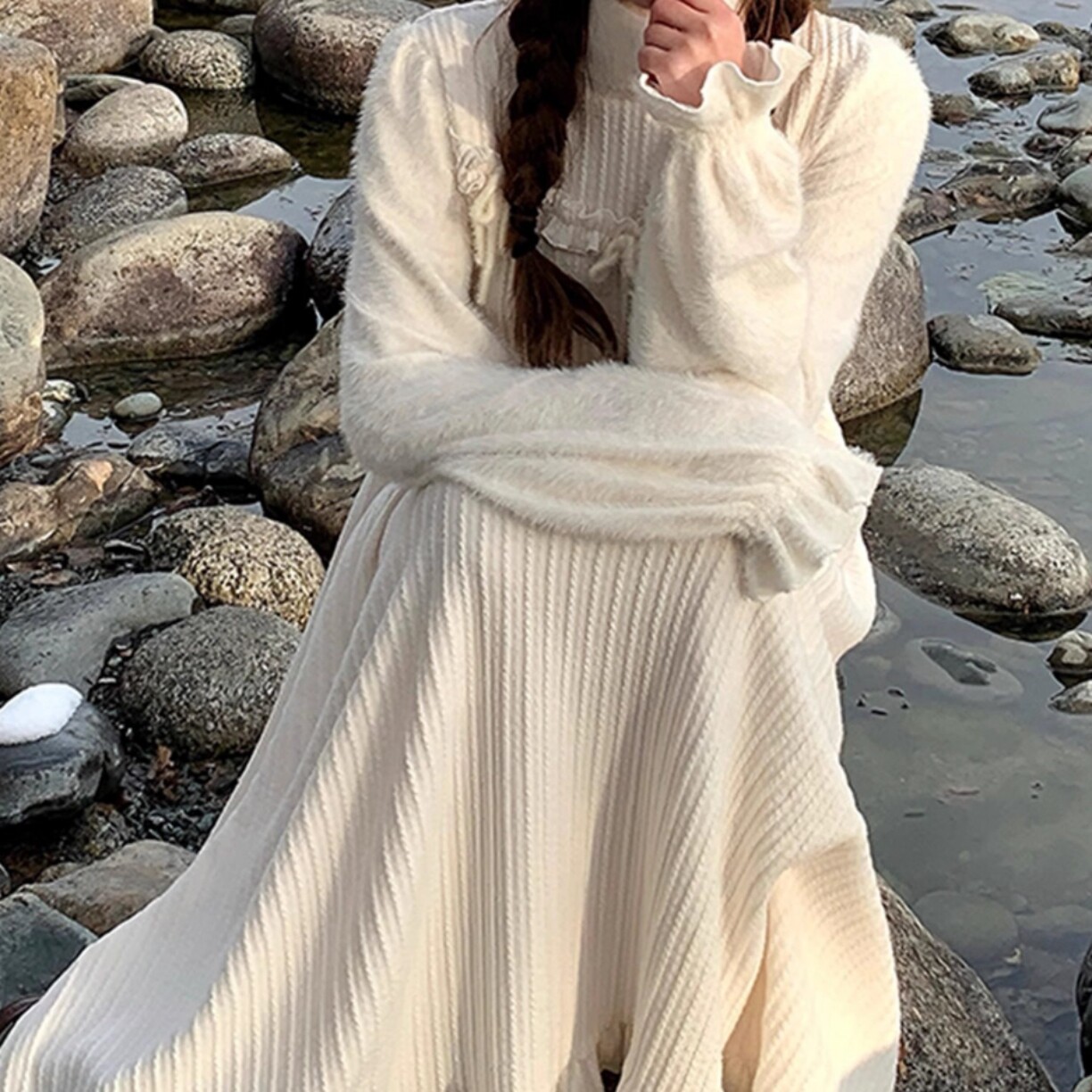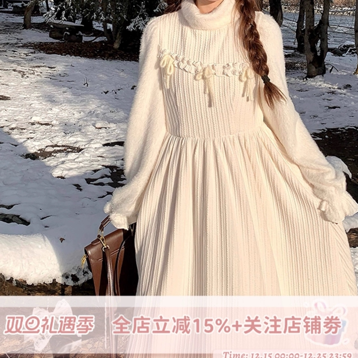 首页> 女装> sinsingirl 尤莉花园 米白色厚款堆堆领针织拼接连衣裙秋冬季裙子