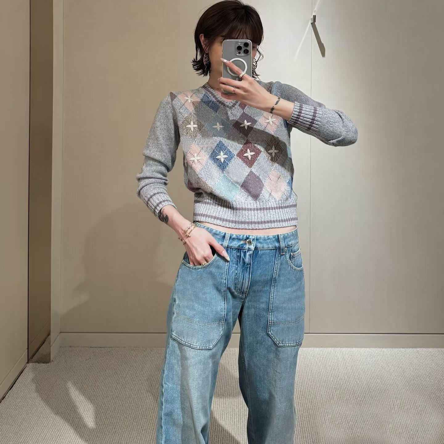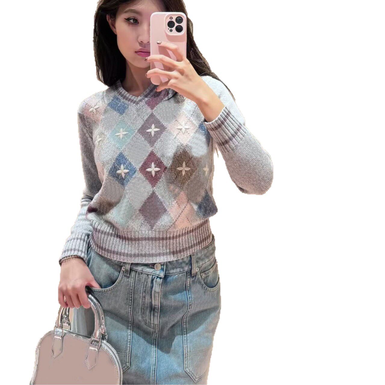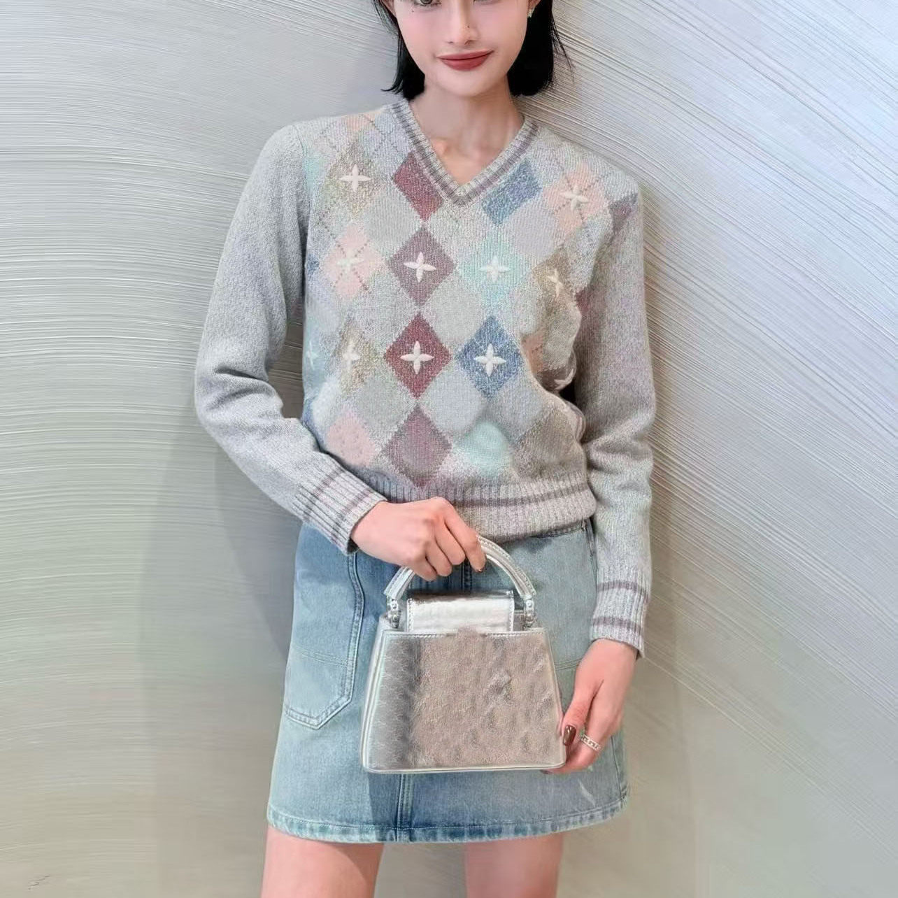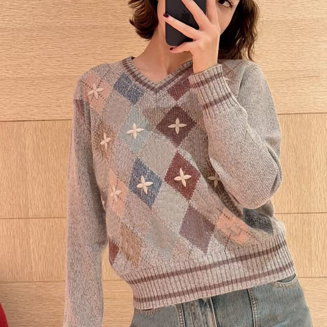 南油高定L家2025秋冬新款彩色菱格纹字母刺绣修身显瘦V领针织上衣