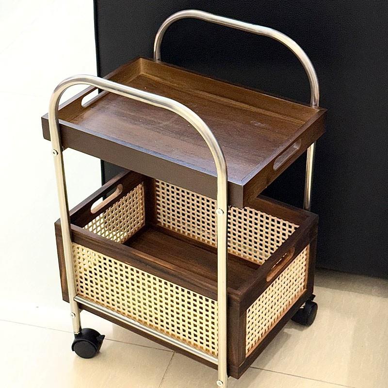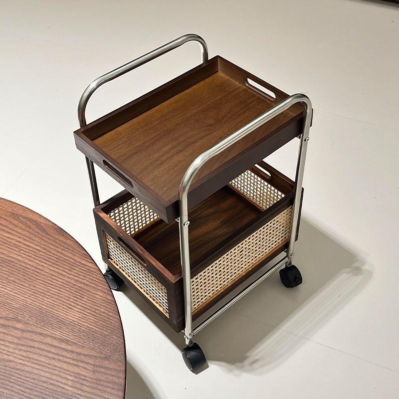 中古实木边几可移动小推车沙发边柜置物柜客厅茶水架高级藤编侘寂
