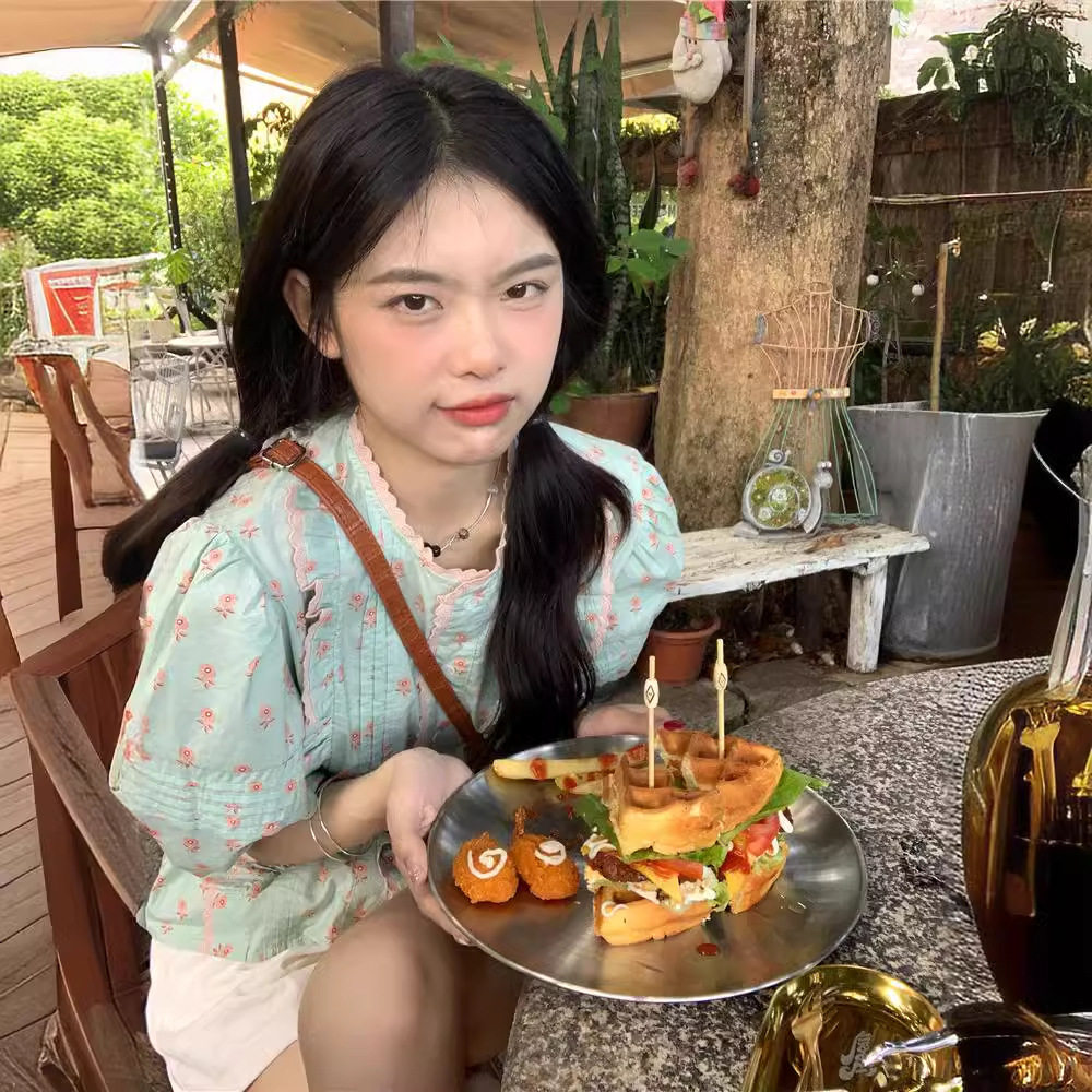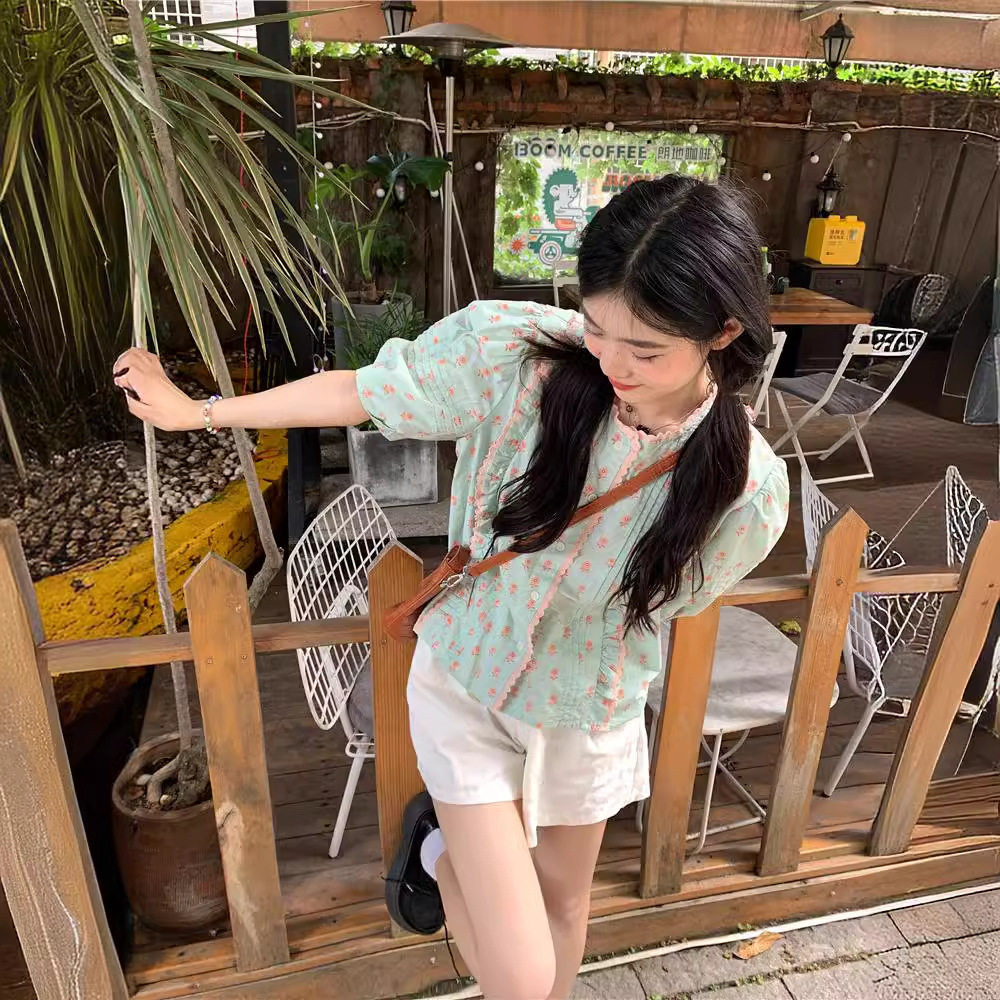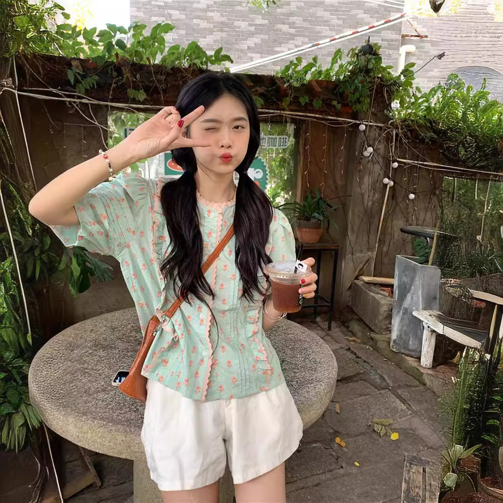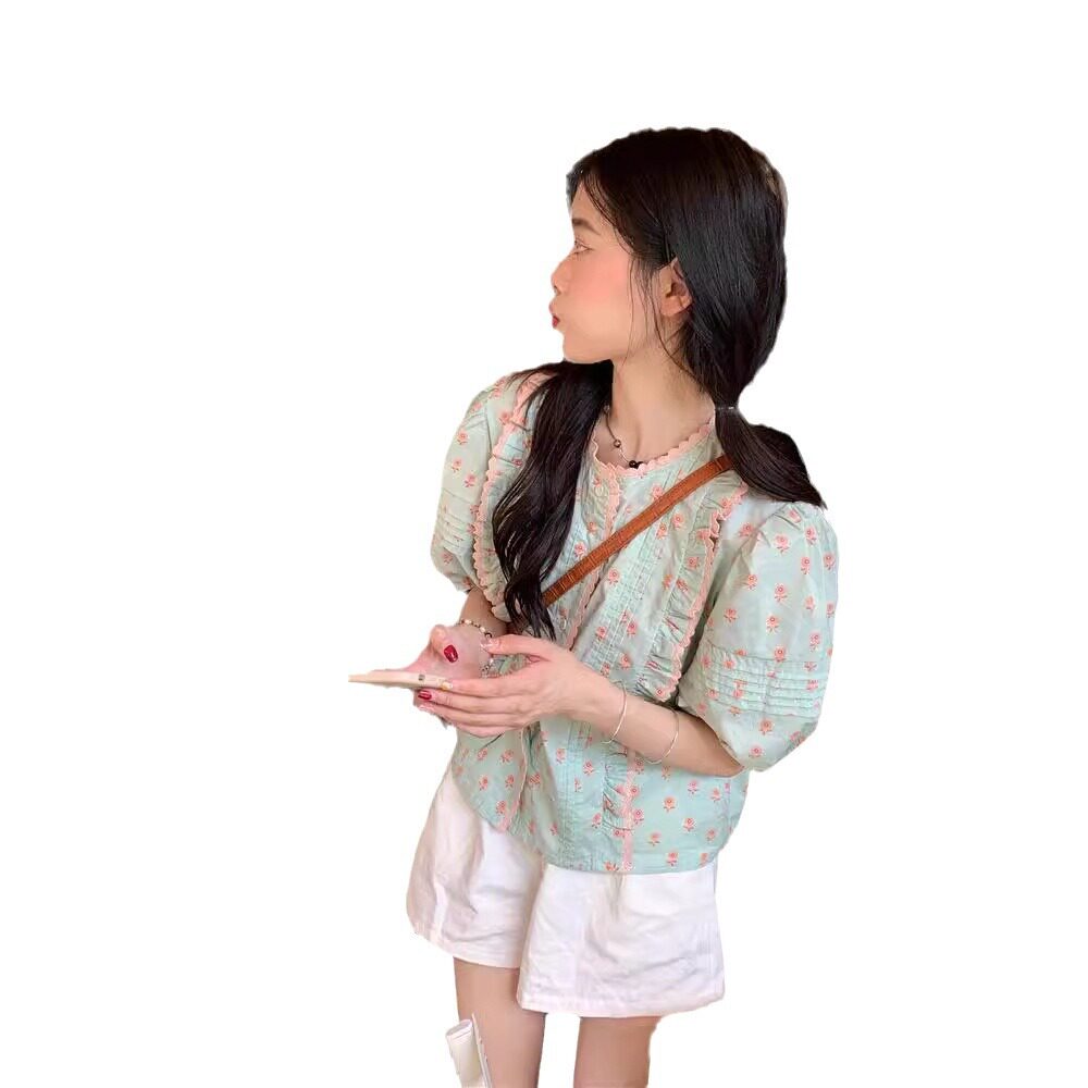 实拍2024夏季新款韩版 法式夏季小碎花甜美木耳边泡泡袖别致衬衫~