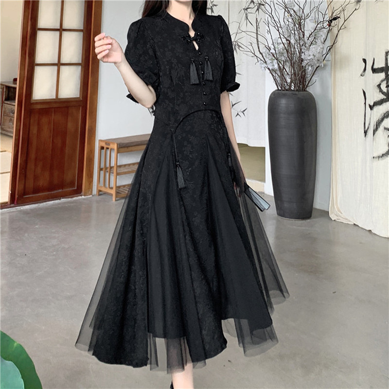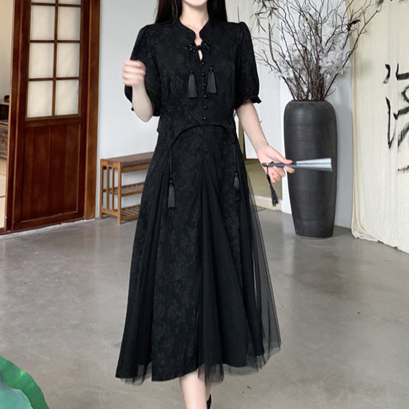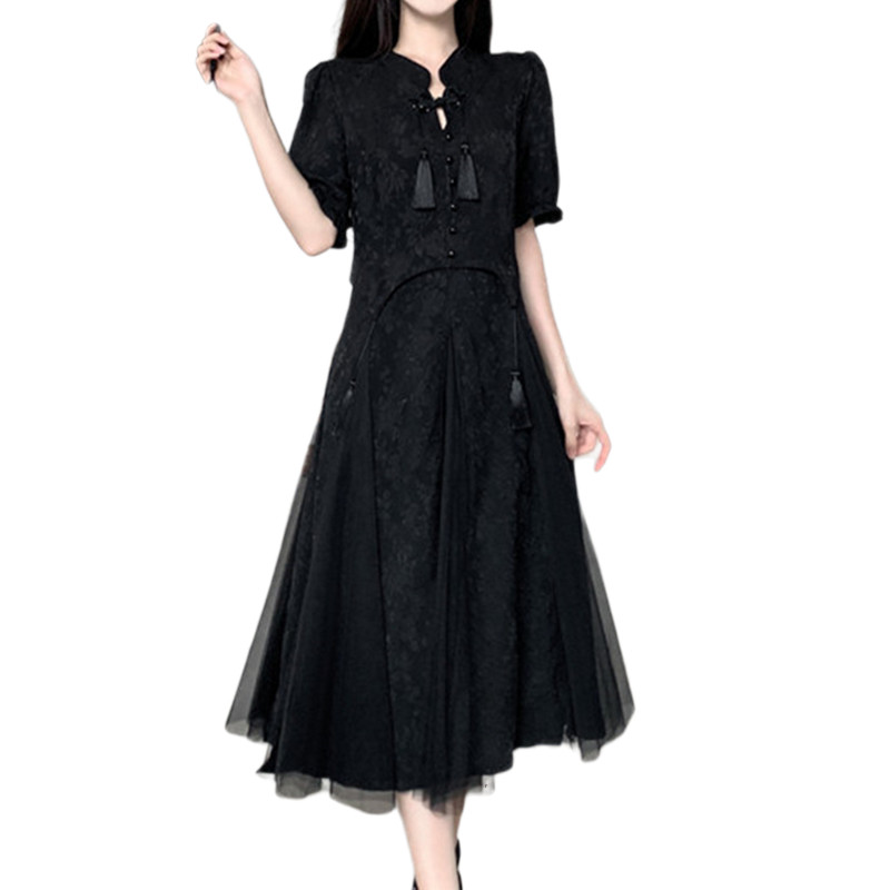 大码国风设计感流苏网纱拼接连衣裙夏季胖mm改良旗袍赫本风小黑裙