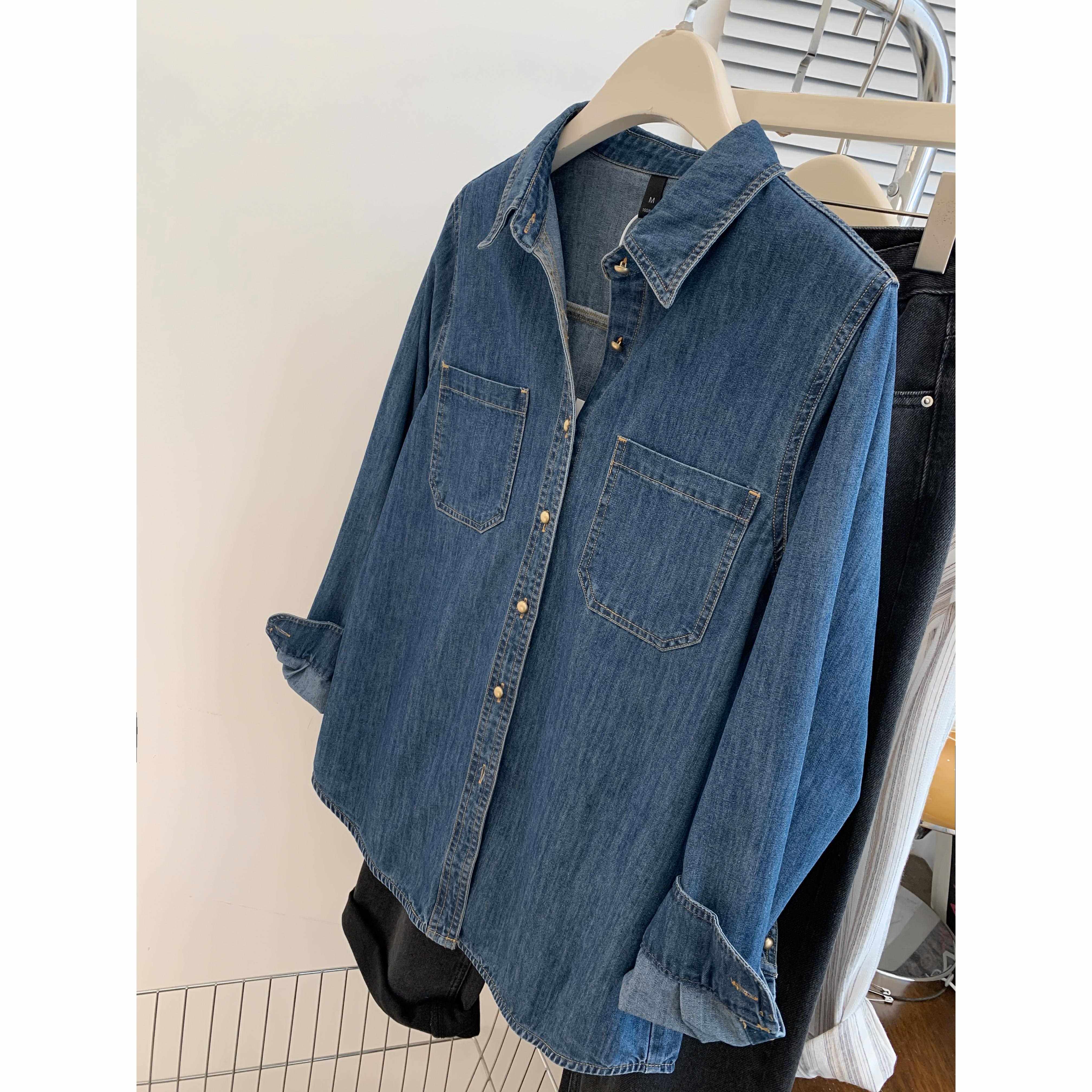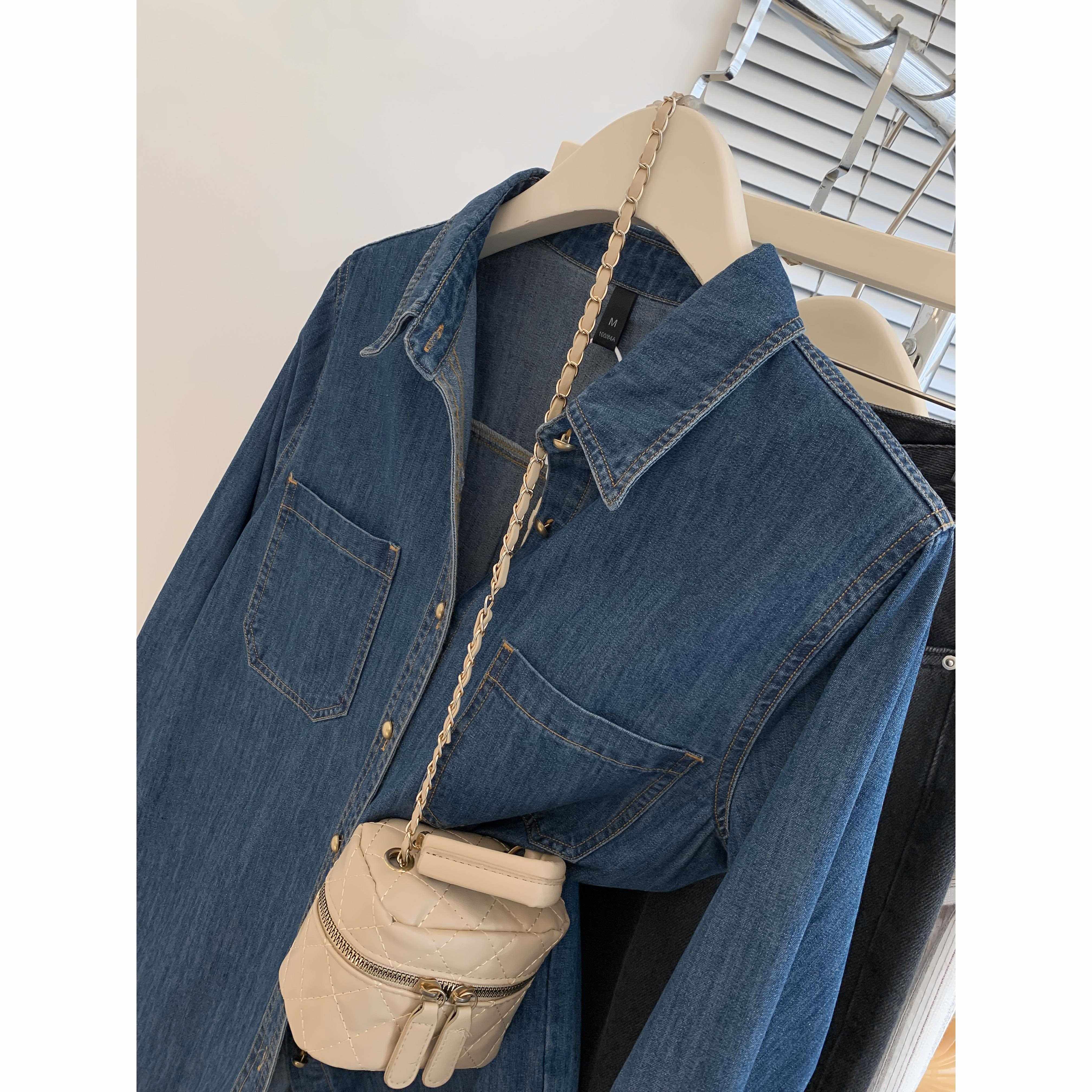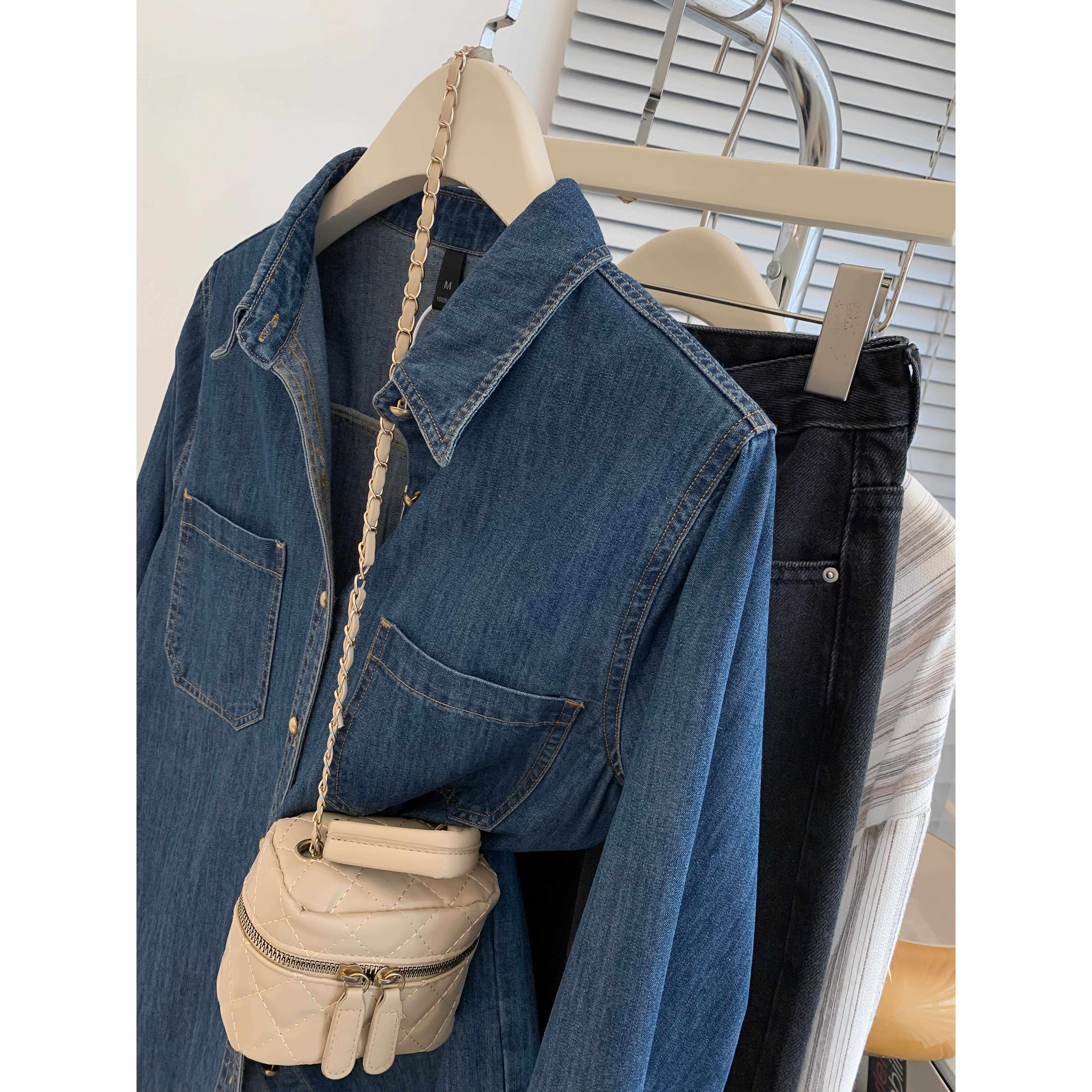 蓝色牛仔衬衫外套女春秋季小个子设计感长袖衬衣2024早春新款上衣