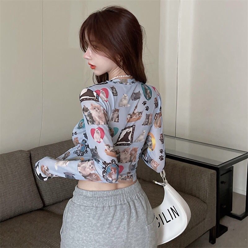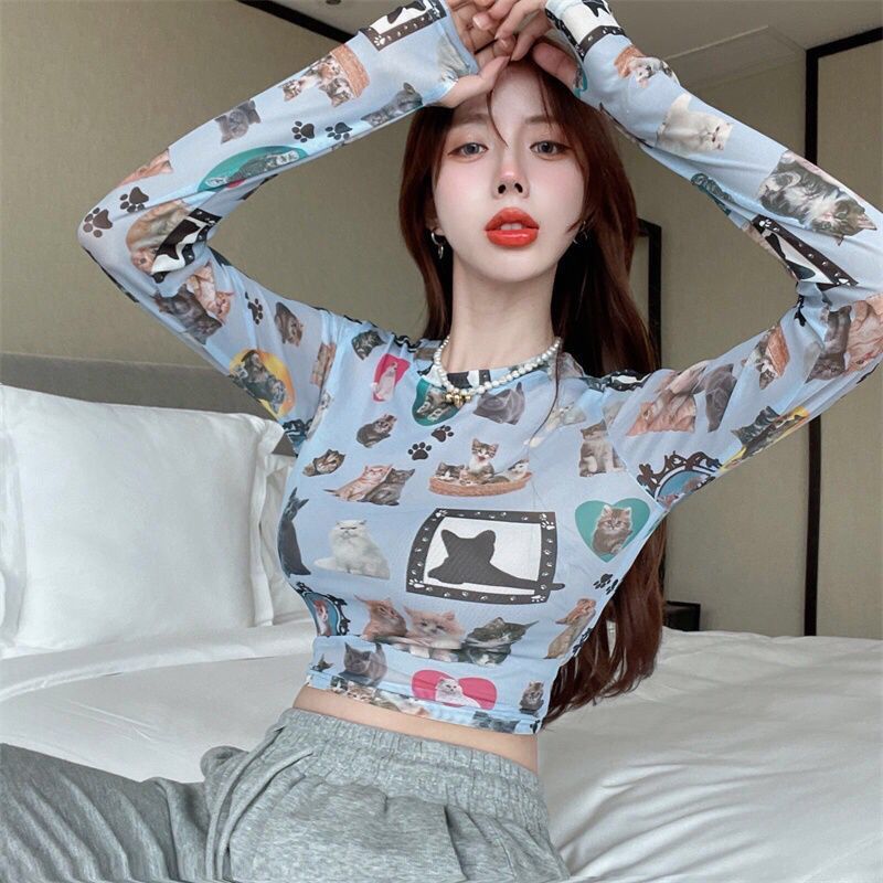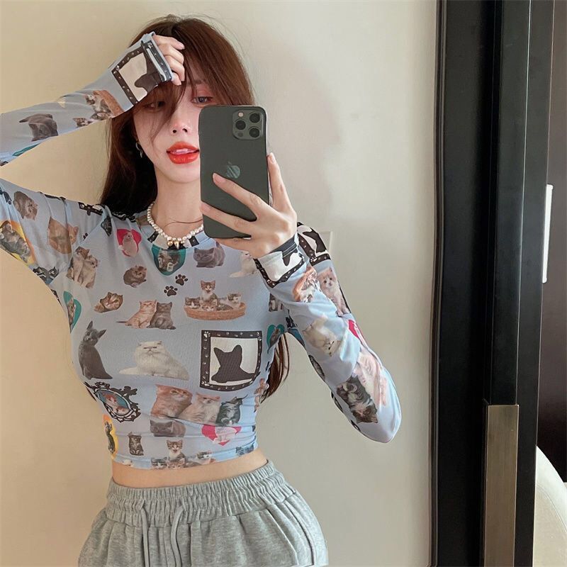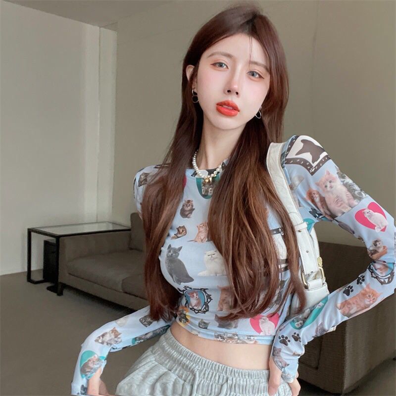 2024春秋季扎染修身打底衫短款长袖t恤女圆领显瘦收腰内搭上衣潮