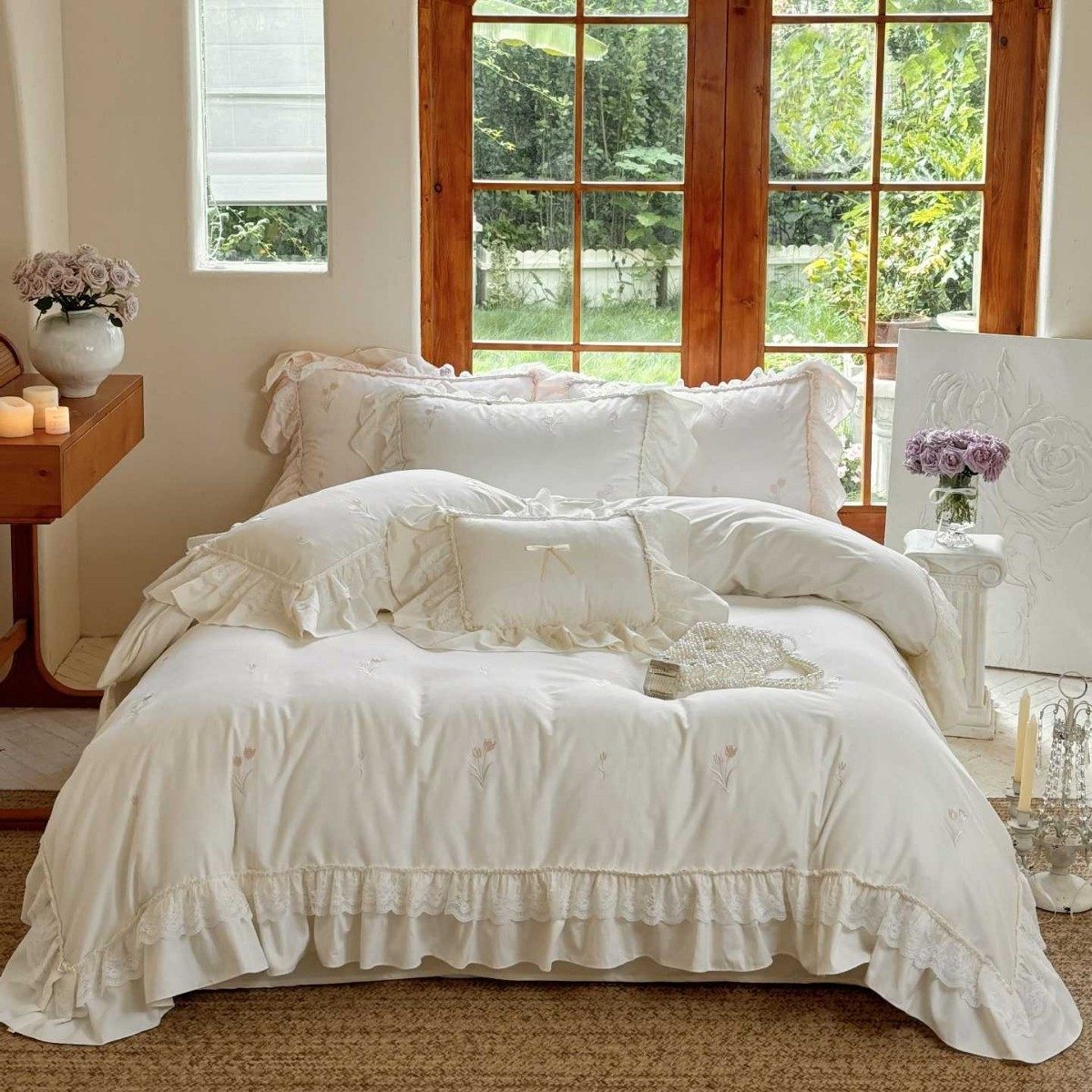少女心120支全棉磨毛床花卉刺绣加厚被套雪纺百褶花边四件套品