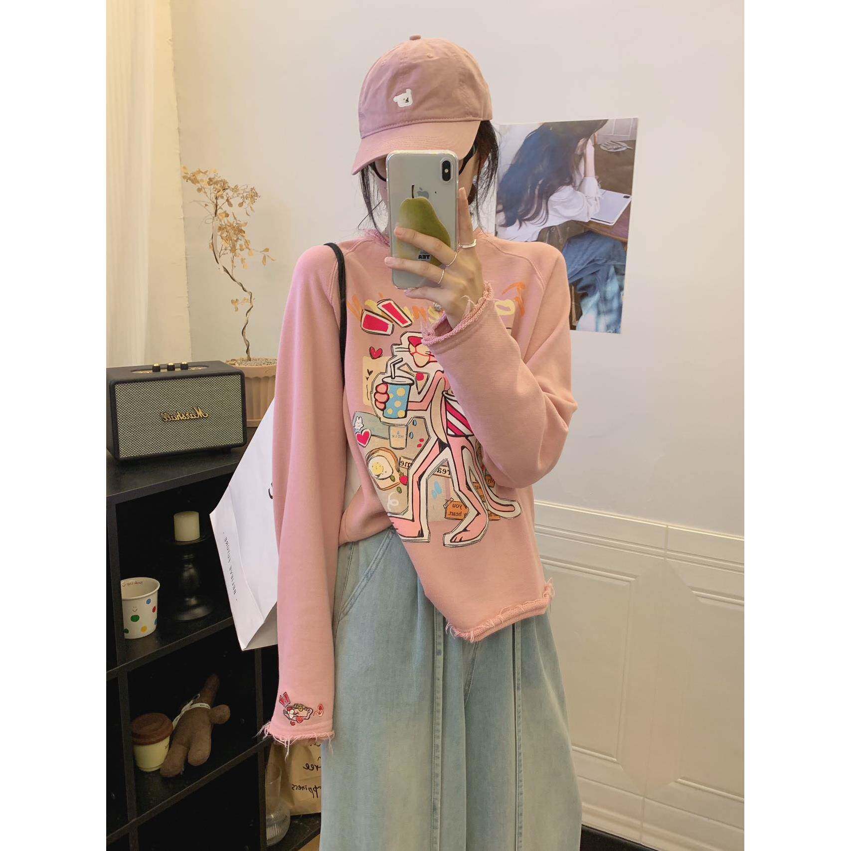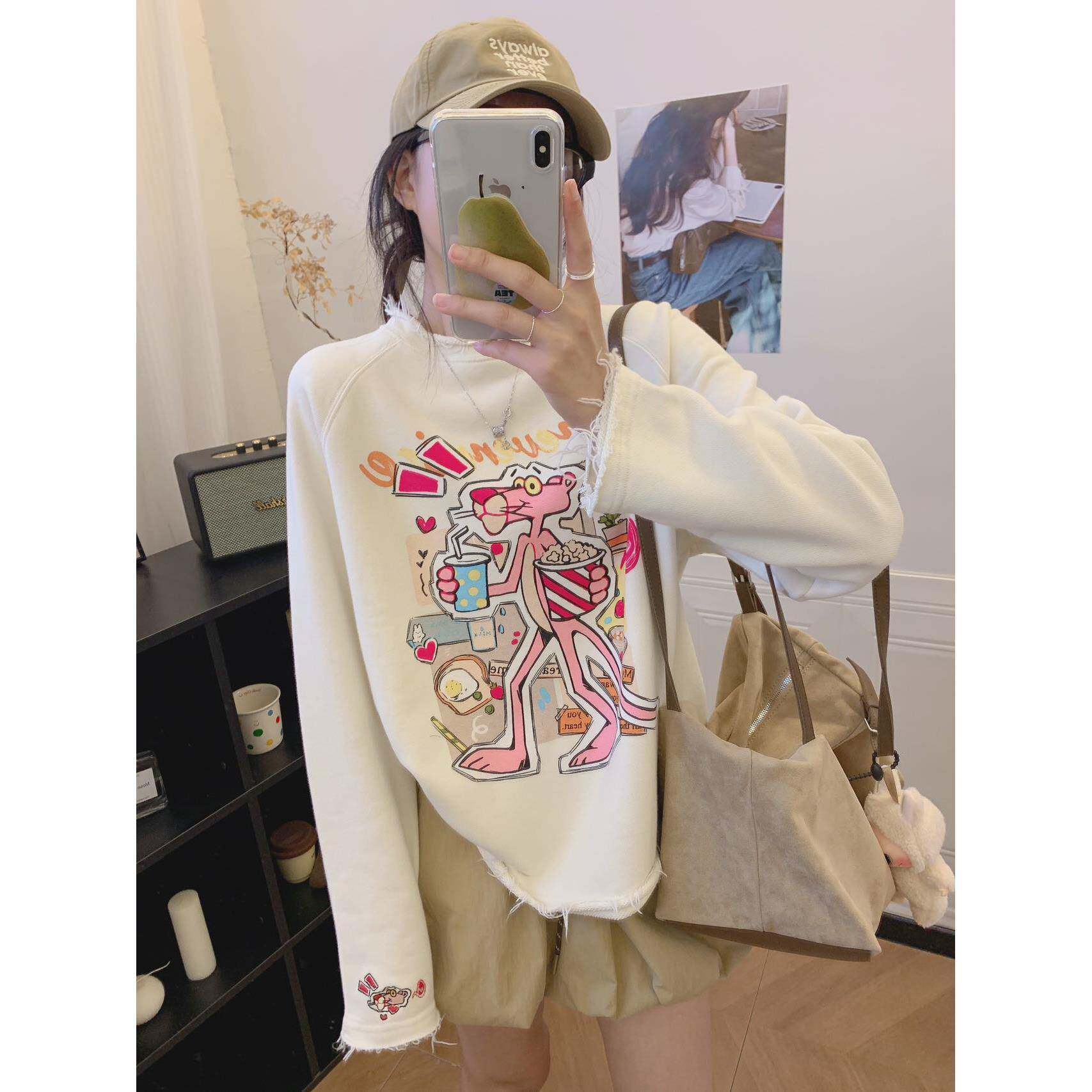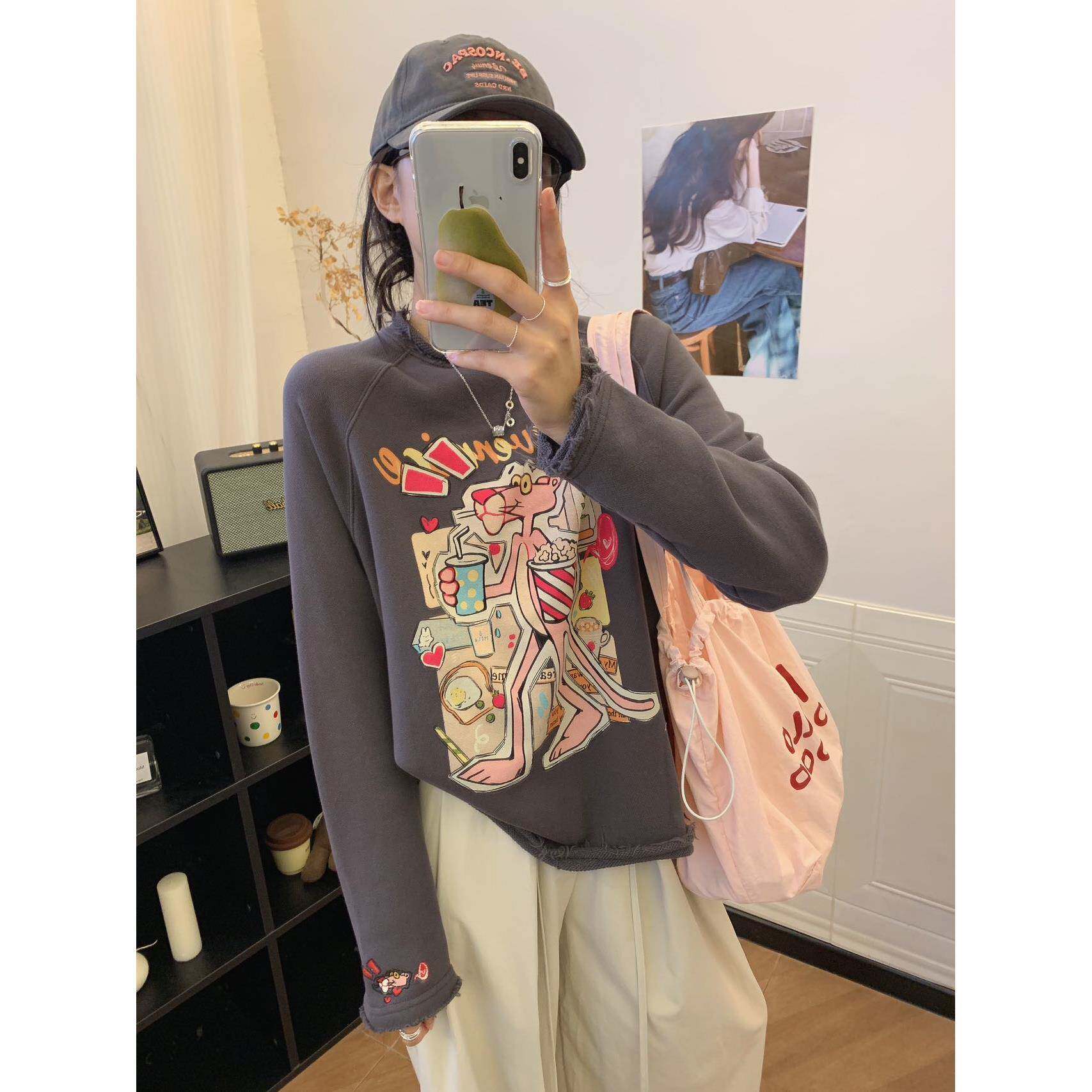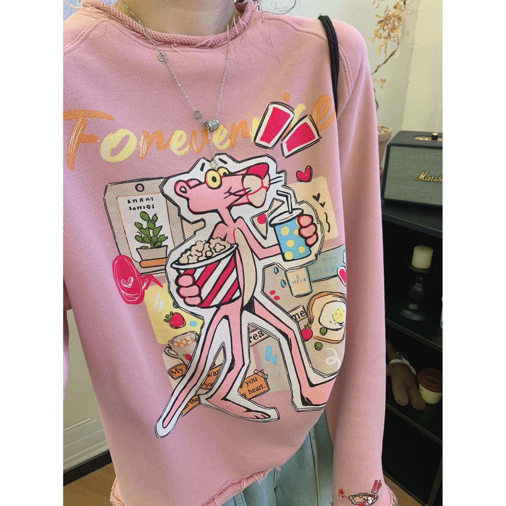 冬季金喜纸袋家350纯棉毛圈「洋气卷边粉豹」无感水印卫衣女2575