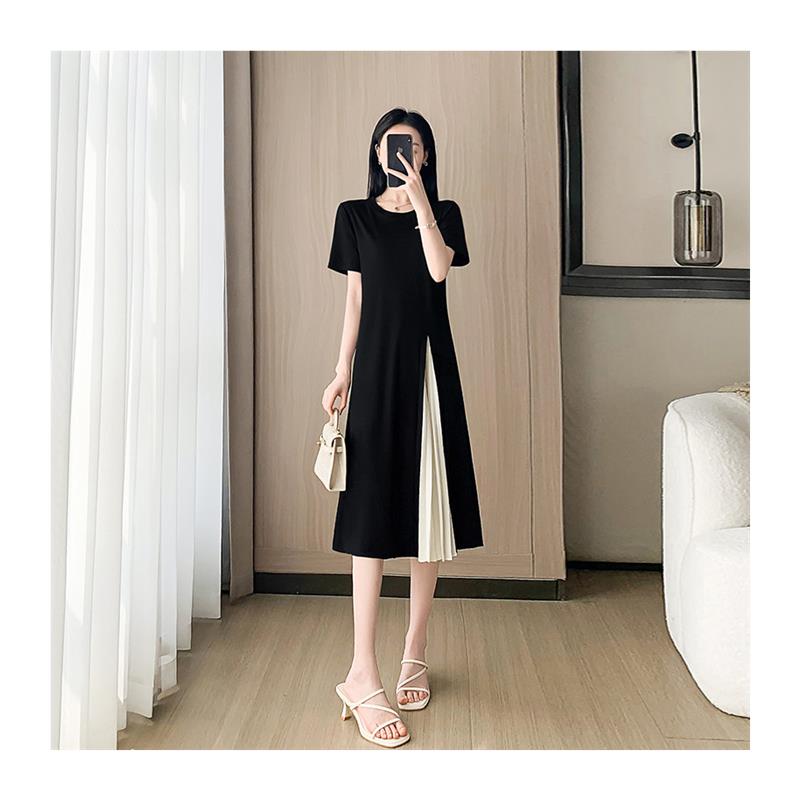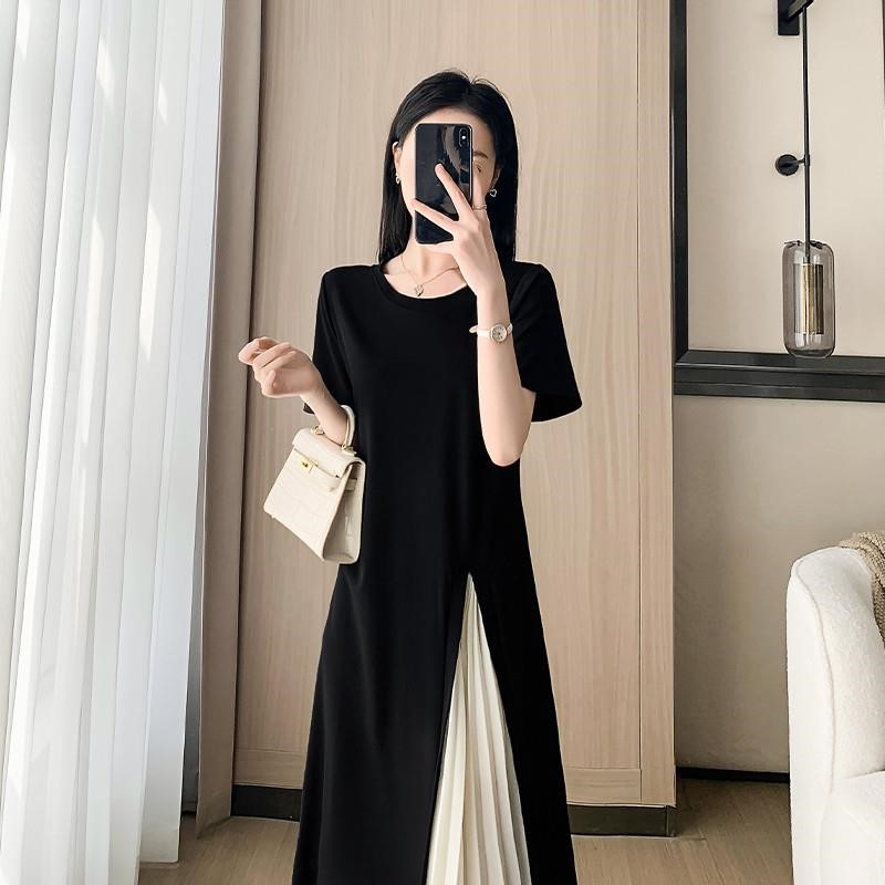 时尚拼接黑色连衣裙女夏季2025新款轻奢高级感气质中长款a字裙子