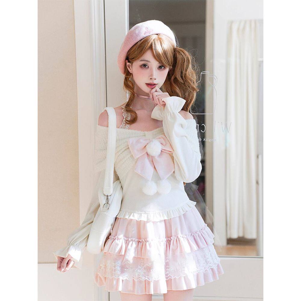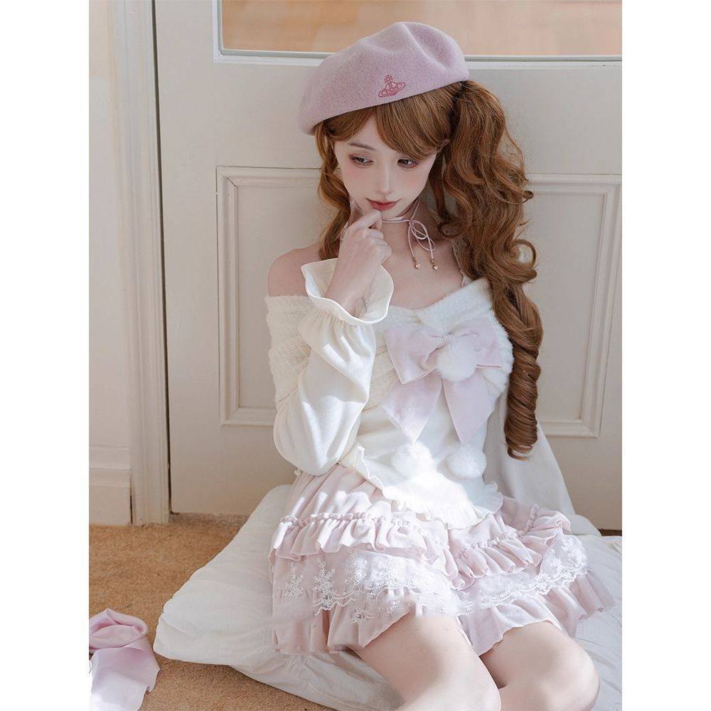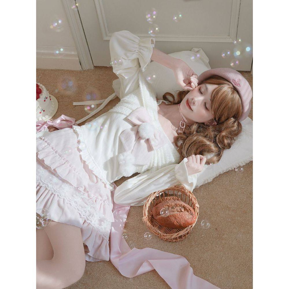 绘莉莎冬日 奈奈风清楚系灯笼袖秋冬两穿蝴蝶结上衣芭蕾半裙套装