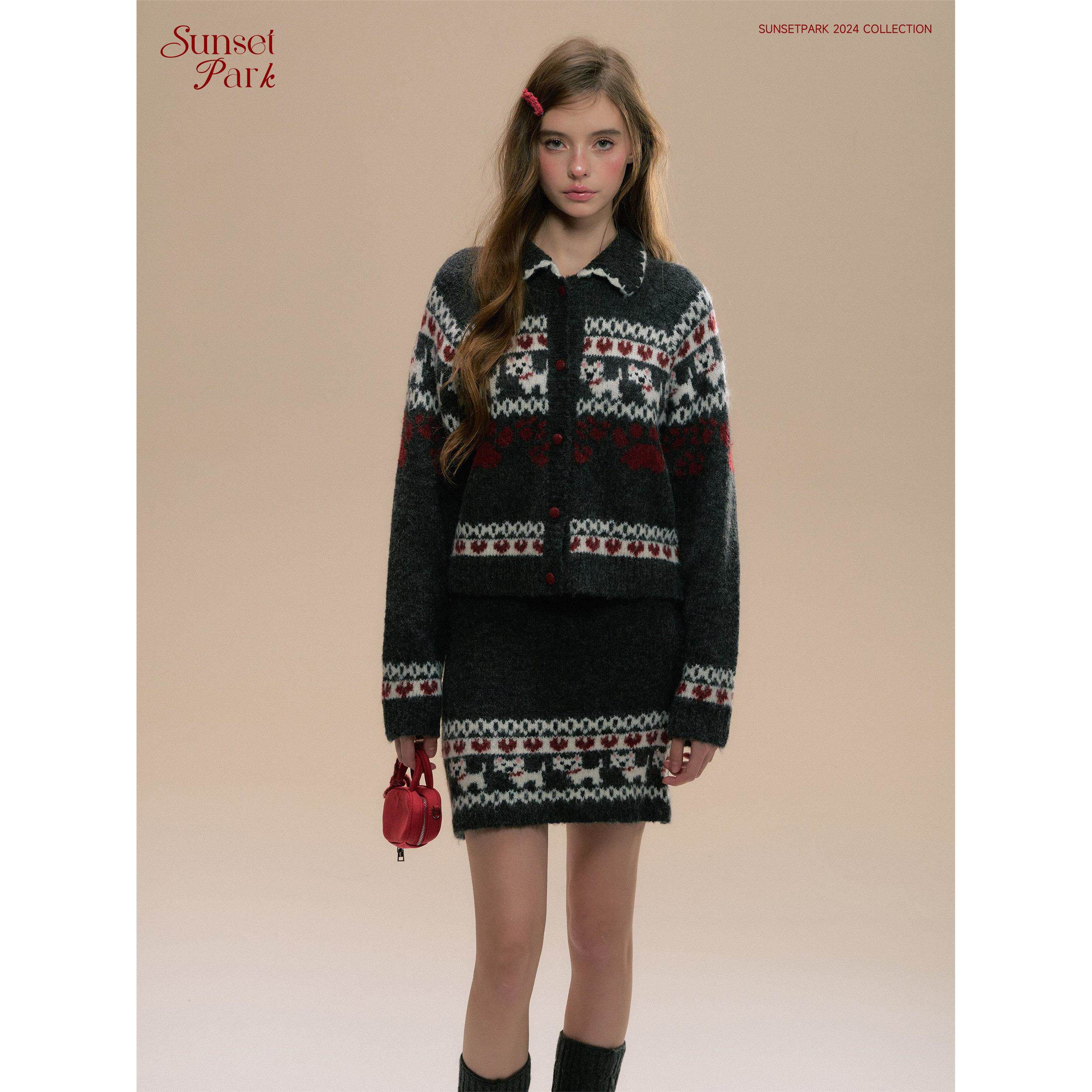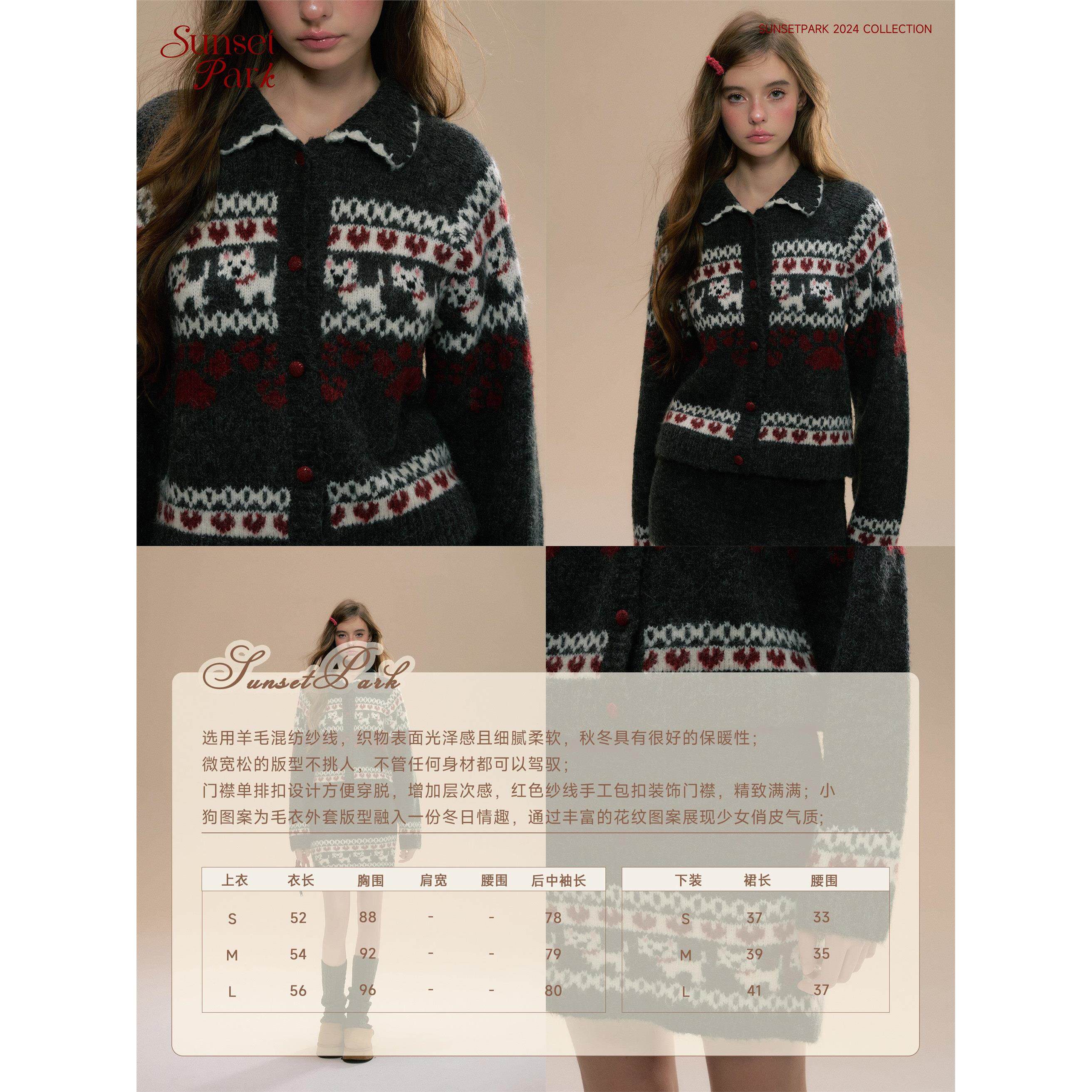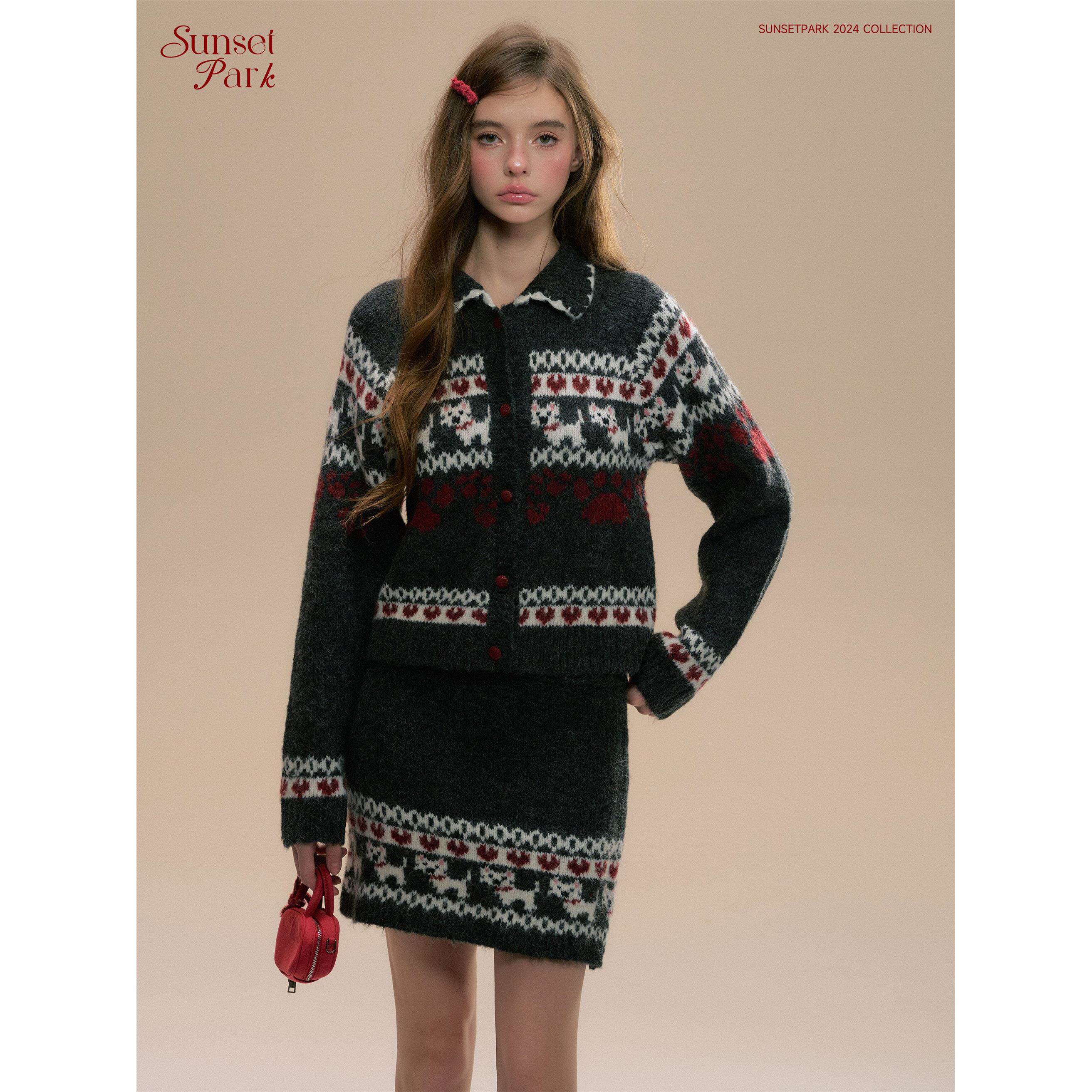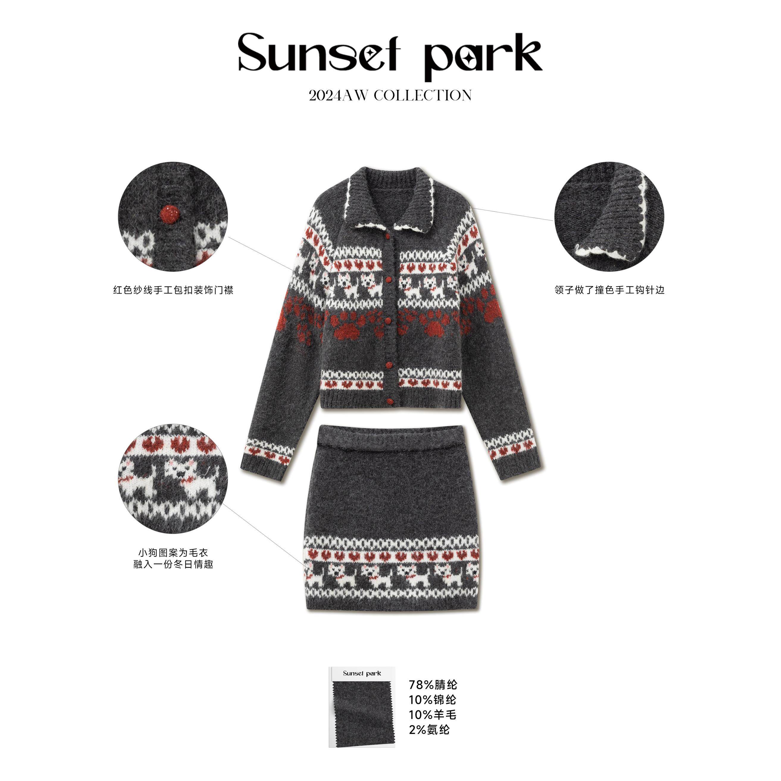 SunsetPark日落公园 "小狗费尔岛"深灰色覆古针织毛衣外套半裙春