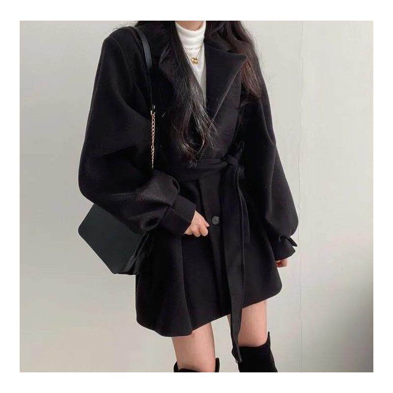 毛呢外套女冬小个子中长版西装领加厚系带显瘦大衣灯笼袖加棉风衣