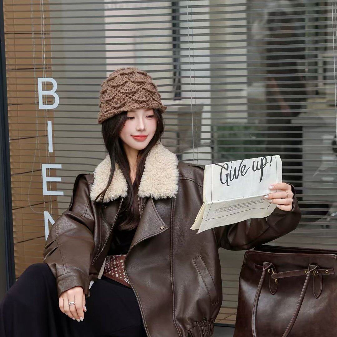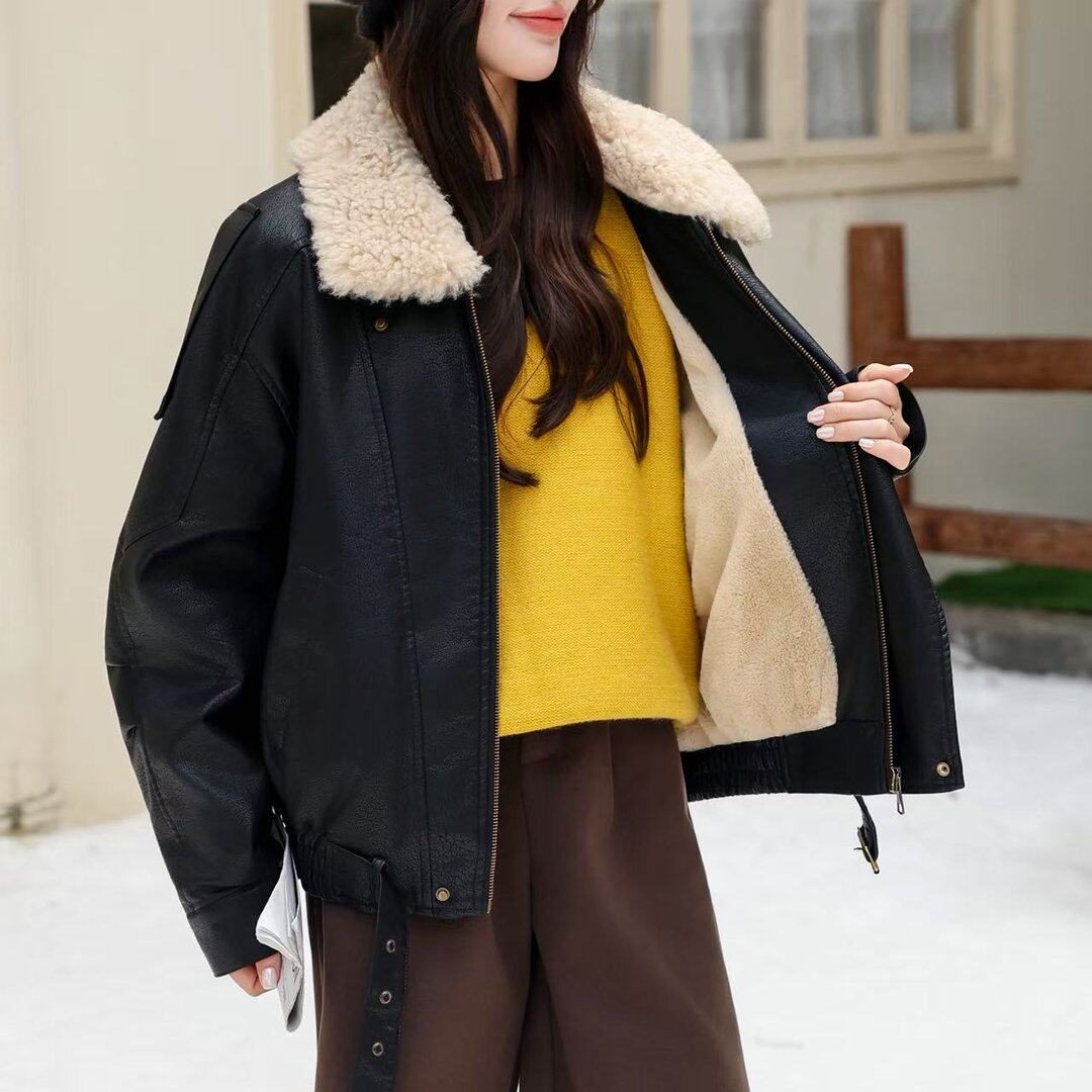 实拍实价酷飒羊羔绒毛领蛋白皮衣外套女加厚加绒美式机车宽松夹克