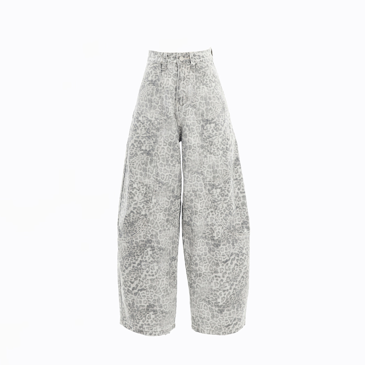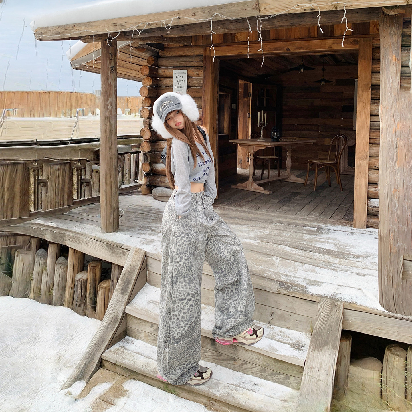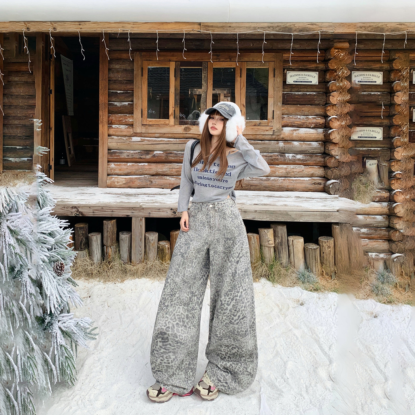 2026春季新款美式高腰豹纹牛仔长裤女宽松阔腿弯刀裤设计感拖地裤