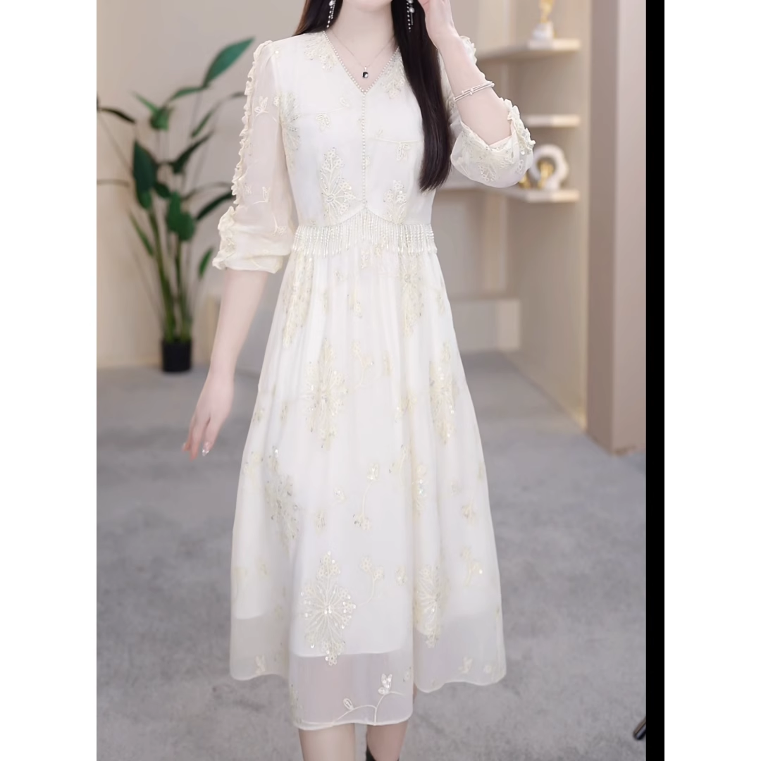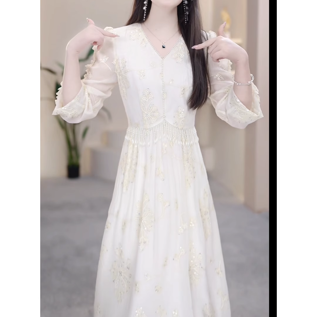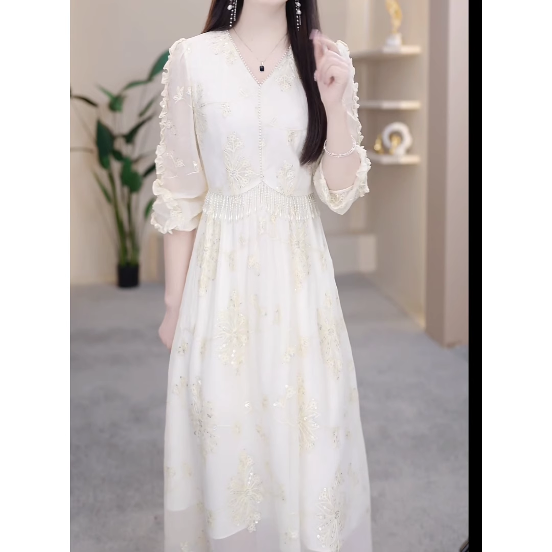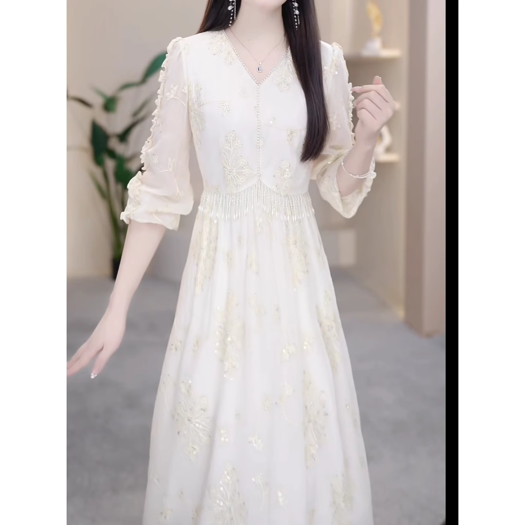 气质高端时尚刺绣亮片V领洋装女2025春季新款洋派减龄中长裙子