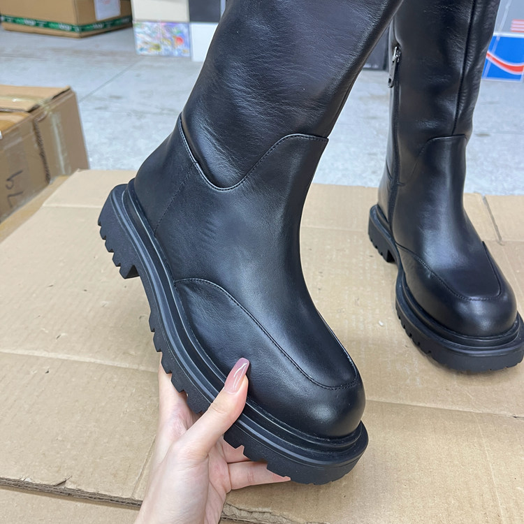 外贸原单女靴里外全真皮新款时尚百搭圆头纯色厚底粗跟套筒长筒靴